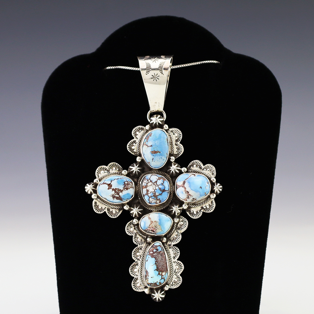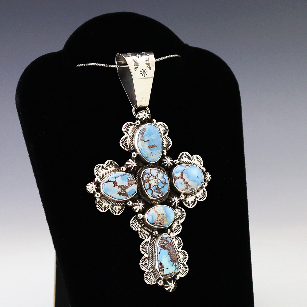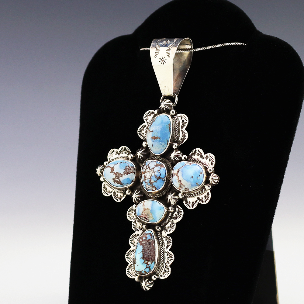 The Navajos began working with silver in the 19th century, and began making things like buckles, bridles, buttons, rings, canteens, hollow beads, earrings, crescent-shaped pendants (called “najas”), bracelets, crosses, powder chargers, tobacco canteens, and conchos (for belts). Their silversmithing skills has evolved and changed throughout the years, and in about 1880 Navajo silversmiths started to set turquoise in their silver work. Traditionally, Navajo artists worked with jewelry techniques like repousee and stamp work, but today they explored in other Native American jewelry making techniques like Zuni inlay work and Hopi overlay work.
