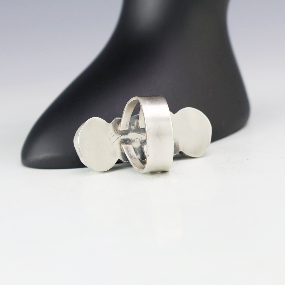 Amazing inlay work! Zuni jewelry makers, Nancy and Sheldon Westika created this magnificent ring. Made out of sterling silver and inlaid with Kingman Turquoise and Jet. Zuni artists are known for their lapidary work. The Westikas have been making jewelry since the 1970’s and they are known for their fine...