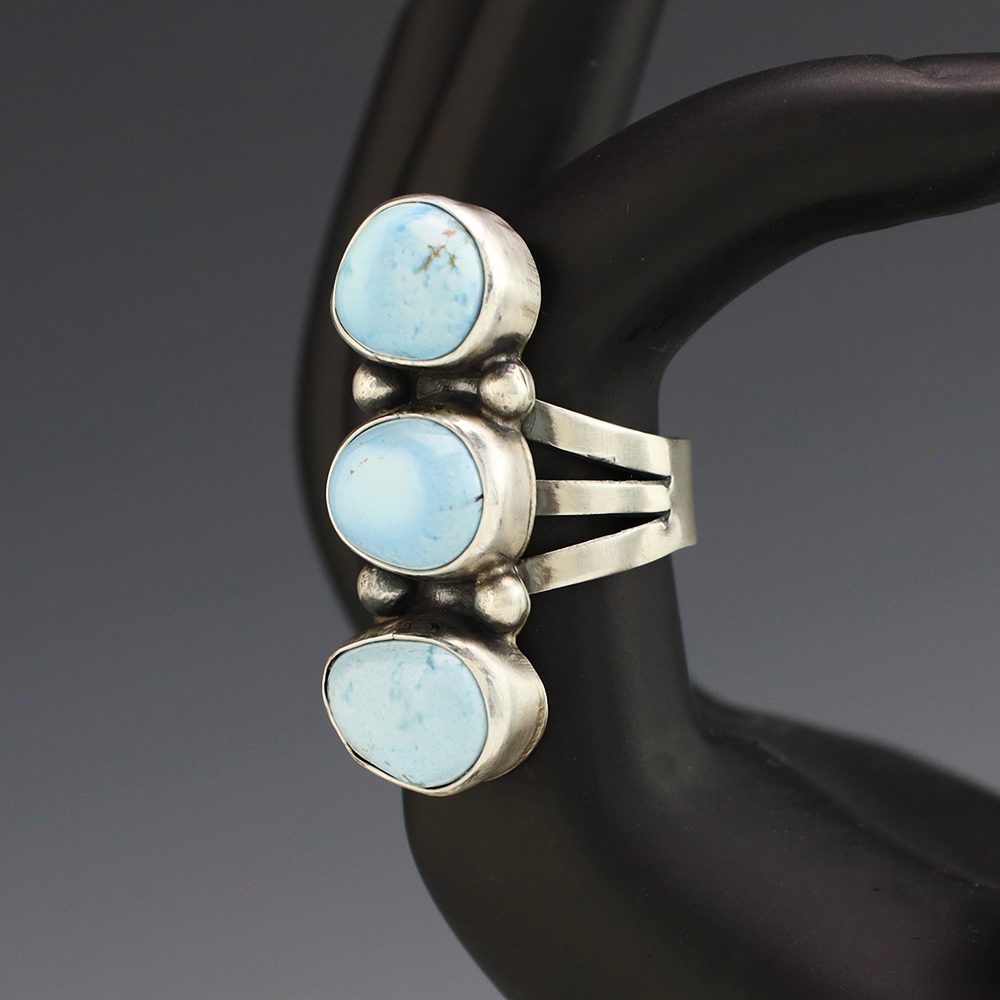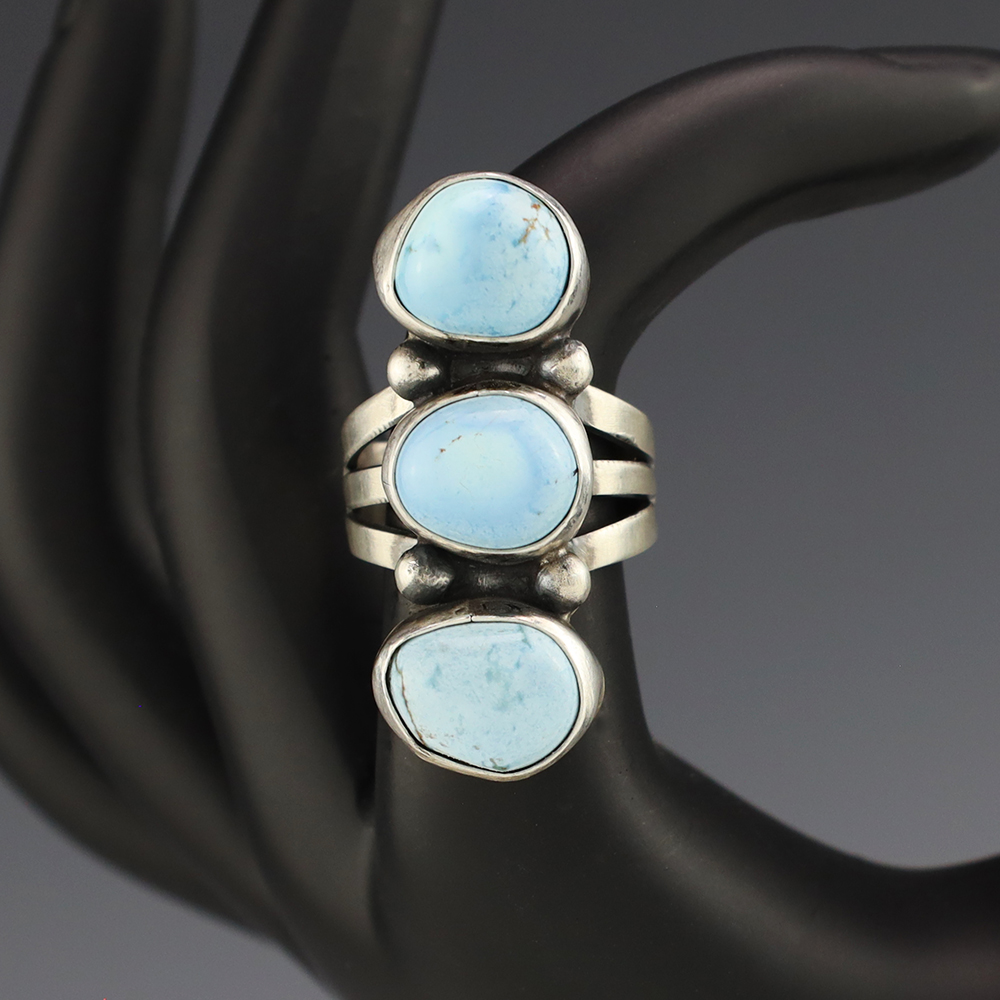 This ring is a great representation of hand made Navajo jewelry and will make a statement on your hand. Beautiful pieces of Golden Hills Turquoise are set into a sterling silver setting. Handmade by Navajo artist Danny Henio. Weighs 10 grams. Size 7. Signed.