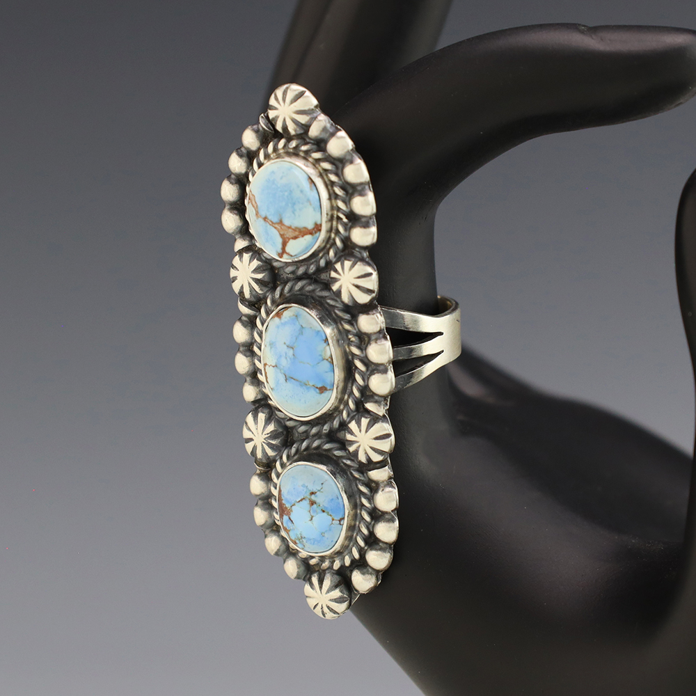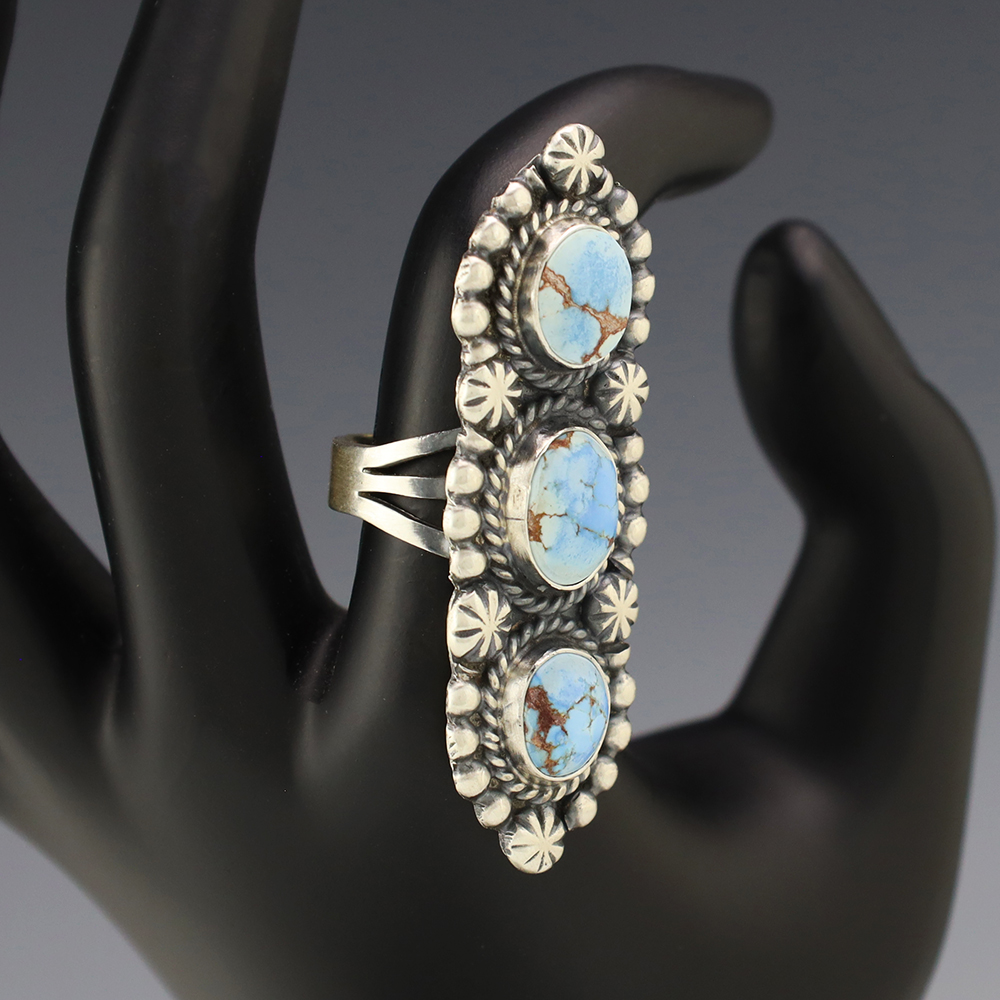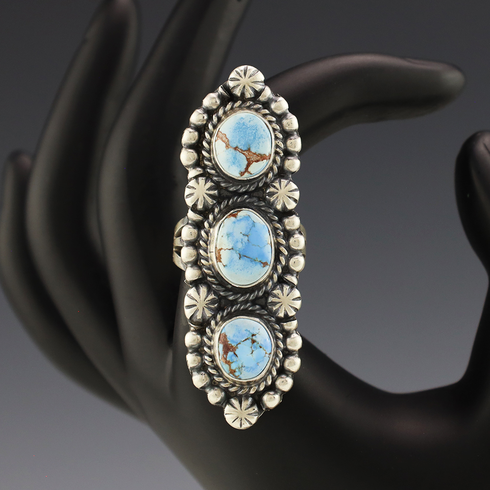 This ring is a great representation of hand made Navajo jewelry and will make a statement on your hand. Beautiful pieces of Golden Hills Turquoise are set into a sterling silver setting. Handmade by Navajo artist Jeff James Jr. Weighs 14 grams. Size 7 3/4.