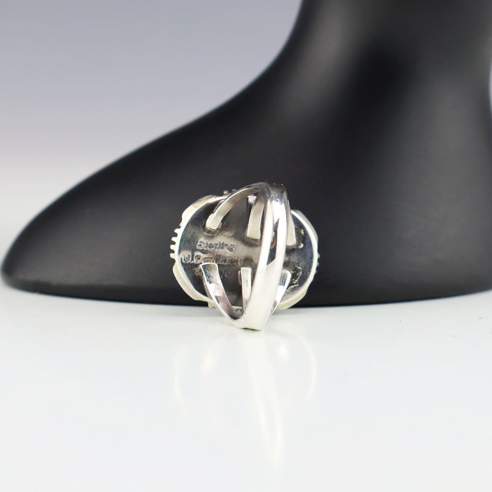 Zuni jewelry makers, Nancy and Sheldon Westika hand crafted this magnificent ring. Made out of sterling silver and inlaid with Kingman Turquoise and Jet. Zuni artists are known for their lapidary work. The Westikas have been making jewelry since the 1970’s and they are known for their fine inlay work. ...