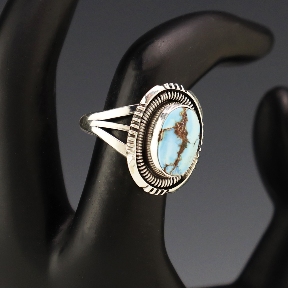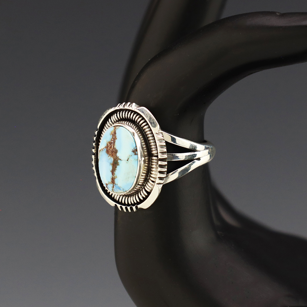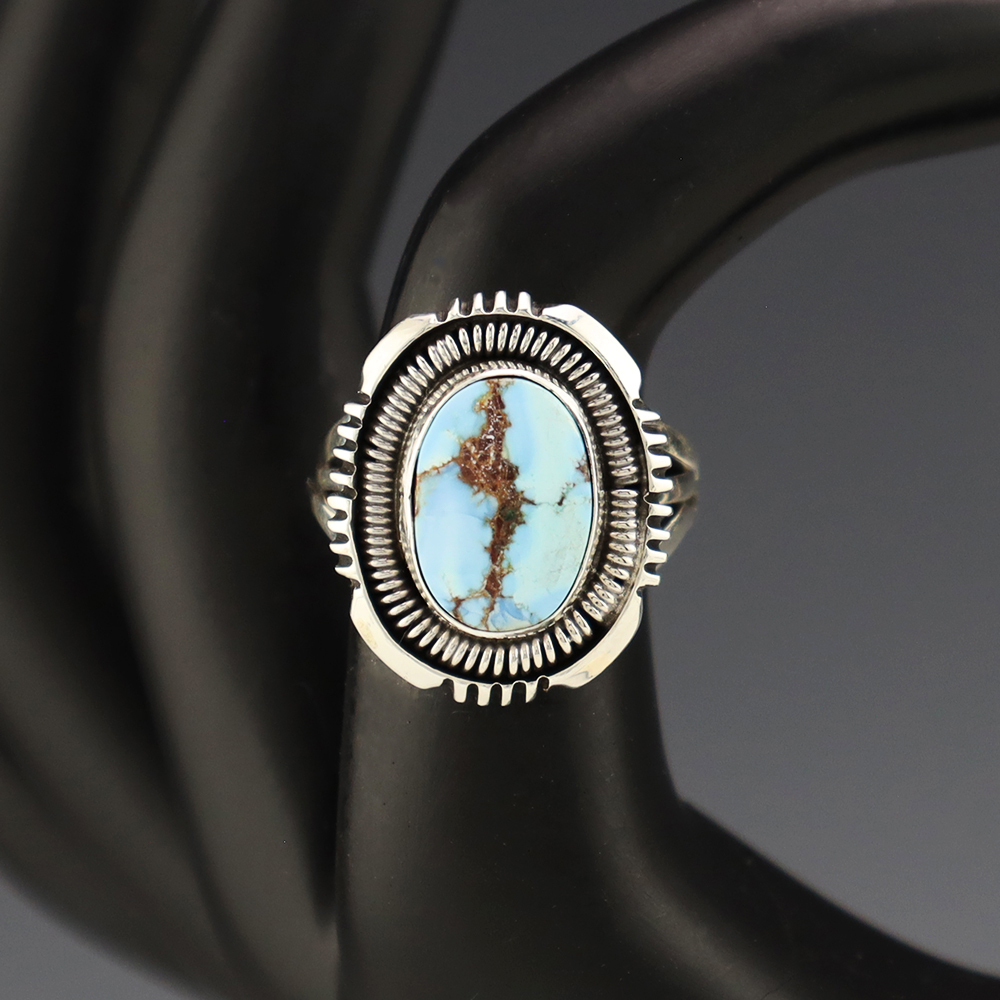 This ring is a great representation of hand made Navajo jewelry and will make a statement on your hand. A beautiful piece of Golden Hills Turquoise is set into a sterling silver setting. Handmade by Navajo artist Will Denetdale. Weighs 6 grams. Size 6 3/4. Signed