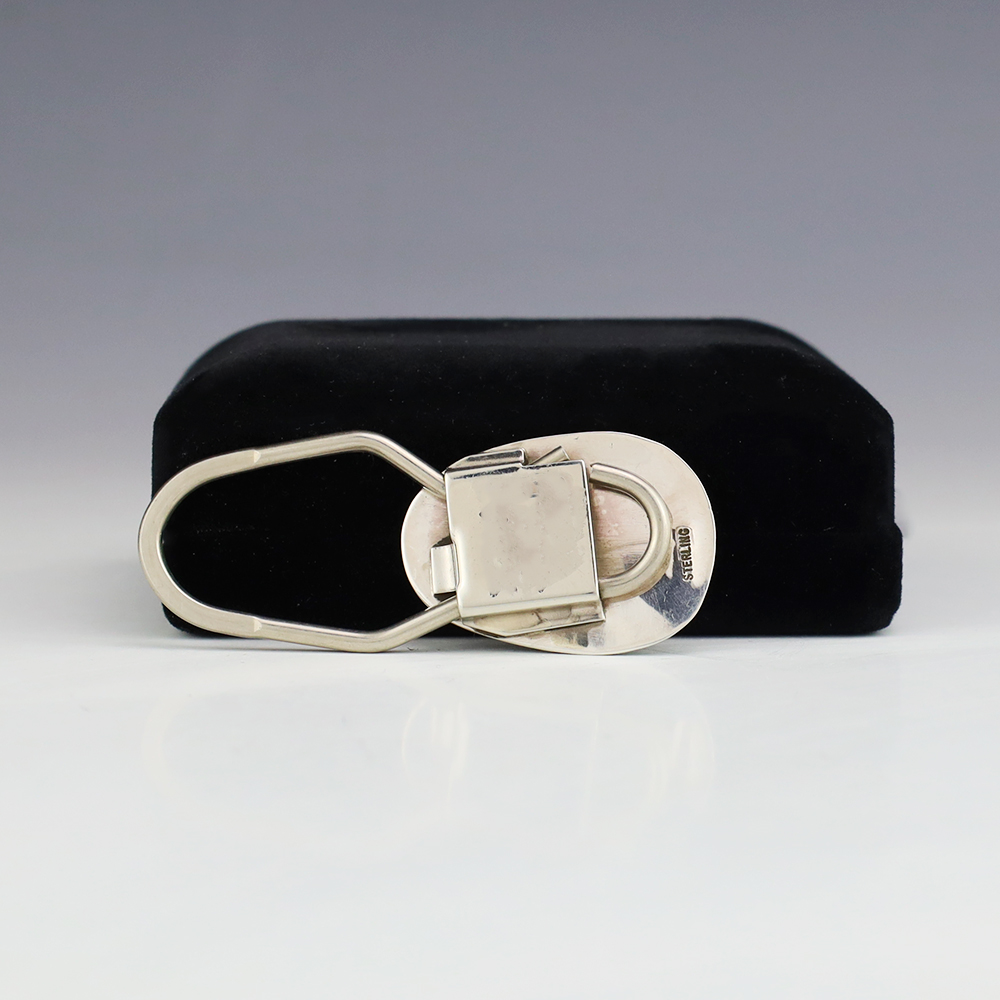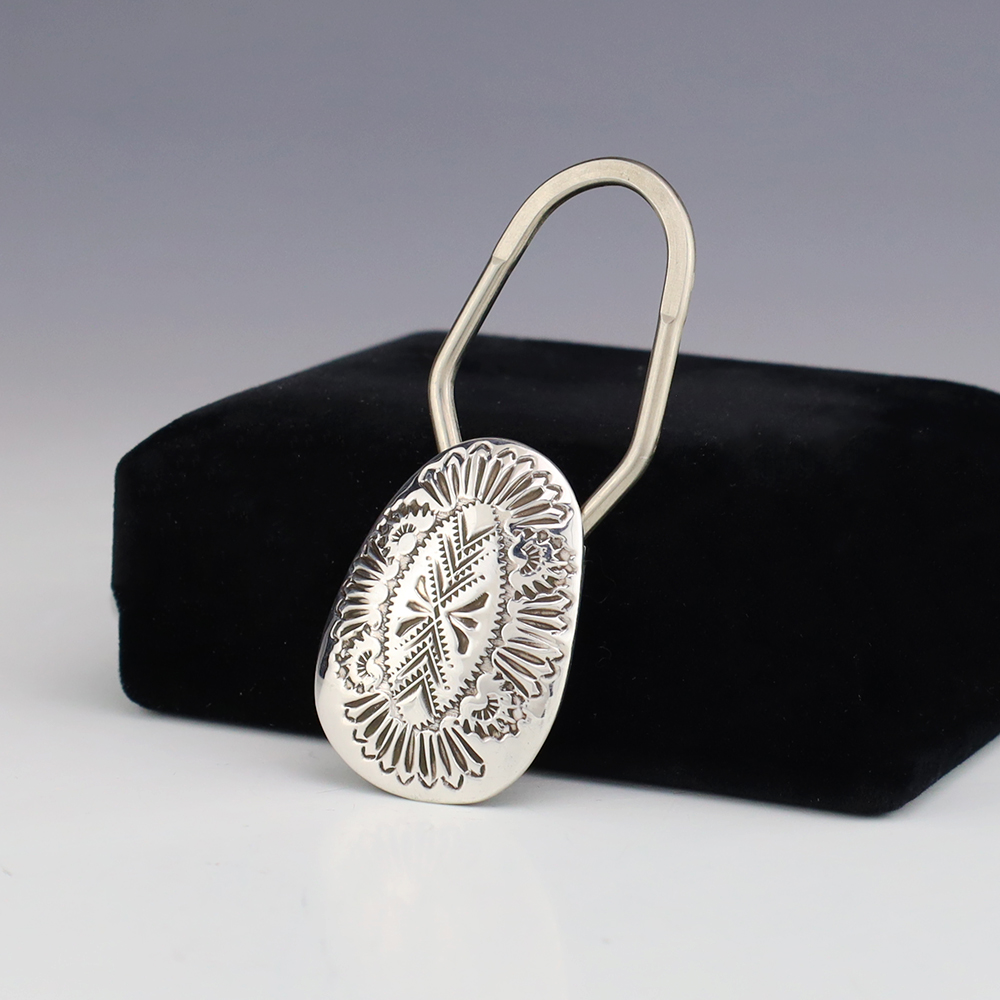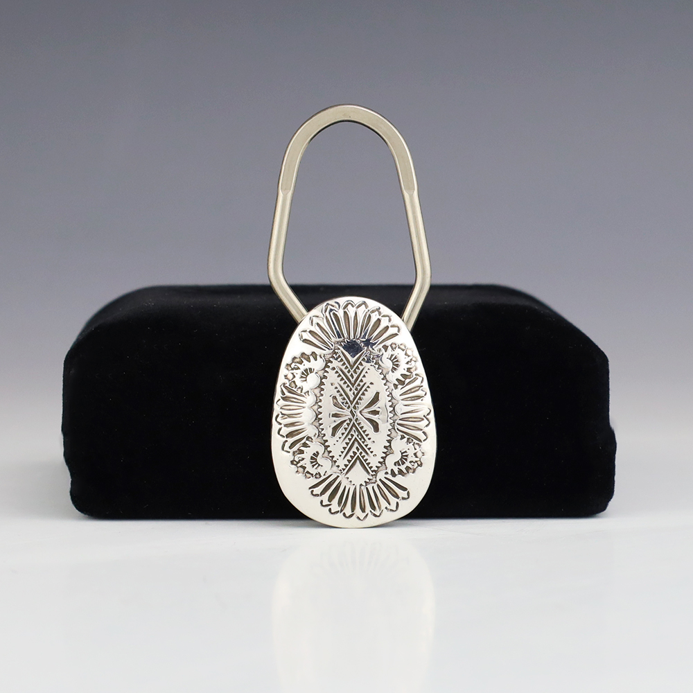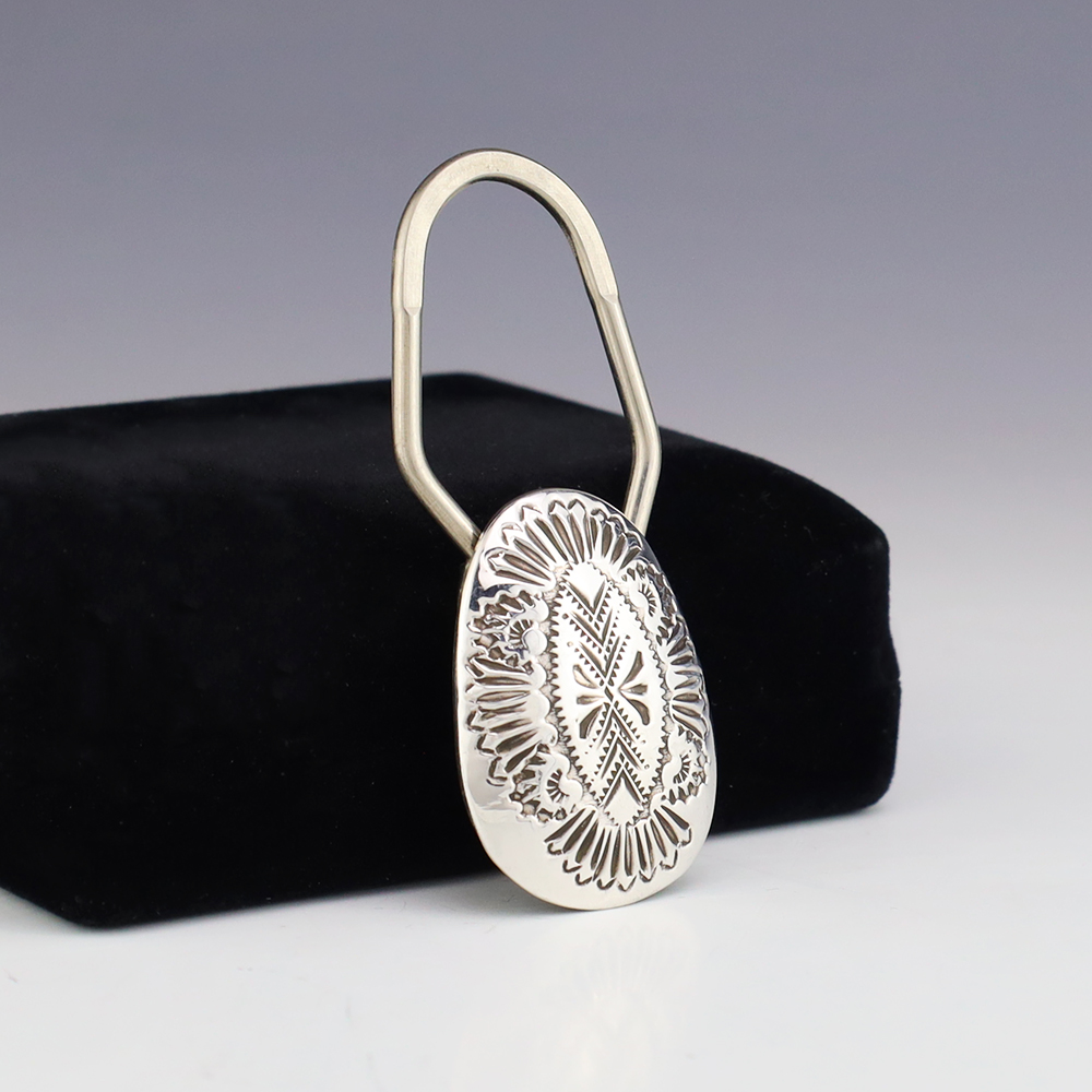 Navajo silversmith, Shirley Skeets made this stellar key ring. Sterling silver with a great hand stamped design . Has a nickle clasp for stronger grip and durability. Weighs 10 grams.