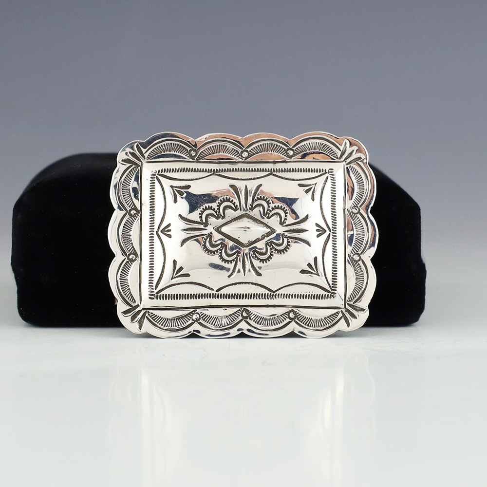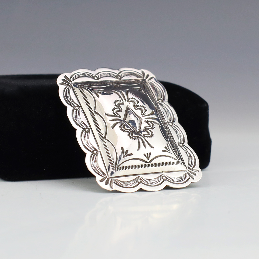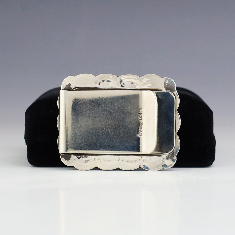 Take this money clip home for a wonderfully hand crafted accessory that show cases the craftsmanship of Navajo silversmithing. Sterling silver with a traditional hand stamped design, by Arnold Blackgoat. Backed with a nickle clip for stronger grip and durability. Weighs 20 grams. Signed