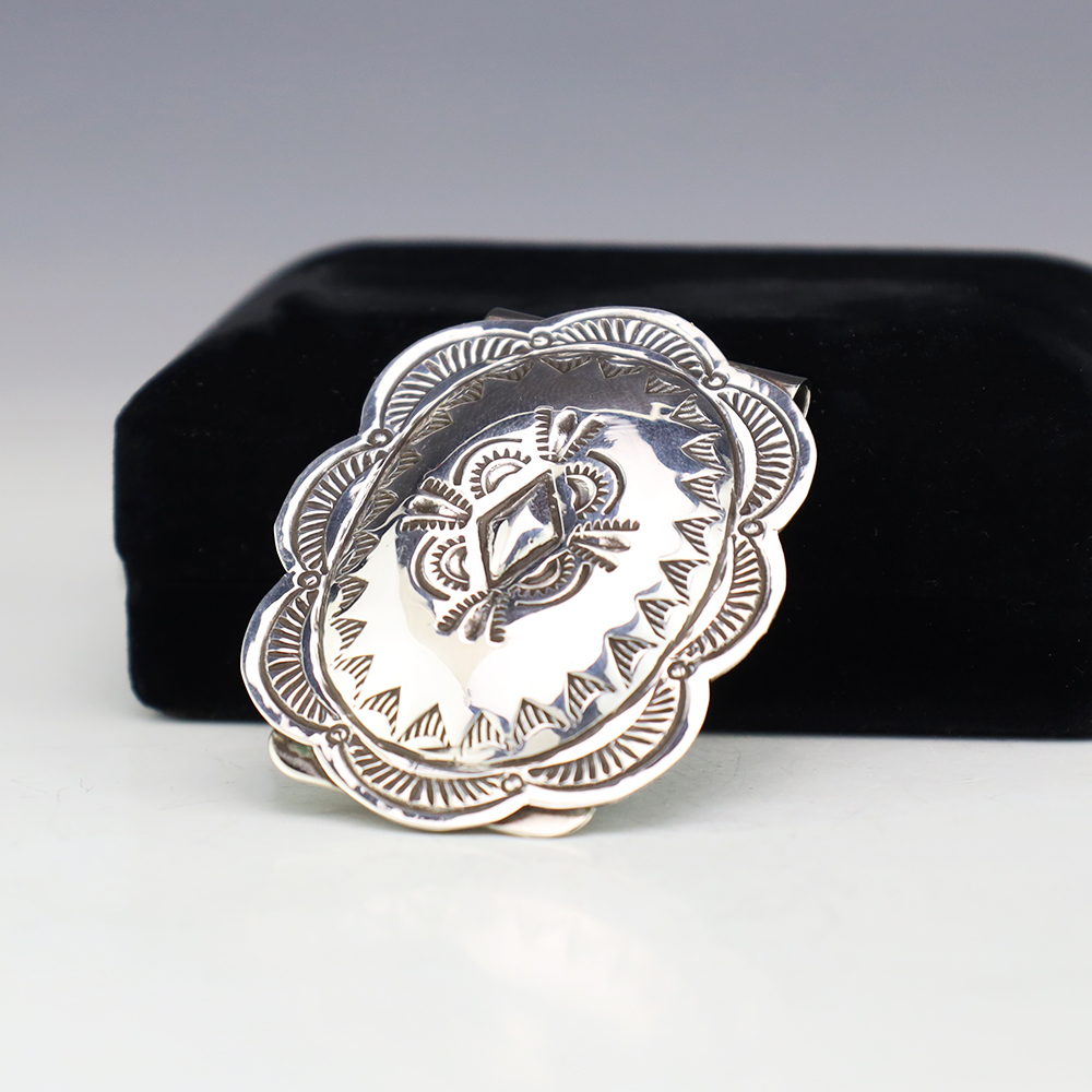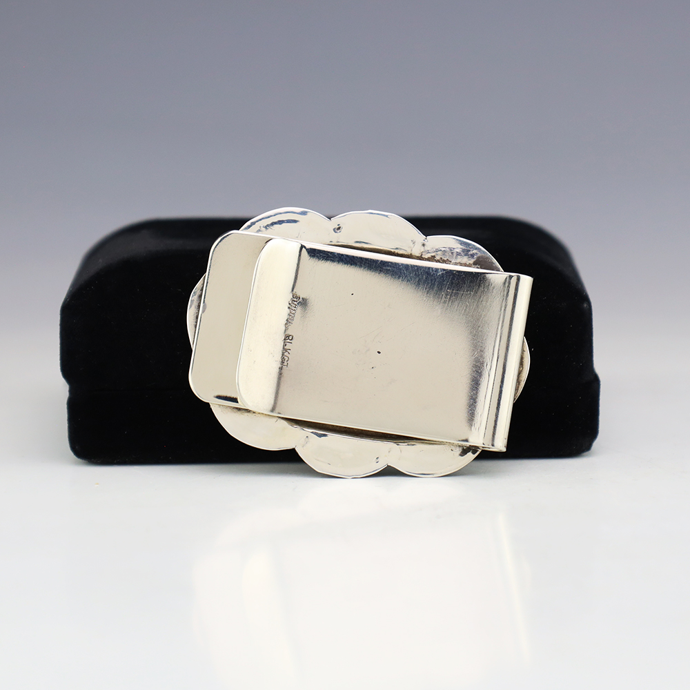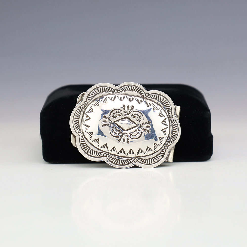 Take this money clip home for a wonderfully hand crafted accessory that show cases the craftsmanship of Navajo silversmithing. Sterling silver with a traditional hand stamped design, by Arnold Blackgoat. Backed with a nickle clip for stronger grip and durability. Weighs 20 grams. Signed