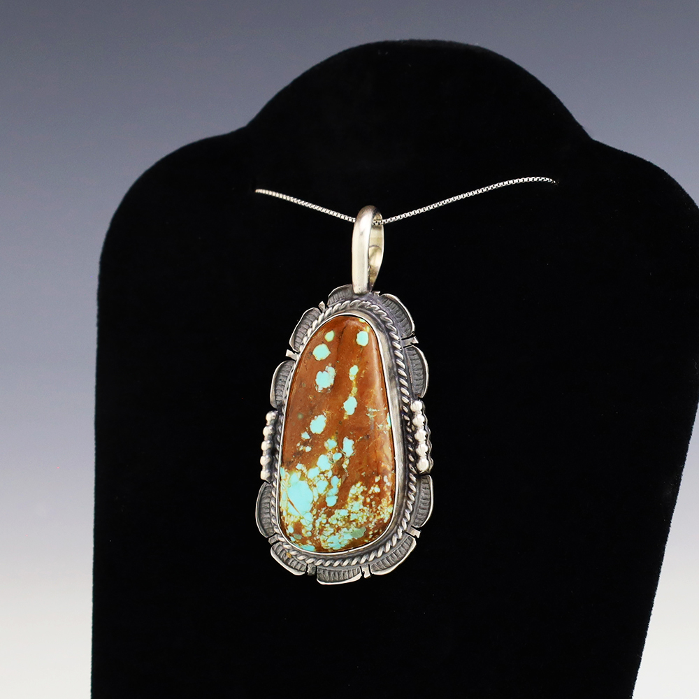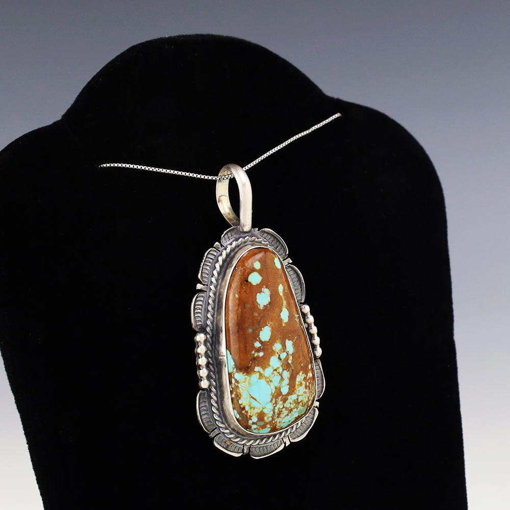 Beautiful pendant out of sterling silver and Number Eight Turquoise. A timeless beauty that you will enjoy for years to come. Weighs 16 grams.