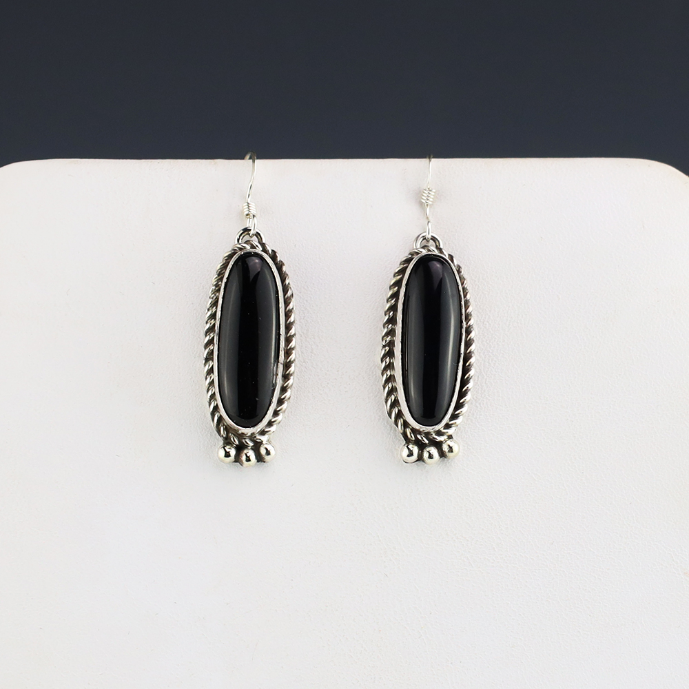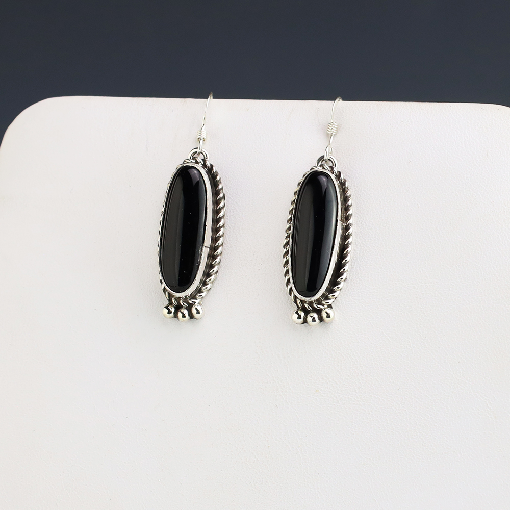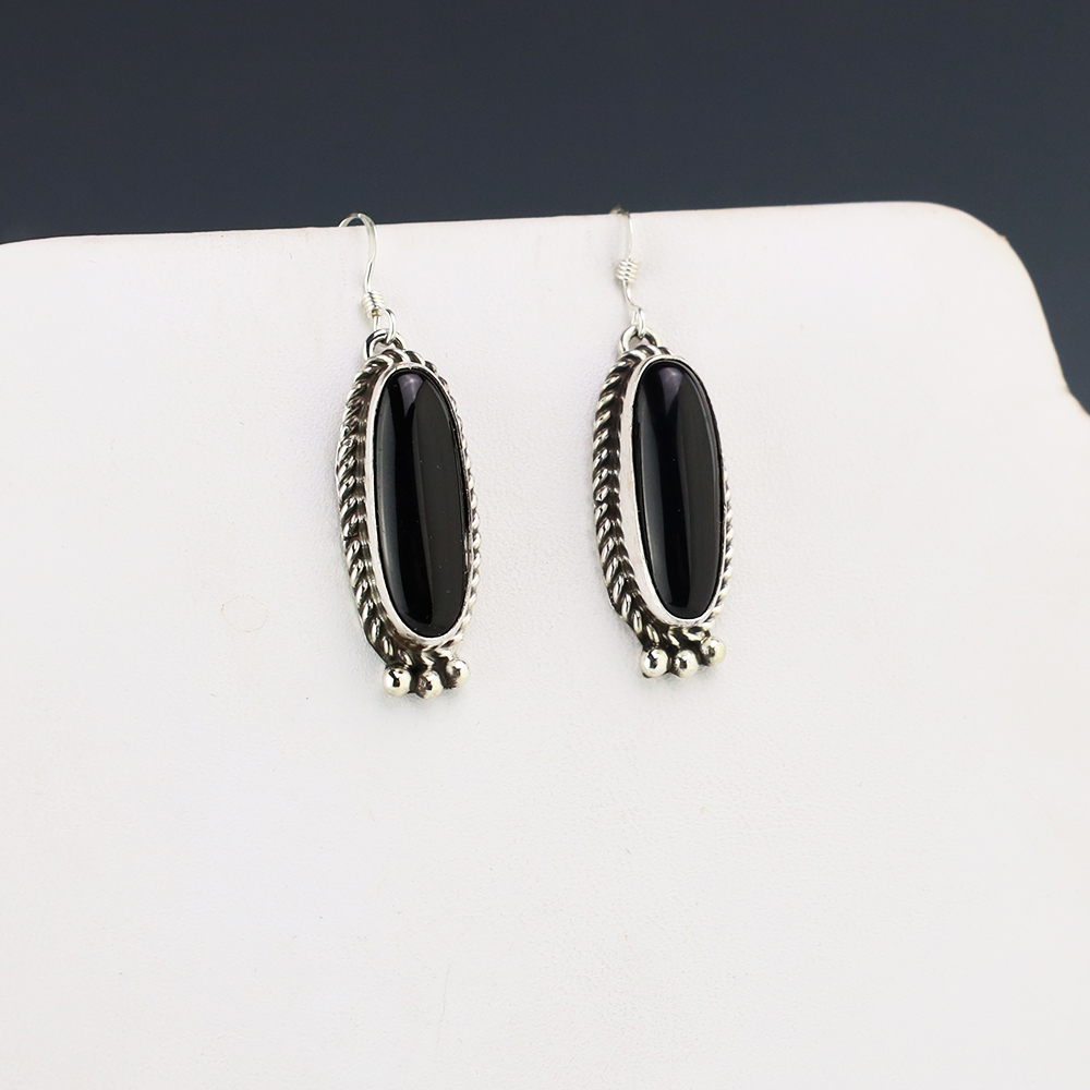 Beautiful earrings hand made out of sterling silver and Onyx by Navajo silversmith Priscilla Smith. These wonderful earrings will become a versatile accessory in your jewelry collection. Weighs 8 grams. Signed