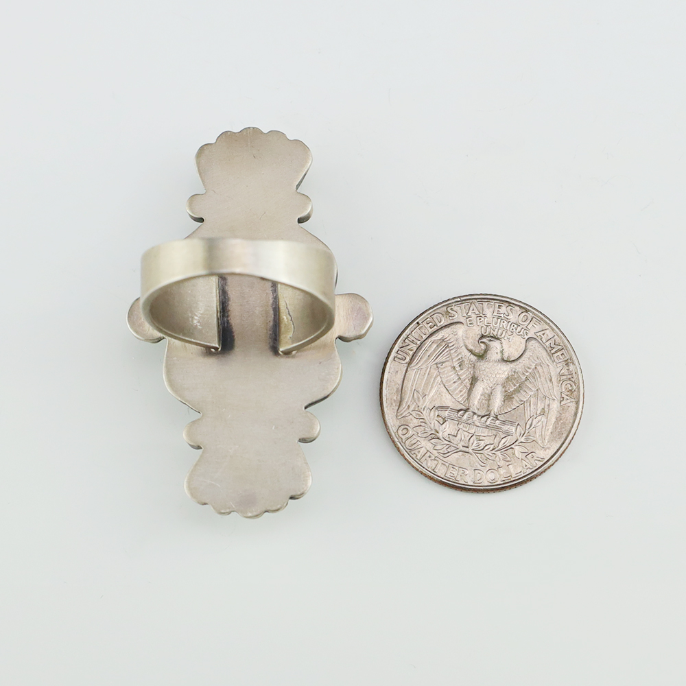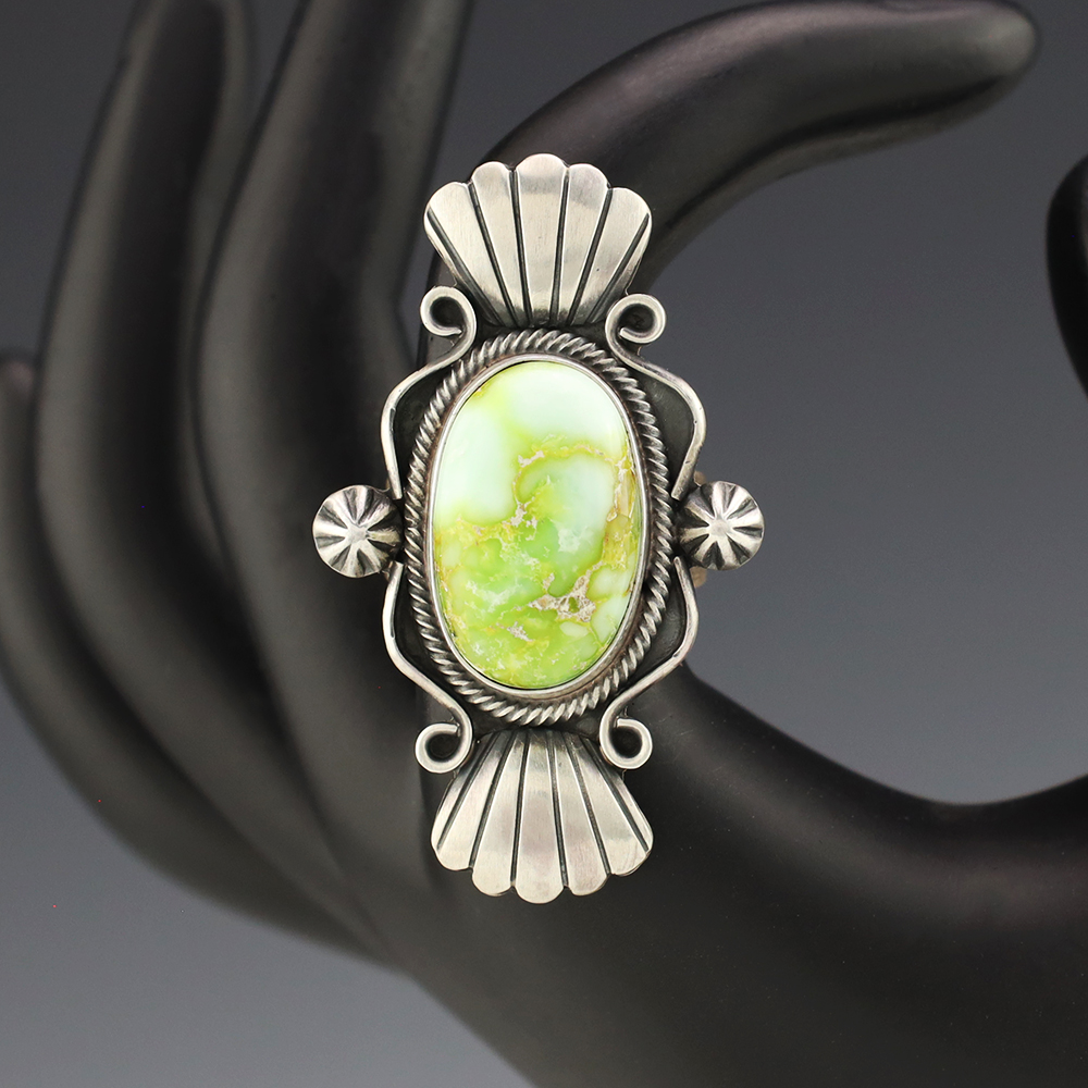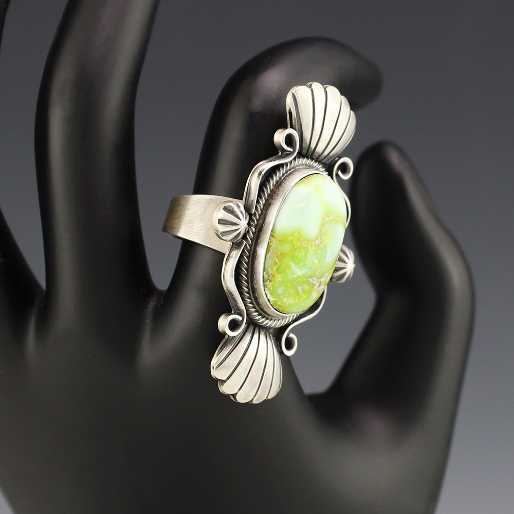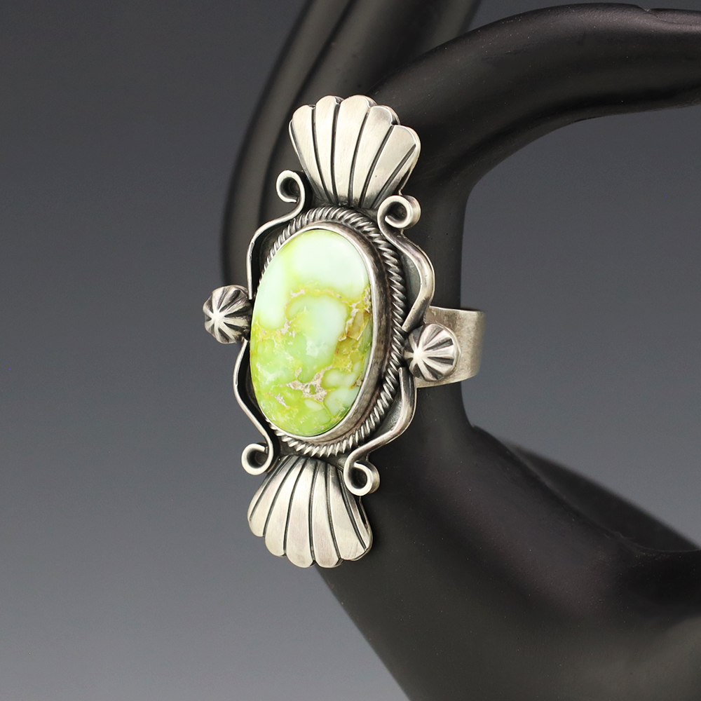 This stunning ring was hand made by Navajo artist Marita Benally. Sterling silver with a Palomino Variscite stone. It is a great representation of hand made Navajo jewelry. Size 8. Weighs 14 grams. Signed.