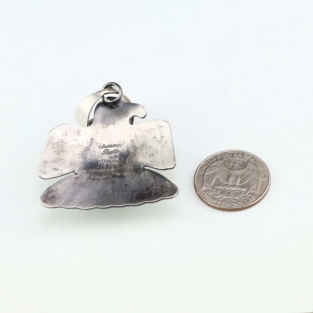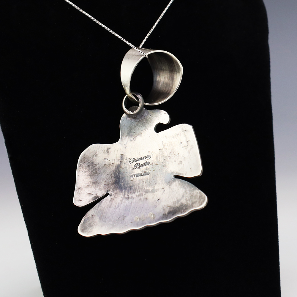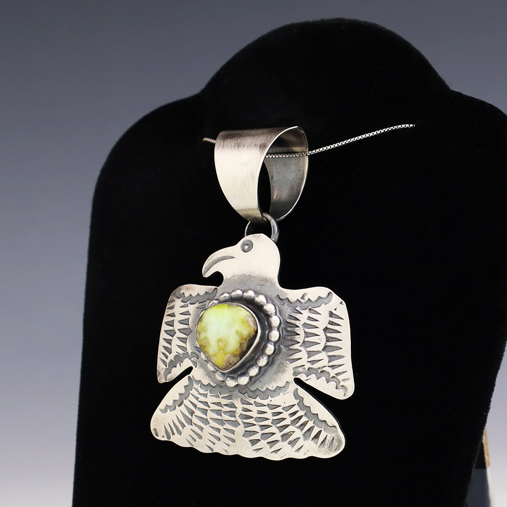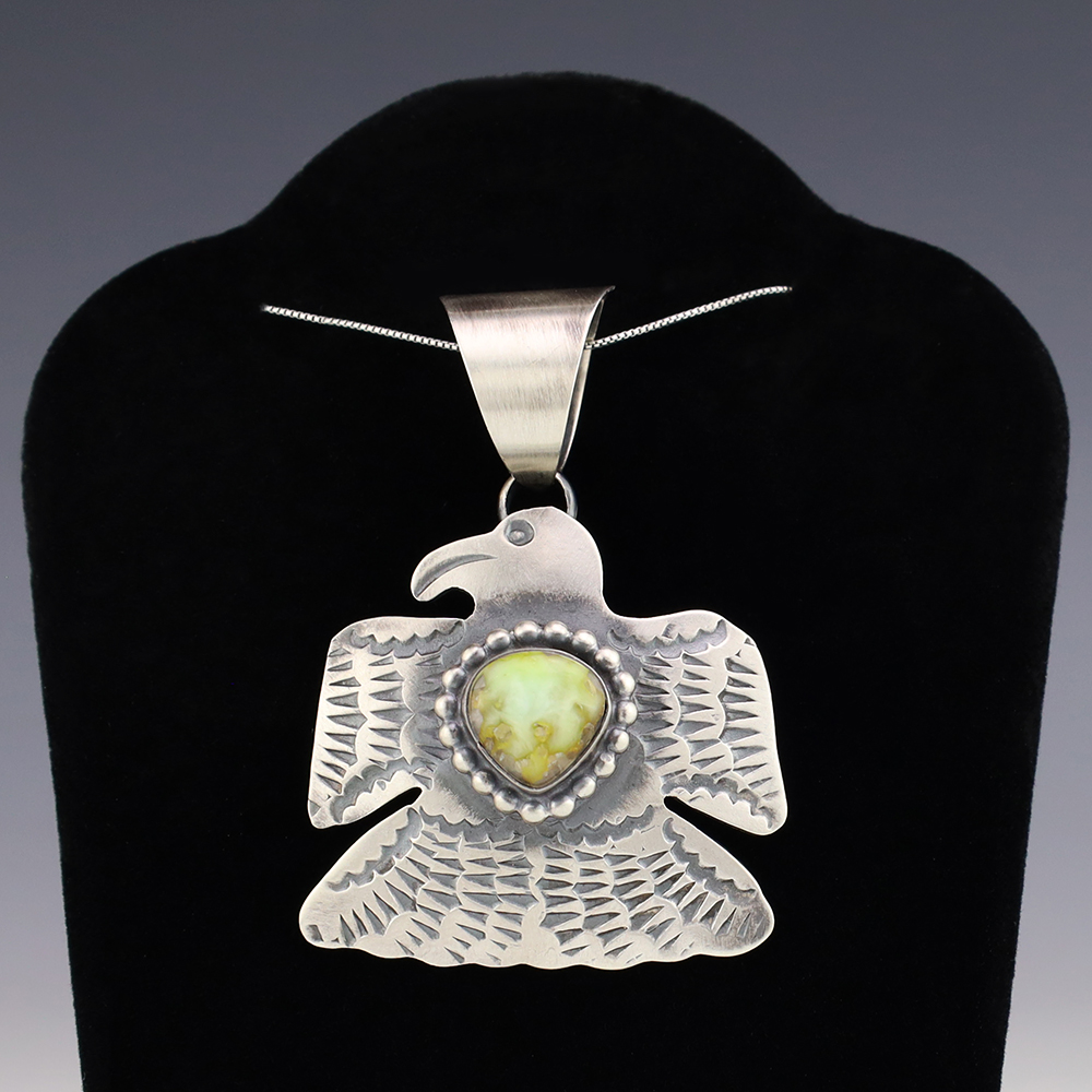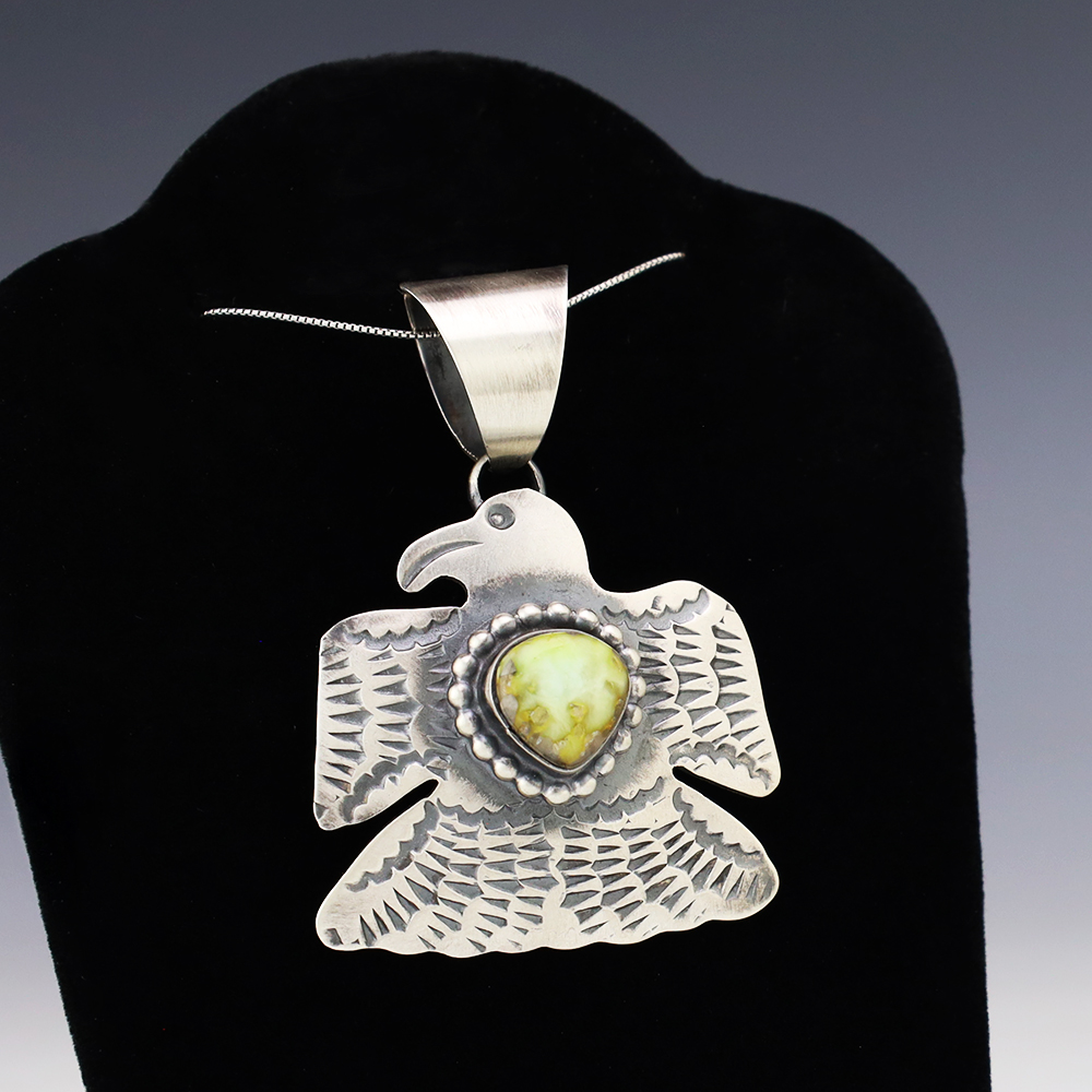 Navajo artist Chimney Butte handcrafted this stellar pendant out of sterling silver and Palomino Variscite. Great Thunderbird design! A timeless beauty that you will enjoy for years to come. Weighs 20 grams. (Chain not included) Signed