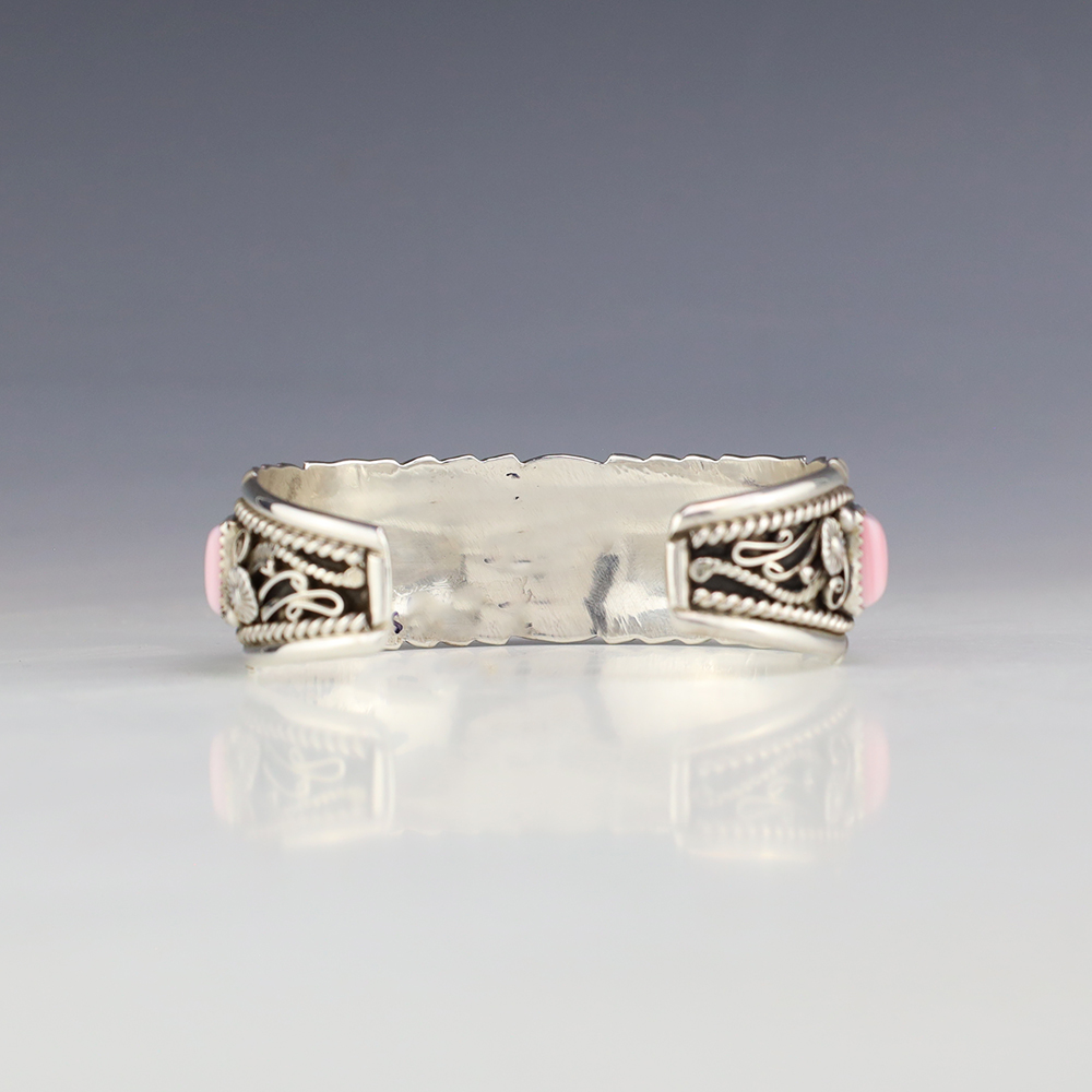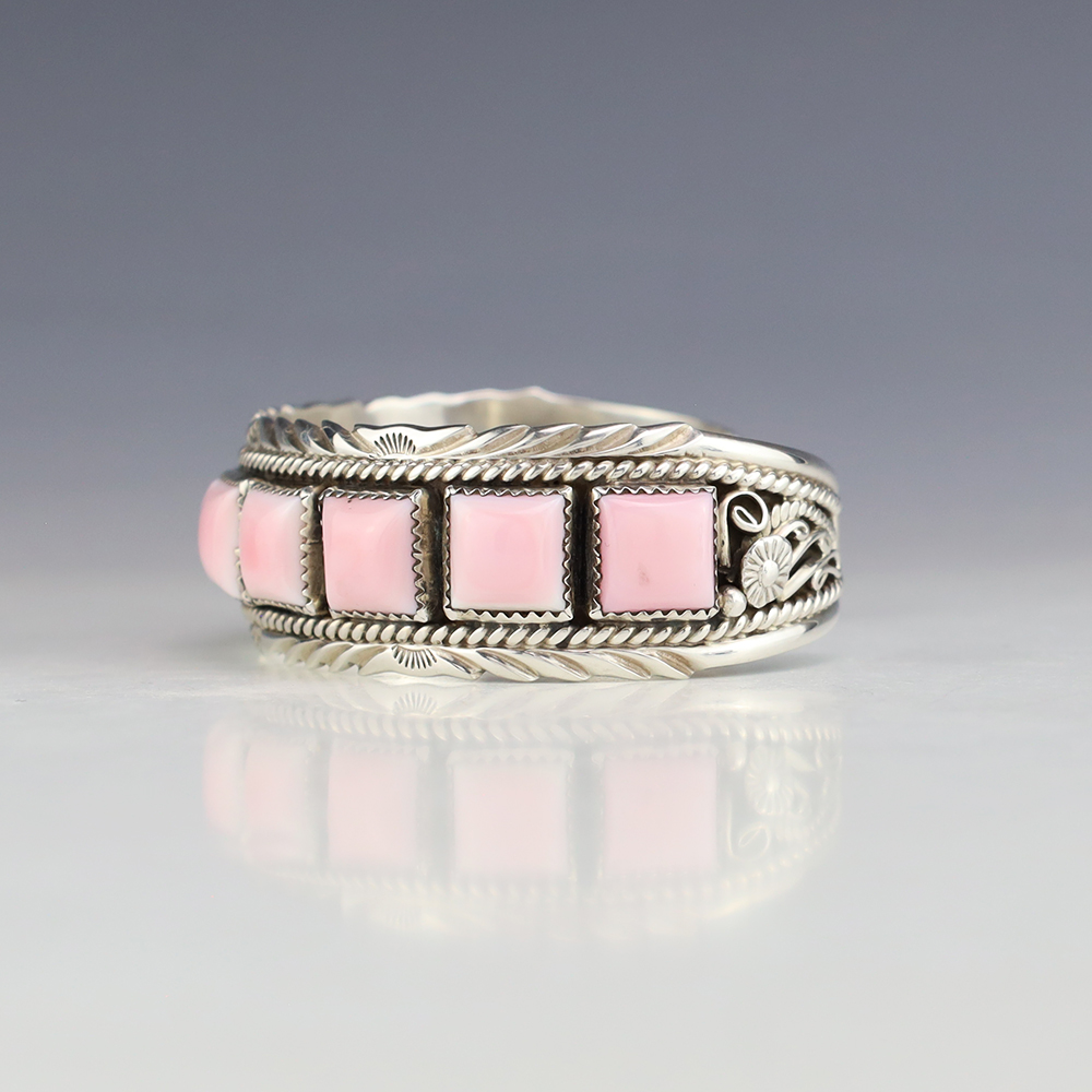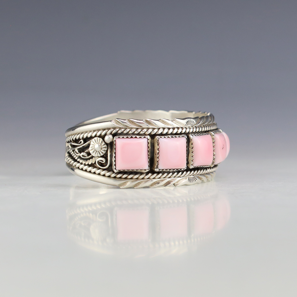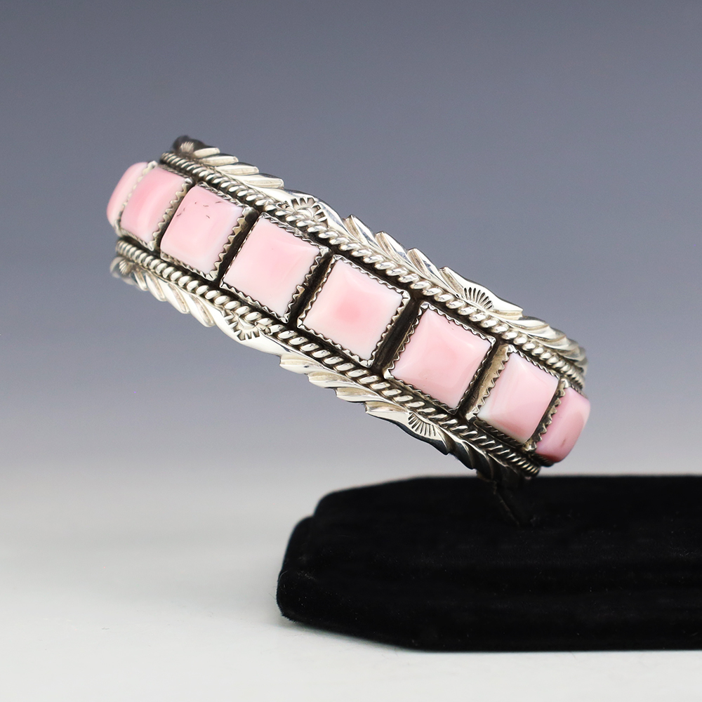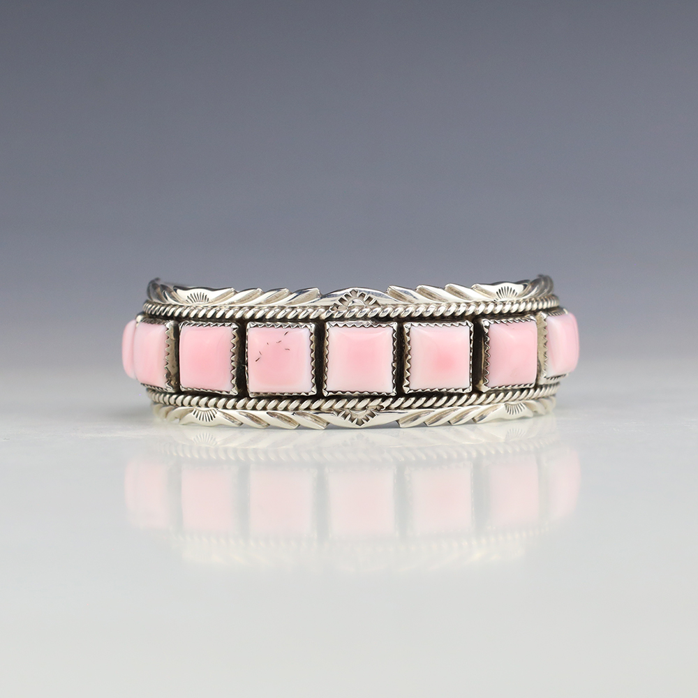 This timeless piece would be a great addition to your jewelry collection. Navajo silversmith Martin Muskett made this gorgeous bracelet out of sterling silver and Pink Conch. The entire inner circumference is about 7”, including 1 1/16” opening (Fits a 7″ wrist). Weighs 42 grams. Signed.