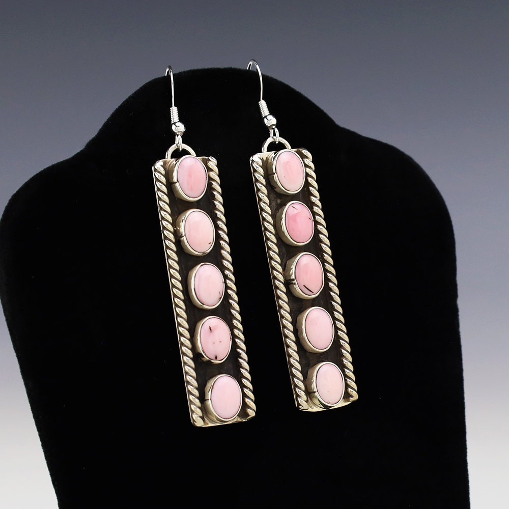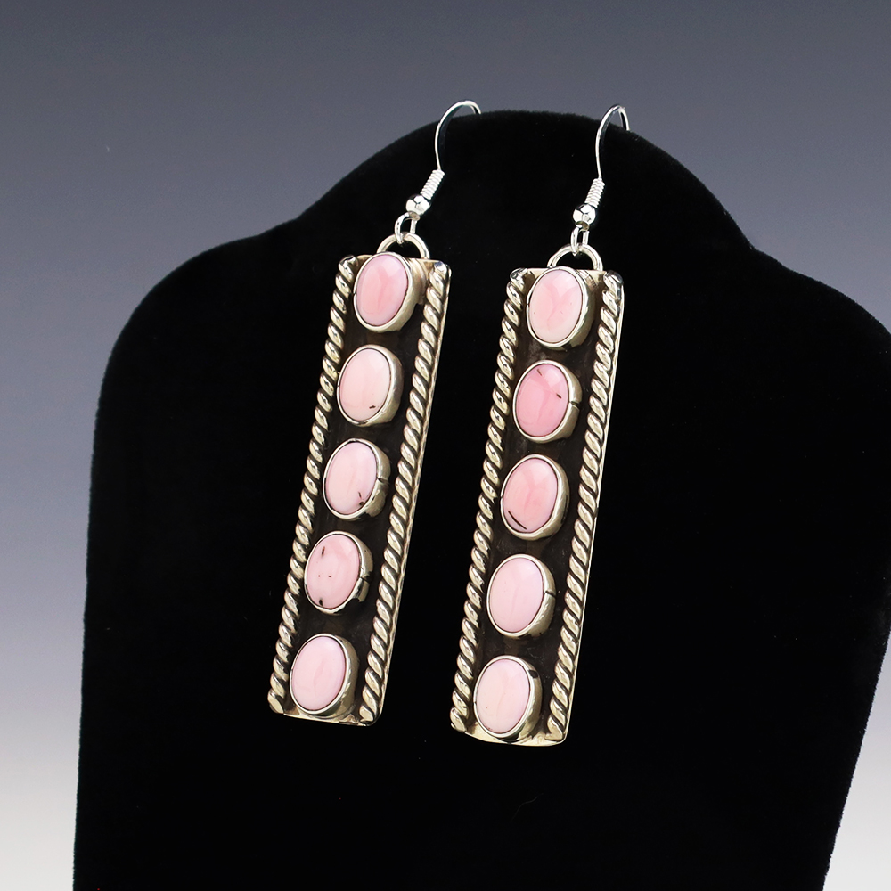 Beautiful earrings hand made out of sterling silver and Pink Conch by Navajo silversmiths Melvin and Tiffany Jones. These wonderful earrings will become a versatile accessory in your jewelry collection. Weighs 16 grams. Signed
