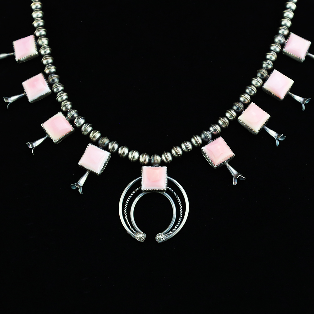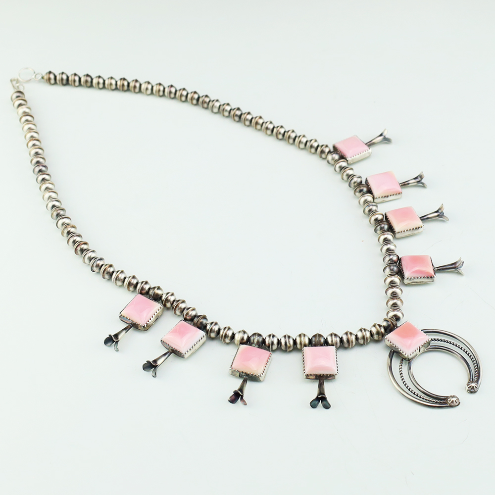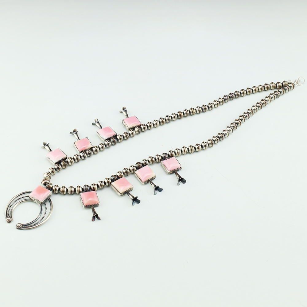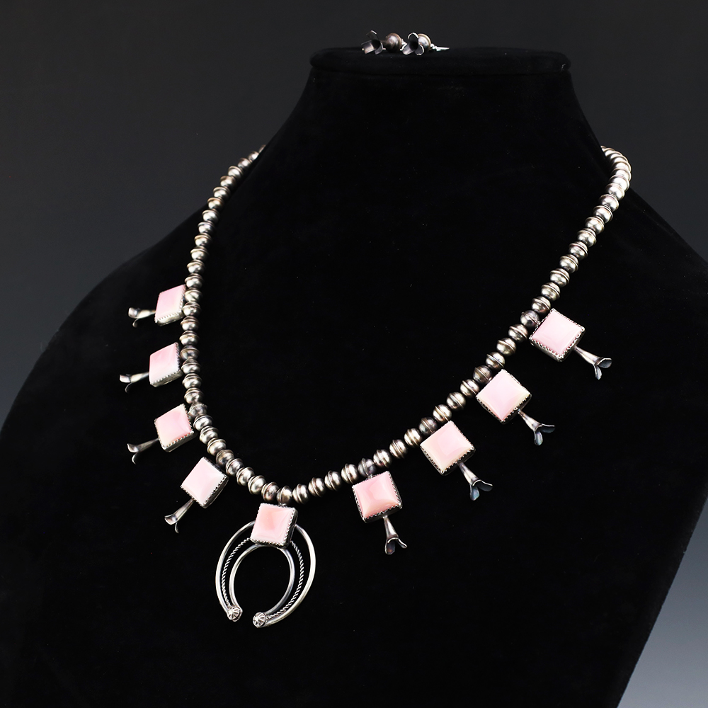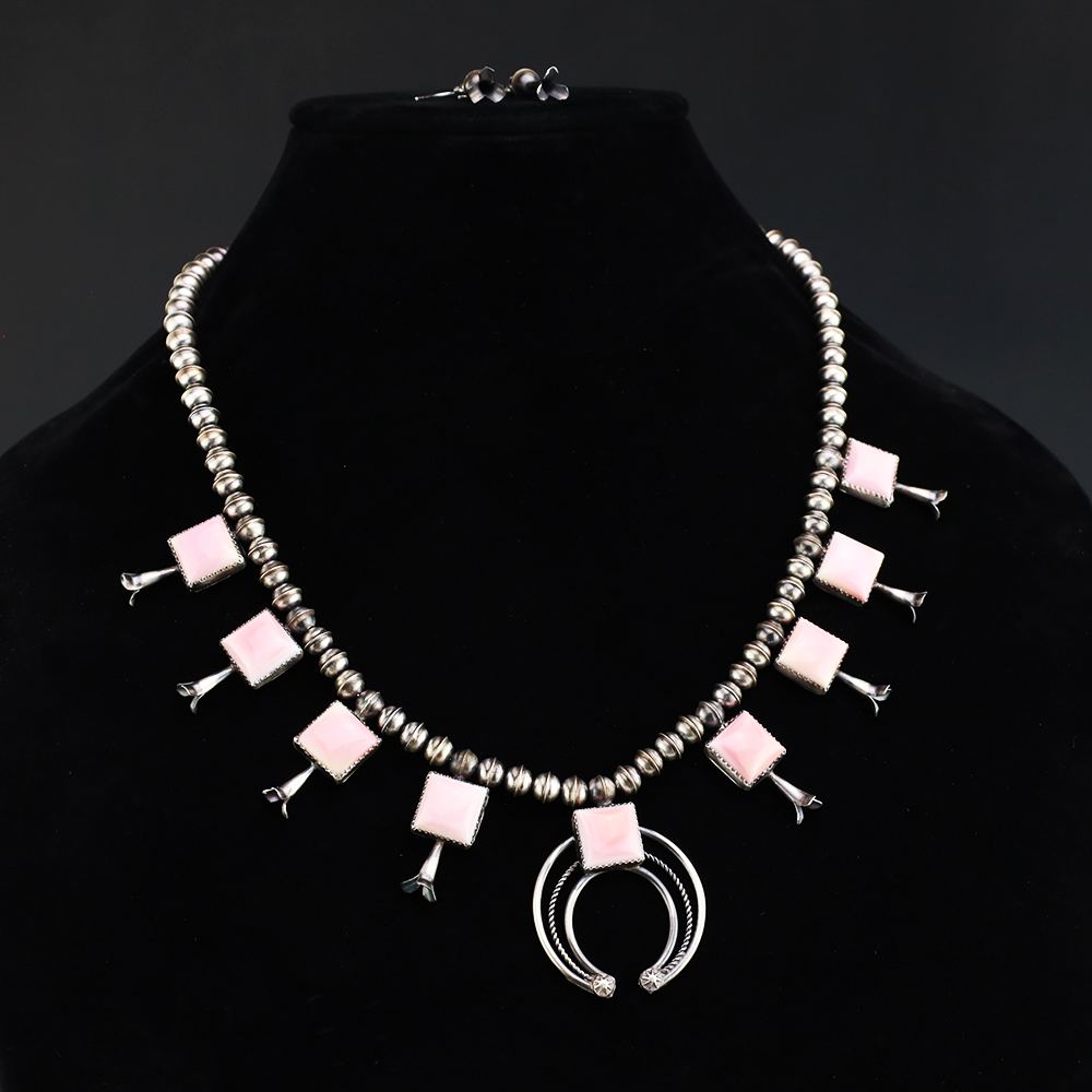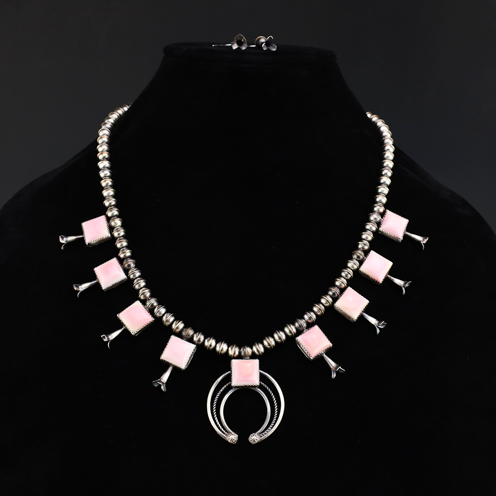 Navajo artist Phil Garcia created this lovely petite squash blossom necklace. Sterling silver with Pink Conch stones. The necklace is strung with sterling silver 5 mm beads. The necklace is finished off with a sterling silver hook and eye. Comes with matching earrings. A timeless beauty that you will enjoy for years to come. The necklace weighs 42 grams and the earrings weigh 2 grams. Signed.