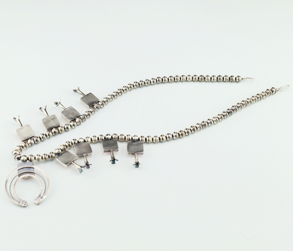 The Navajos began working with silver in the 19th century, and began making things like buckles, bridles, buttons, rings, canteens, hollow beads, earrings, crescent-shaped pendants (called “najas”), bracelets, crosses, powder chargers, tobacco canteens, and conchos (for belts). Their silversmithing skills has evolved and changed throughout the years, and in about 1880 Navajo silversmiths started to set turquoise in their silver work. Traditionally, Navajo artists worked with jewelry techniques like repousee and stamp work, but today they explored in other Native American jewelry making techniques like Zuni inlay work and Hopi overlay work.