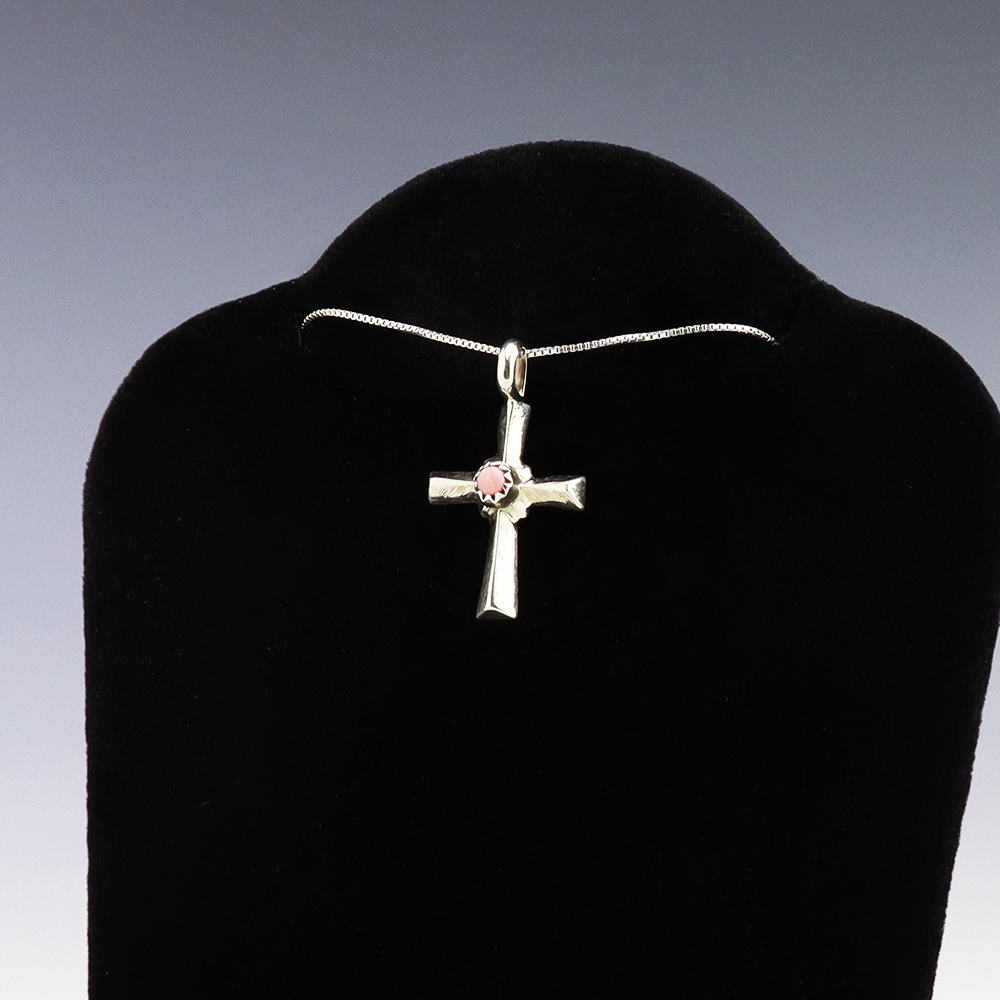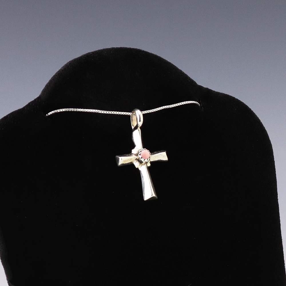 Navajo silversmith Harrison Yazzie made this lovely cross pendant out of sterling silver and Pink Coral A timeless beauty that you will enjoy for years to come. Weighs 4 grams. Signed. (Chain not included)