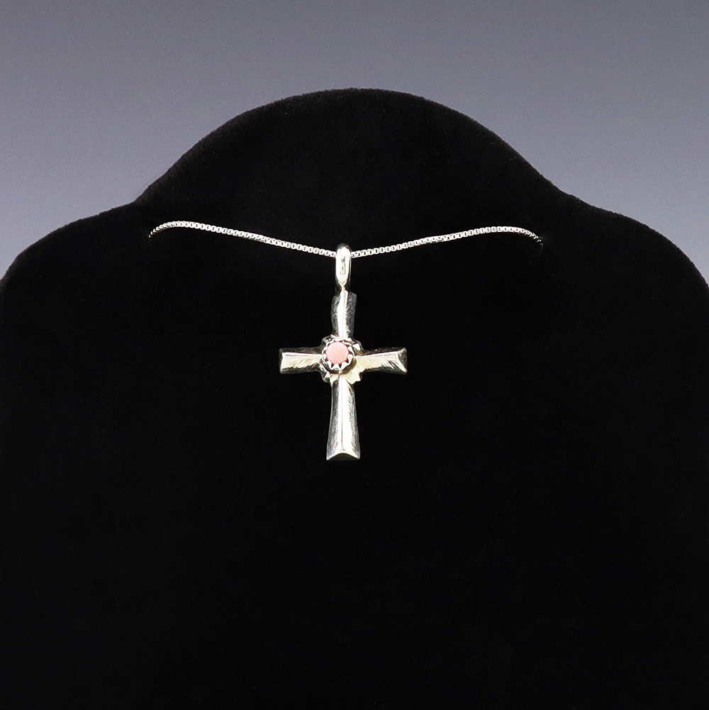 Navajo silversmith Harrison Yazzie made this lovely cross pendant out of sterling silver and Pink Coral A timeless beauty that you will enjoy for years to come. Weighs 4 grams. Signed. (Chain not included)