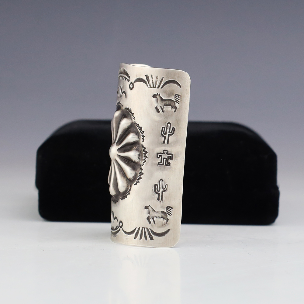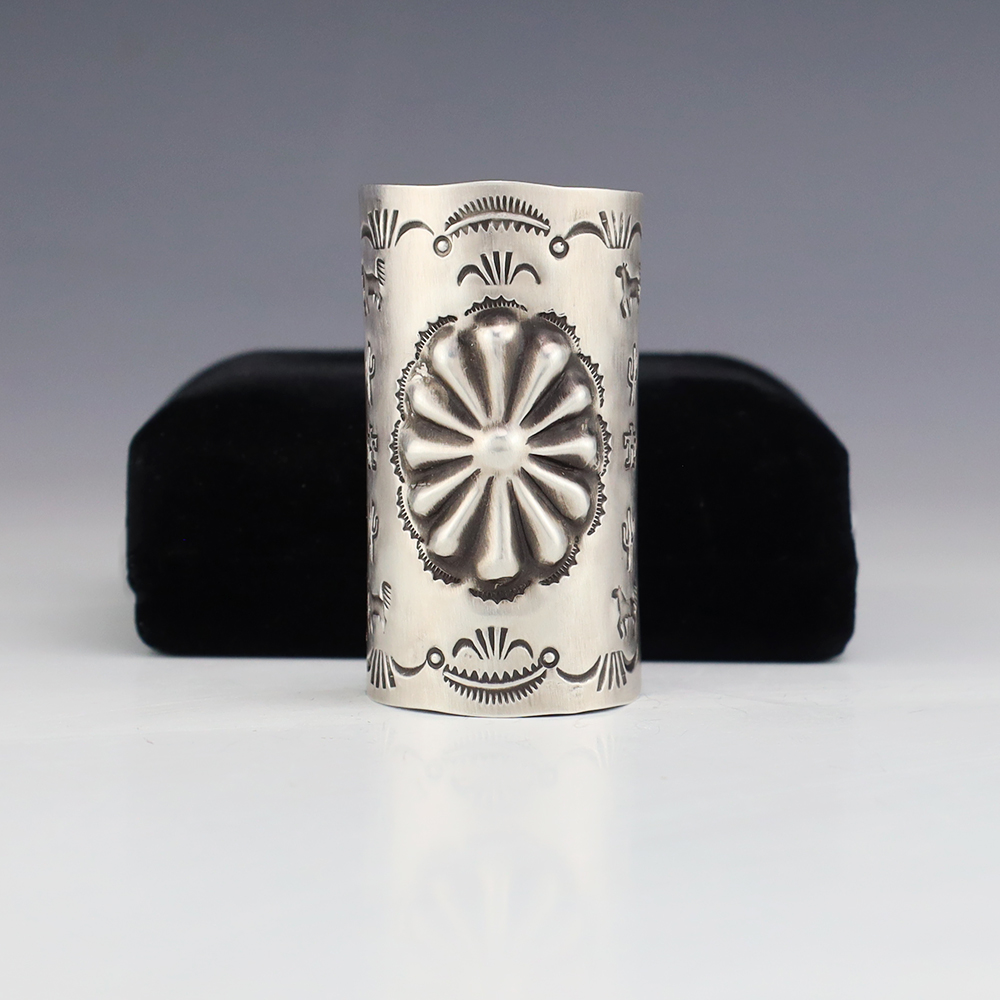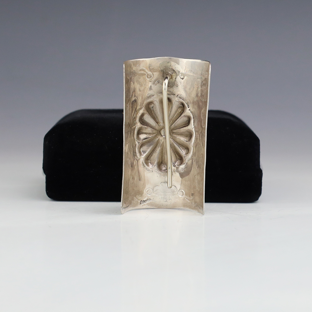 The Navajos began working with silver in the 19th century, and began making things like buckles, bridles, buttons, rings, canteens, hollow beads, earrings, crescent-shaped pendants (called “najas”), bracelets, crosses, powder chargers, tobacco canteens, and conchos (for belts). Their silversmithing skills has evolved and changed throughout the years, and in about 1880 Navajo silversmiths started to set turquoise in their silver work. Traditionally, Navajo artists worked with jewelry techniques like repousee and stamp work, but today they explored in other Native American jewelry making techniques like Zuni inlay work and Hopi overlay work.