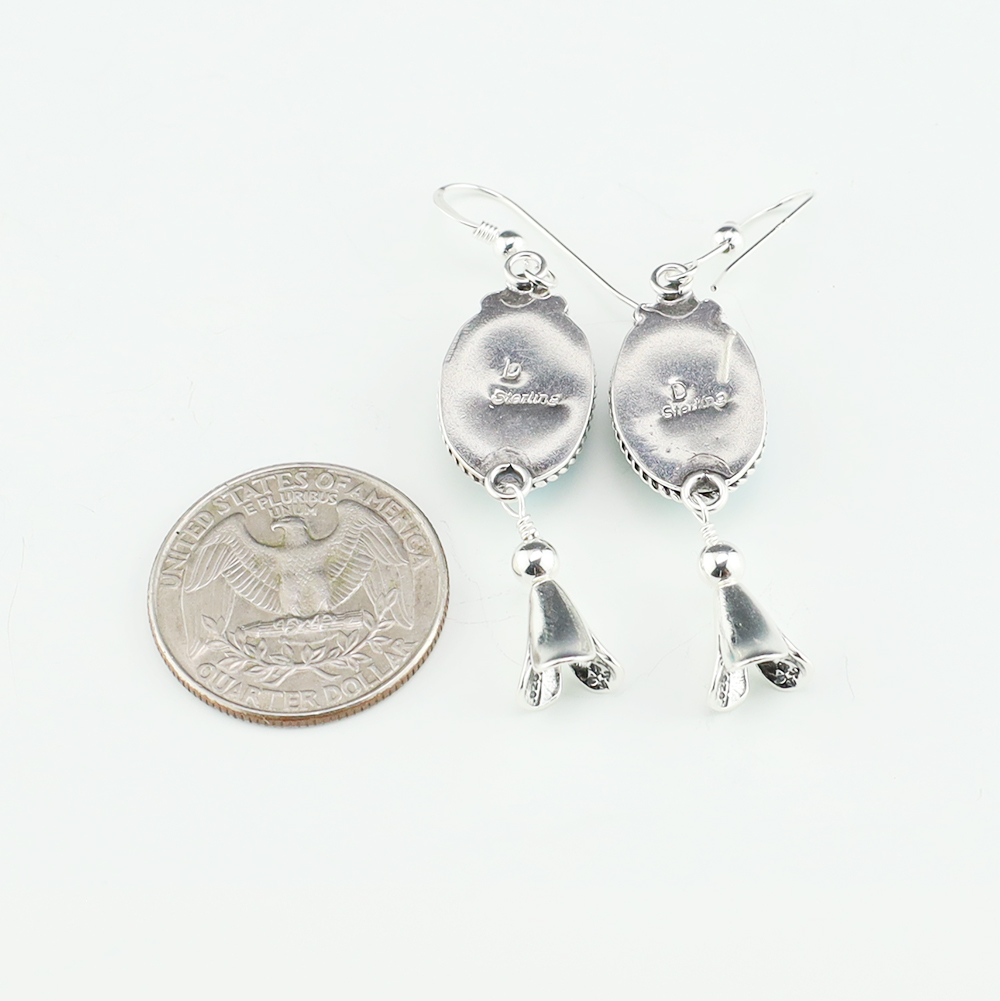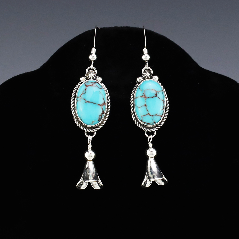 Gorgeous dangle earrings made out of sterling silver and set with Prince Turquoise stones. Hand made by Navajo artist Della Wylie. These fabulous earrings will become a versatile accessory in your jewelry collection. Weighs 10 grams. Signed.
