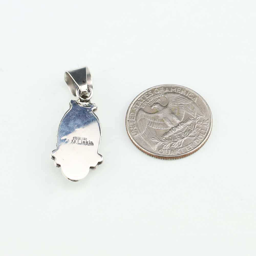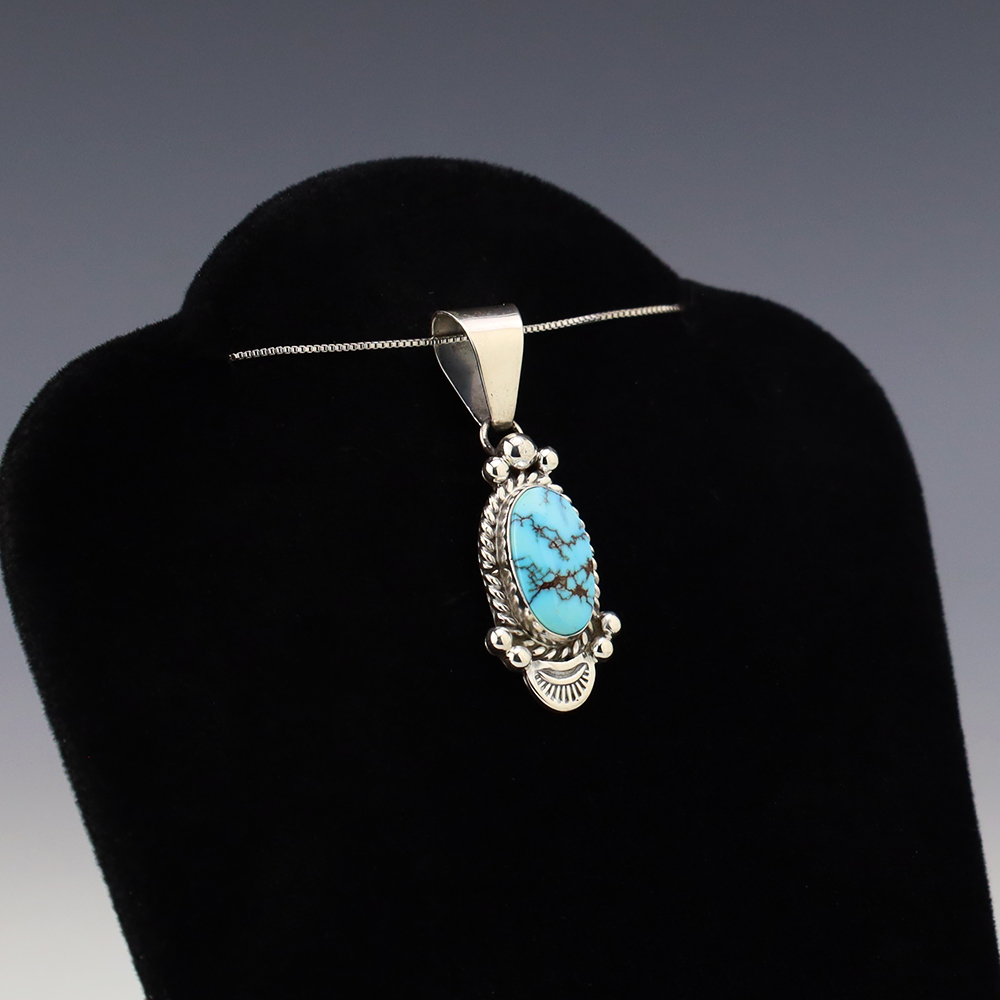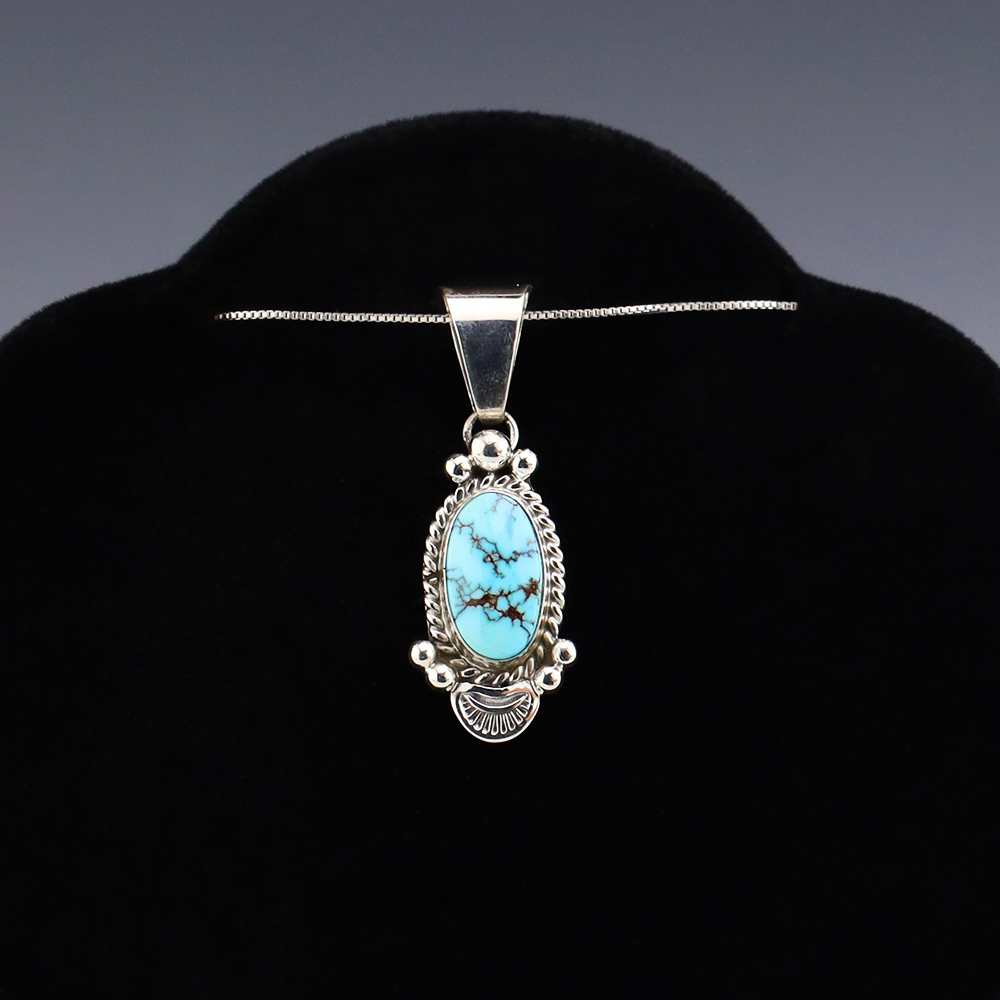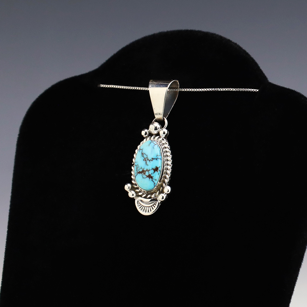 Lovely pendant hand made out of sterling silver and Prince Turquoise by Navajo artist Ella Linkin. A timeless beauty that you will enjoy for years to come. Weighs 4 grams. Signed (Chain not included)
