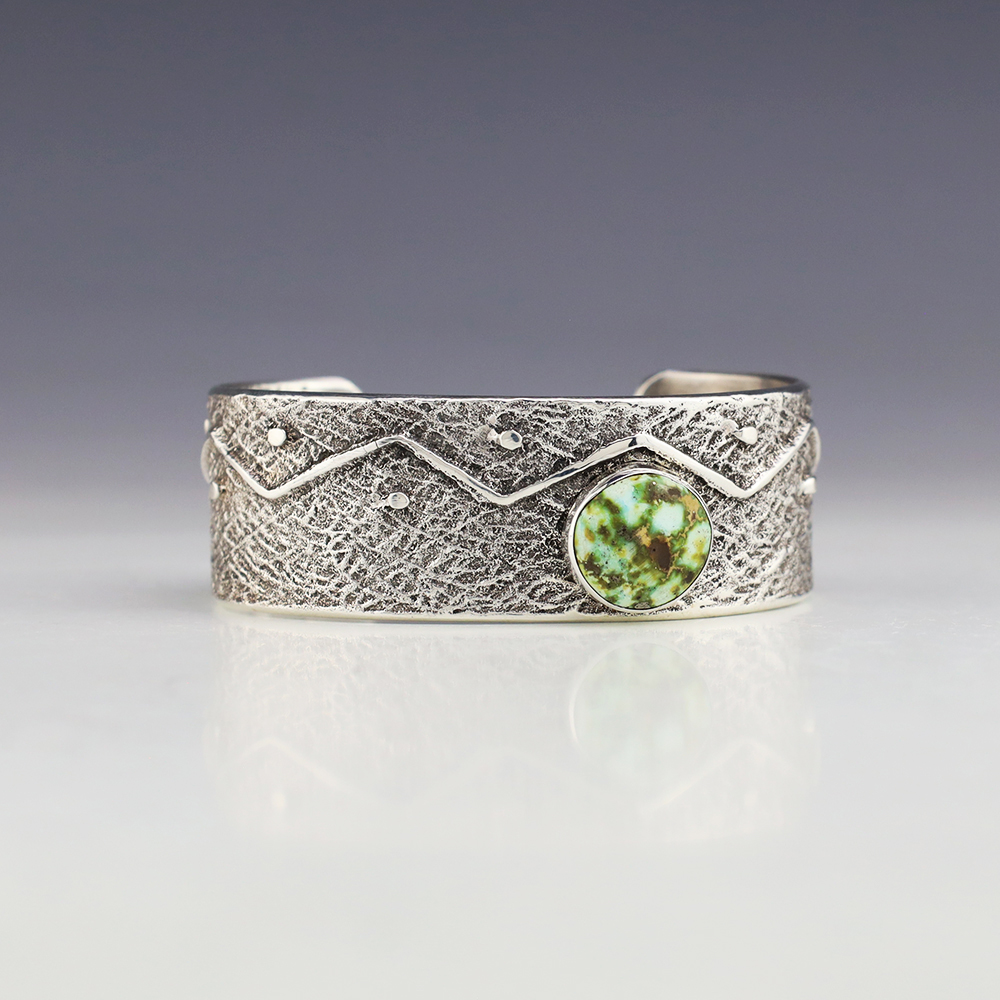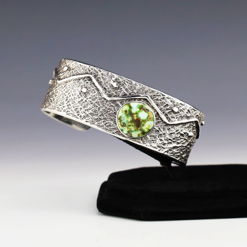 In the mid 1800s, Navajo silversmiths started to use sand casting as one of their silversmithing techniques. Today, silversmiths still use this technique by carving a design in tufa stone (a porous limestone) and then placing another stone against it. The two pieces are fastened together and molten silver is poured in. Once it has cooled, the artist takes the piece out and finishes it. Navajo artist Gary Custer created this stunning bracelet in this manner. Sterling silver bracelet set with a Sonoran Gold Turquoise stone. The bracelet has a satin finish. Gary has accomplished many silversmithing techniques, learning the traditions from his family of silversmiths. Weighs 56 grams. The entire inner circumference is about 6 3/4”, including 1 1/8” opening. (Fits a 6 3/4″ wrist) Signed