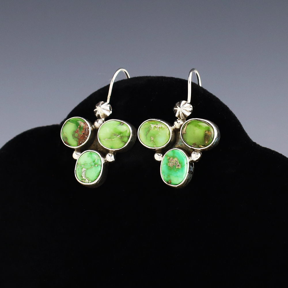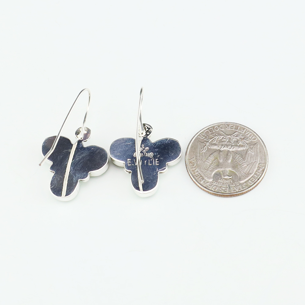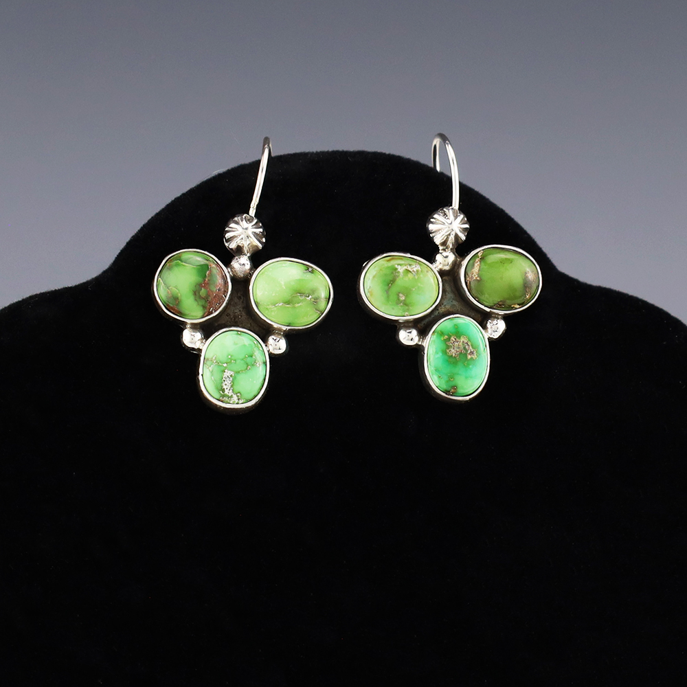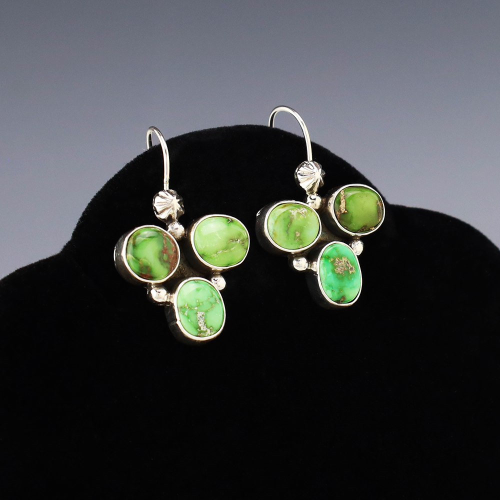 Lovely earrings hand made by Navajo silversmith Eula Wylie. The earrings are sterling silver and set with Sonoran Gold Turquoise stones. These fabulous earrings will become a versatile accessory in your jewelry collection. Weighs 8 grams. Signed.