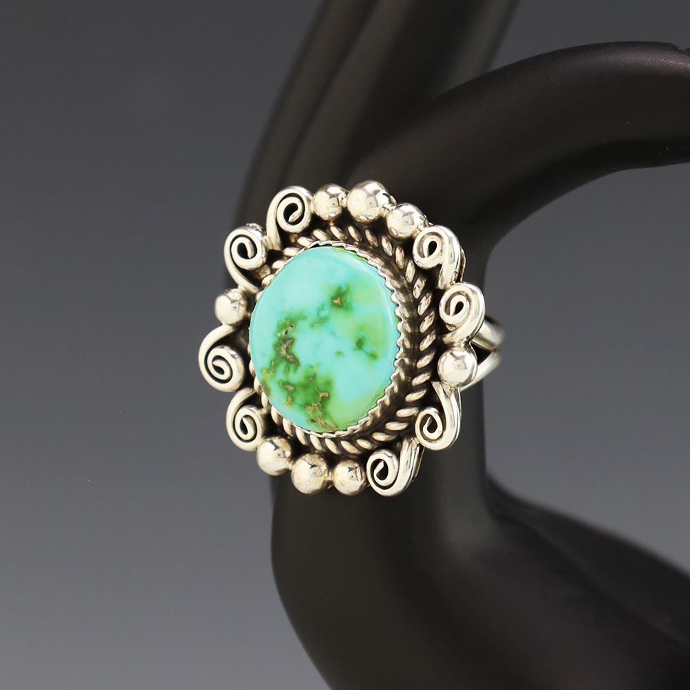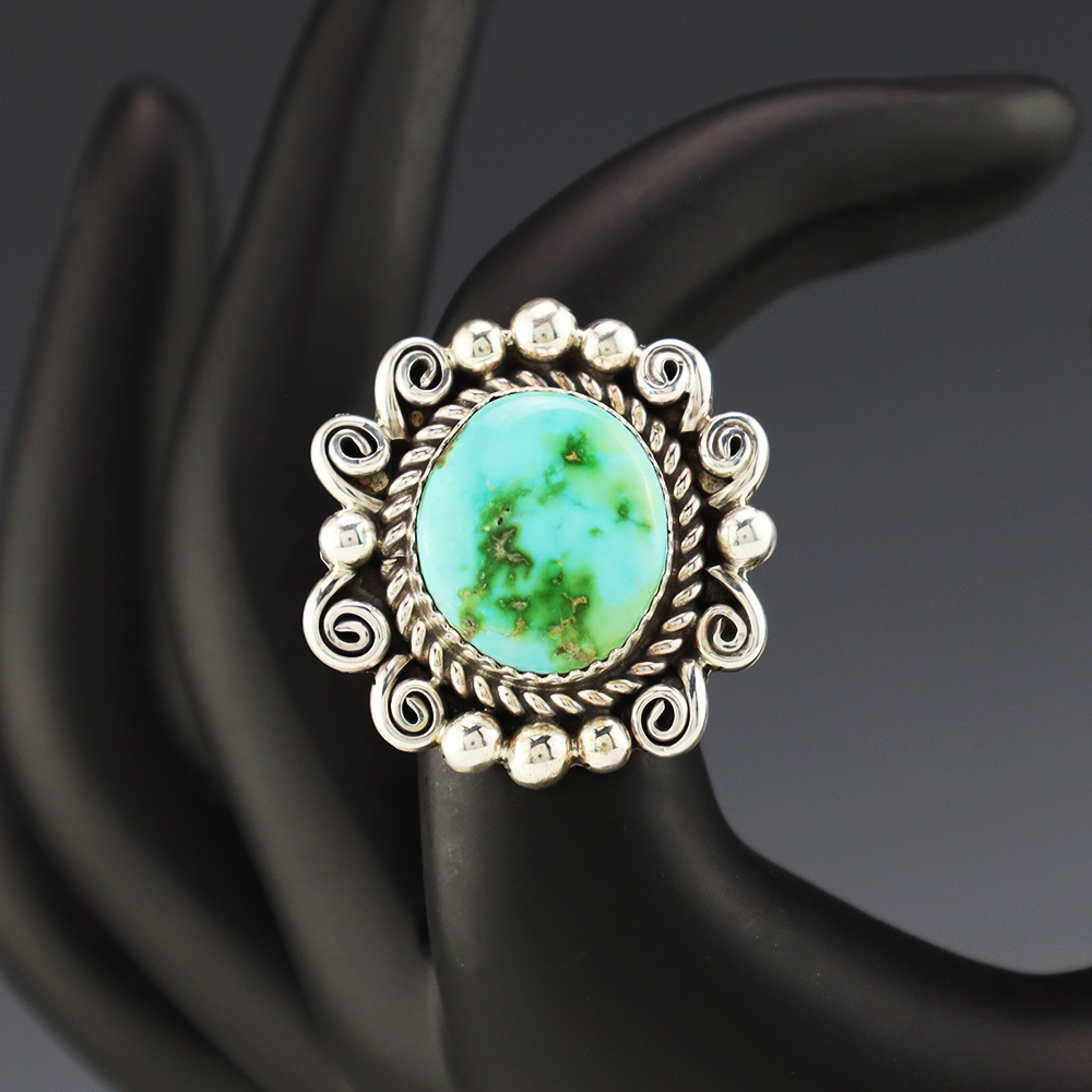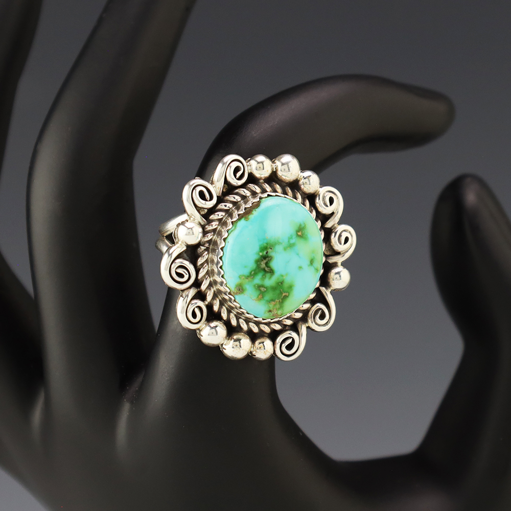 This wonderful ring was hand made by Navajo artist Julia Etsitty Sterling silver with a Sonoran Gold Turquoise stone. It is a great representation of hand made Navajo jewelry. Size 6 3/4. Weighs 12 grams. Signed