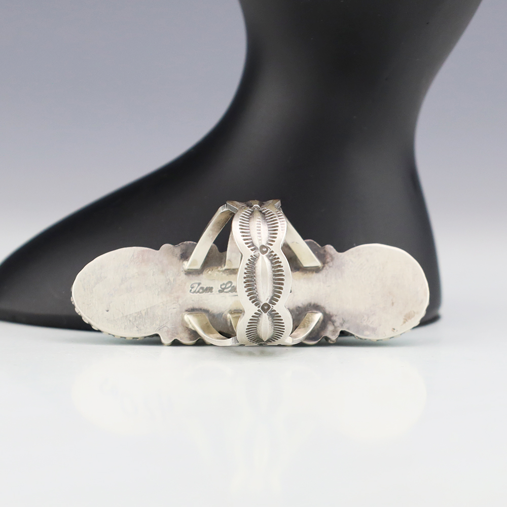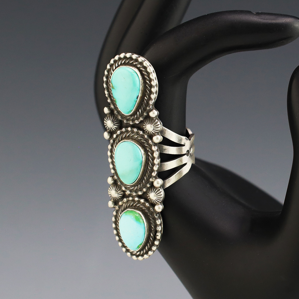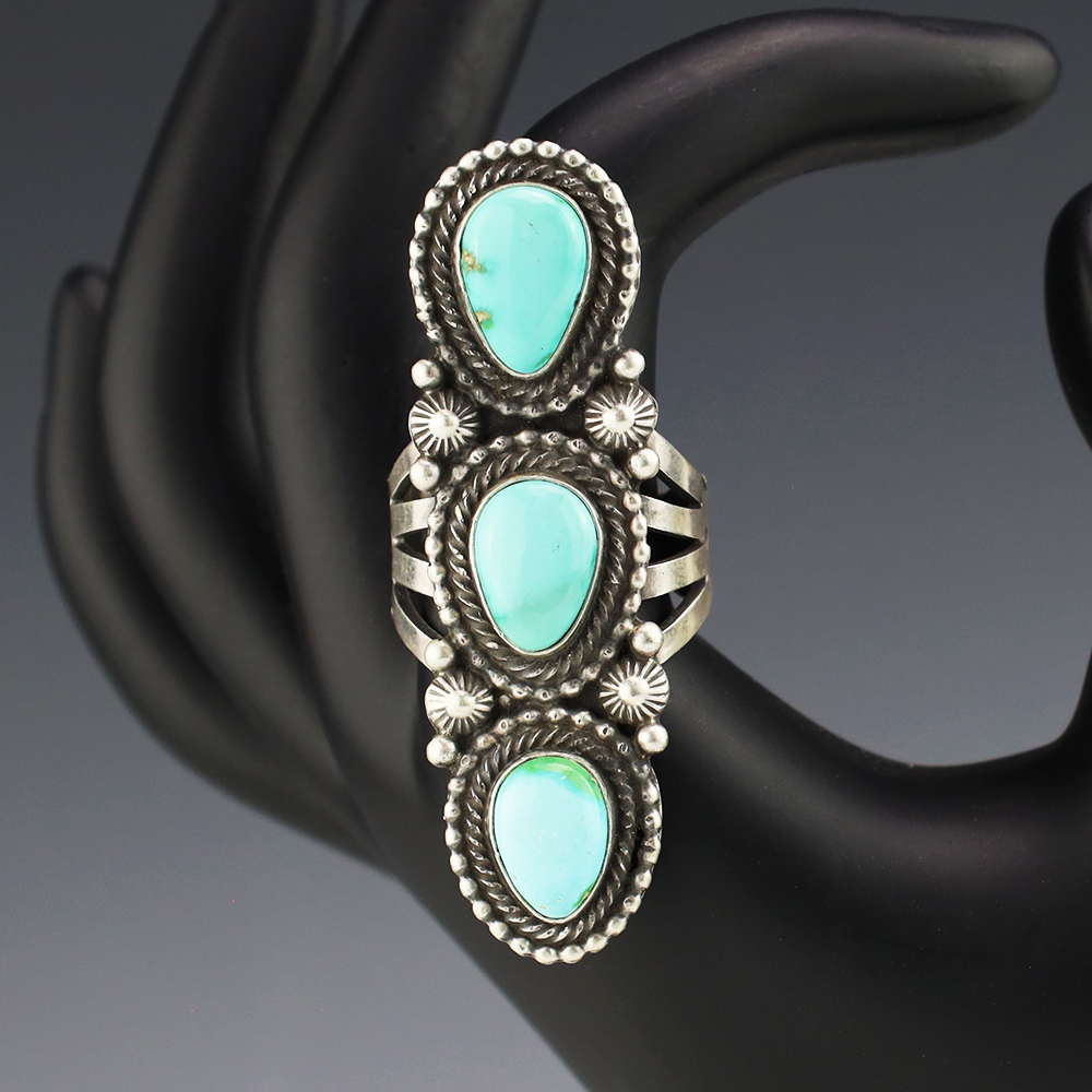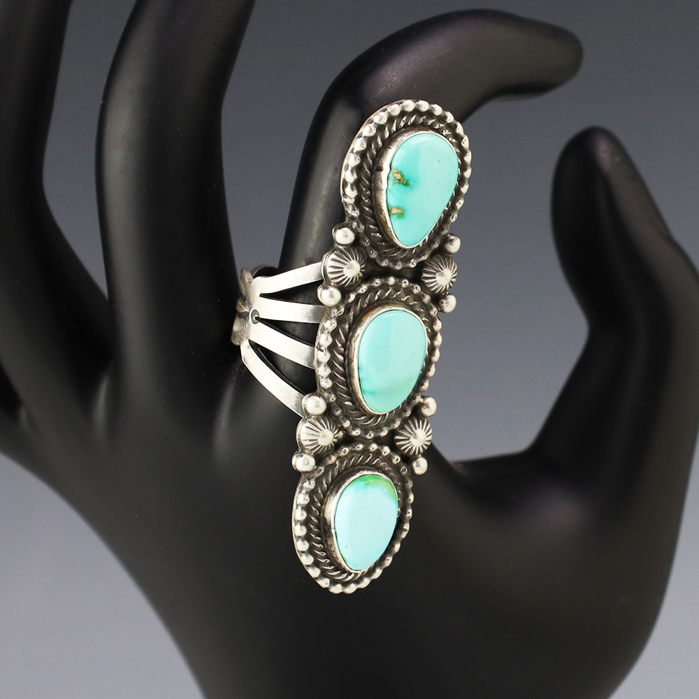 This wonderful ring was hand made by Navajo artist Tom Lewis. Sterling silver with Sonoran Gold Turquoise stones. It is a great representation of hand made Navajo jewelry. Size 10. Weighs 24 grams. Signed