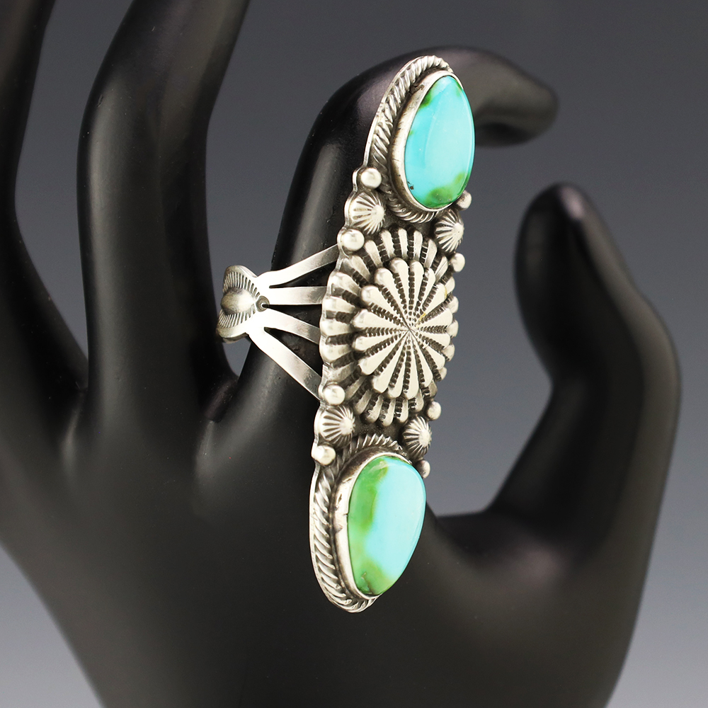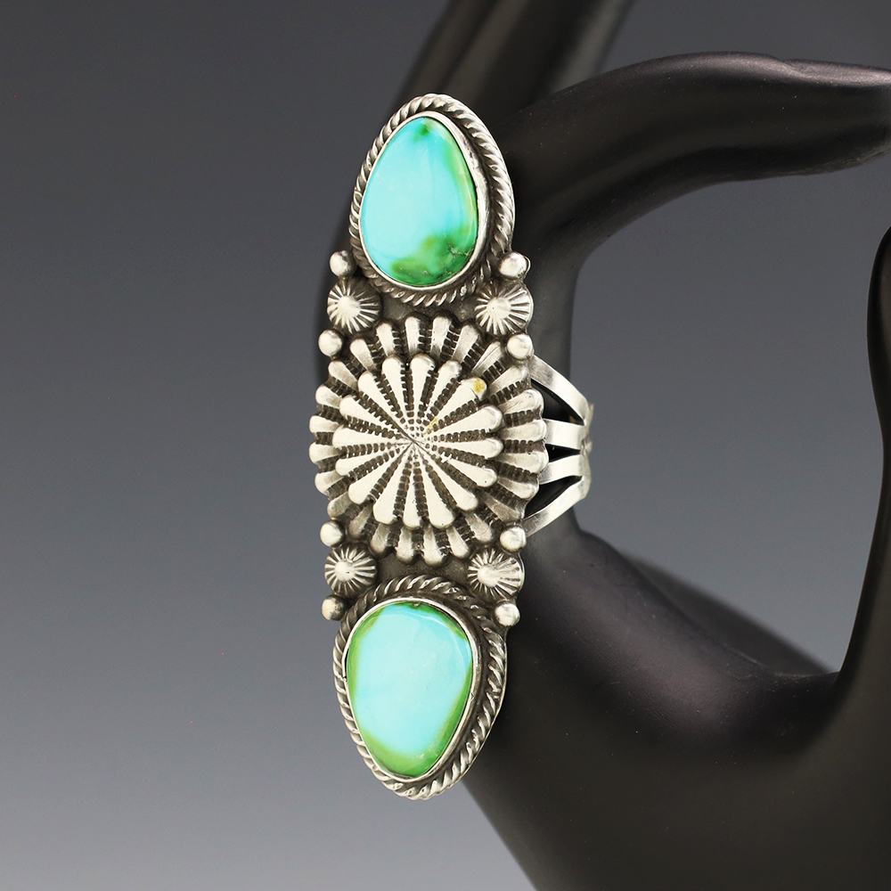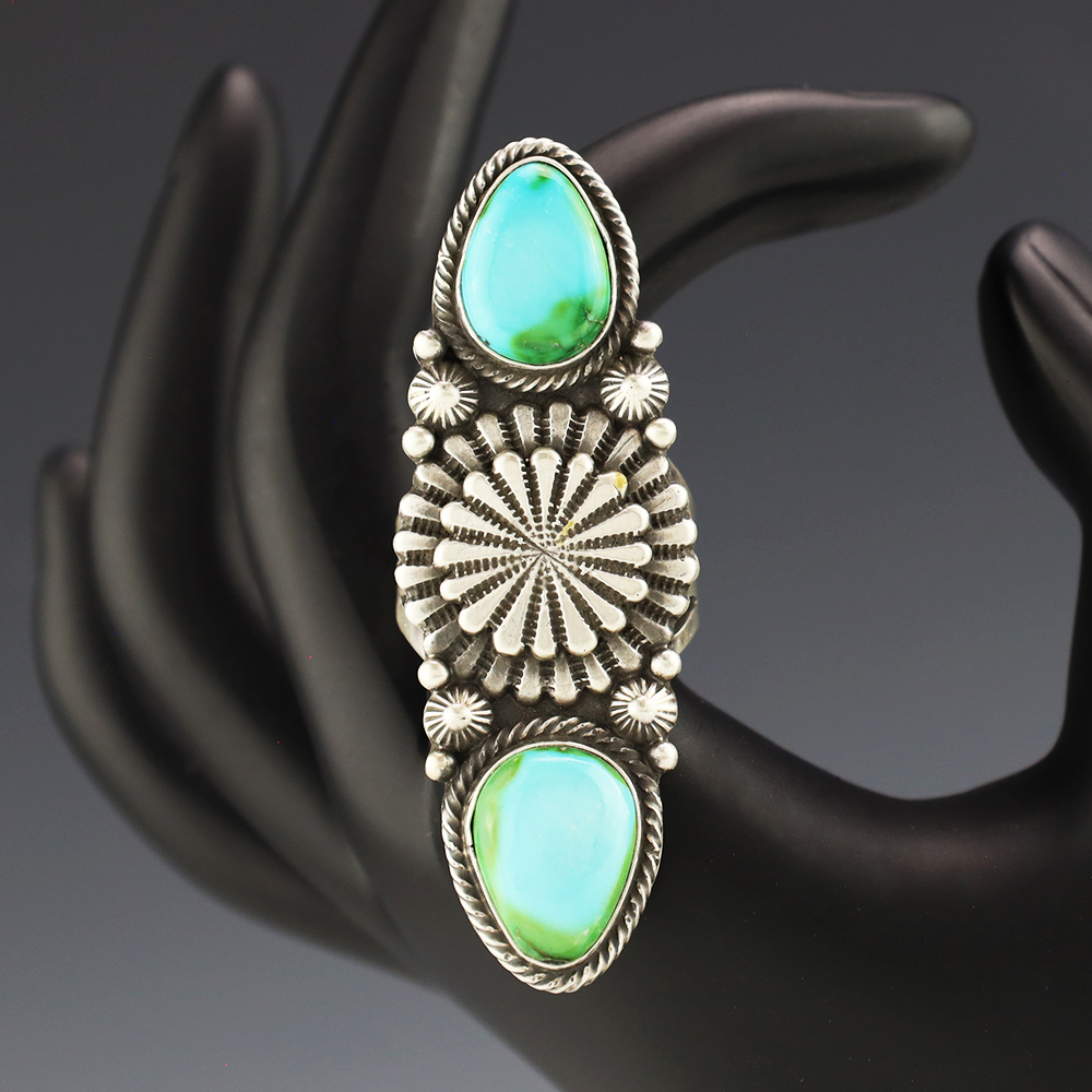 This wonderful ring was hand made by Navajo artist Tom Lewis. Sterling silver with Sonoran Gold Turquoise stones. It is a great representation of hand made Navajo jewelry. Size 9 1/2. Weighs 24 grams. Signed