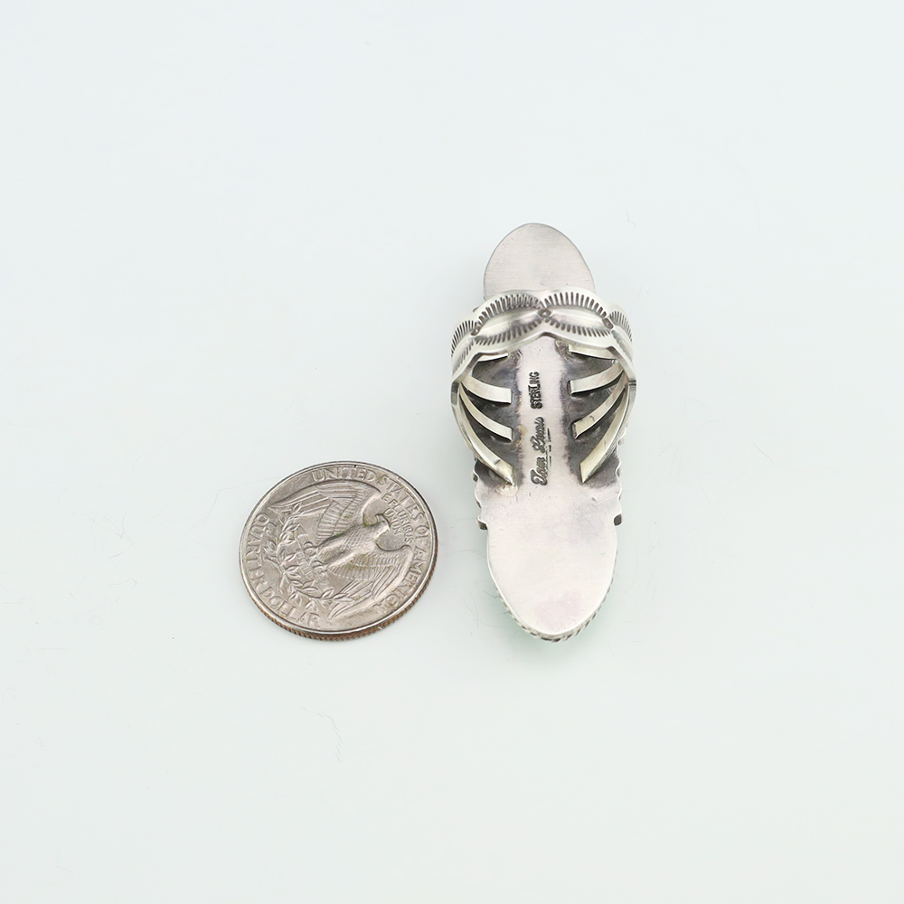Amazing inlay work! Zuni jewelry makers, Nancy and Sheldon Westika created this magnificent ring. Made out of sterling silver and inlaid with Kingman Turquoise and Jet. Zuni artists are known for their lapidary work. The Westikas have been making jewelry since the 1970’s and they are known for their fine...