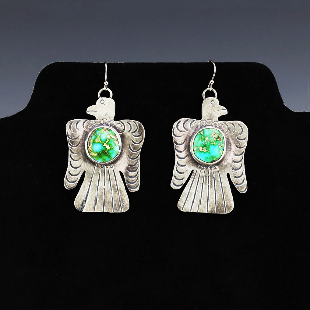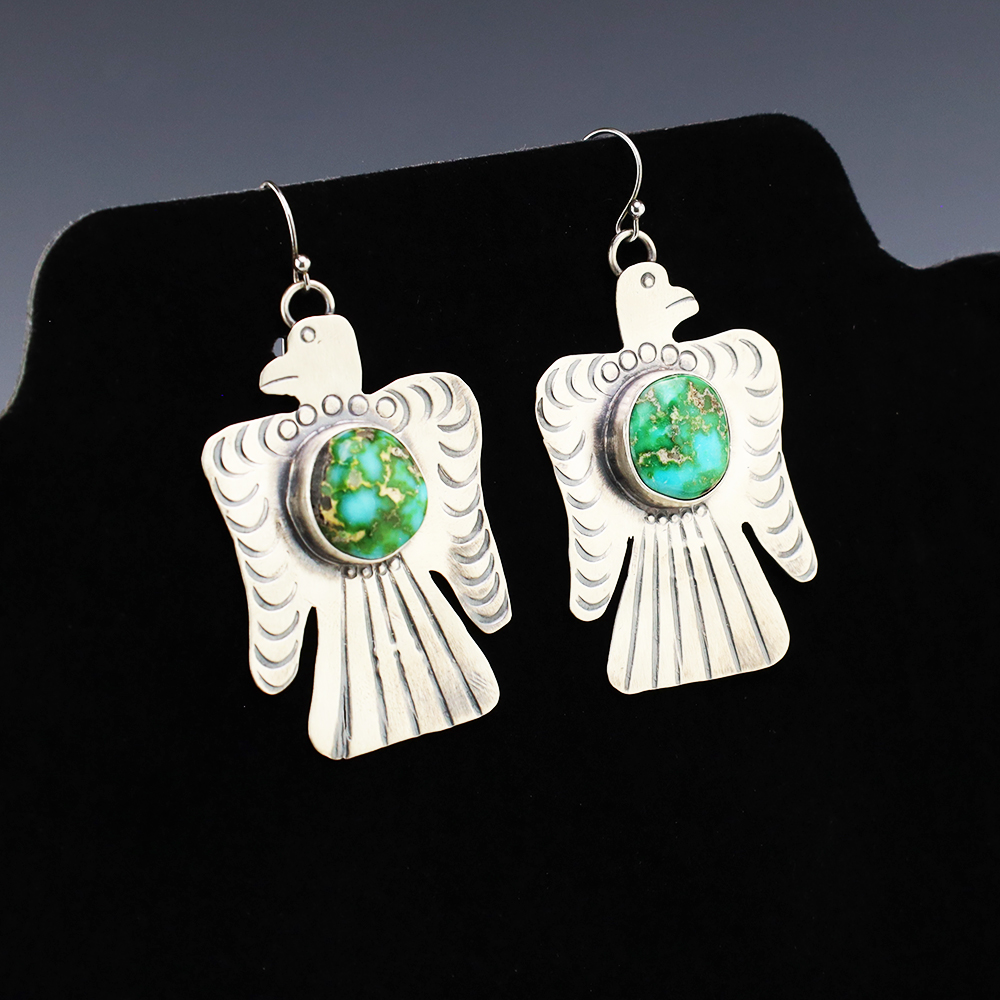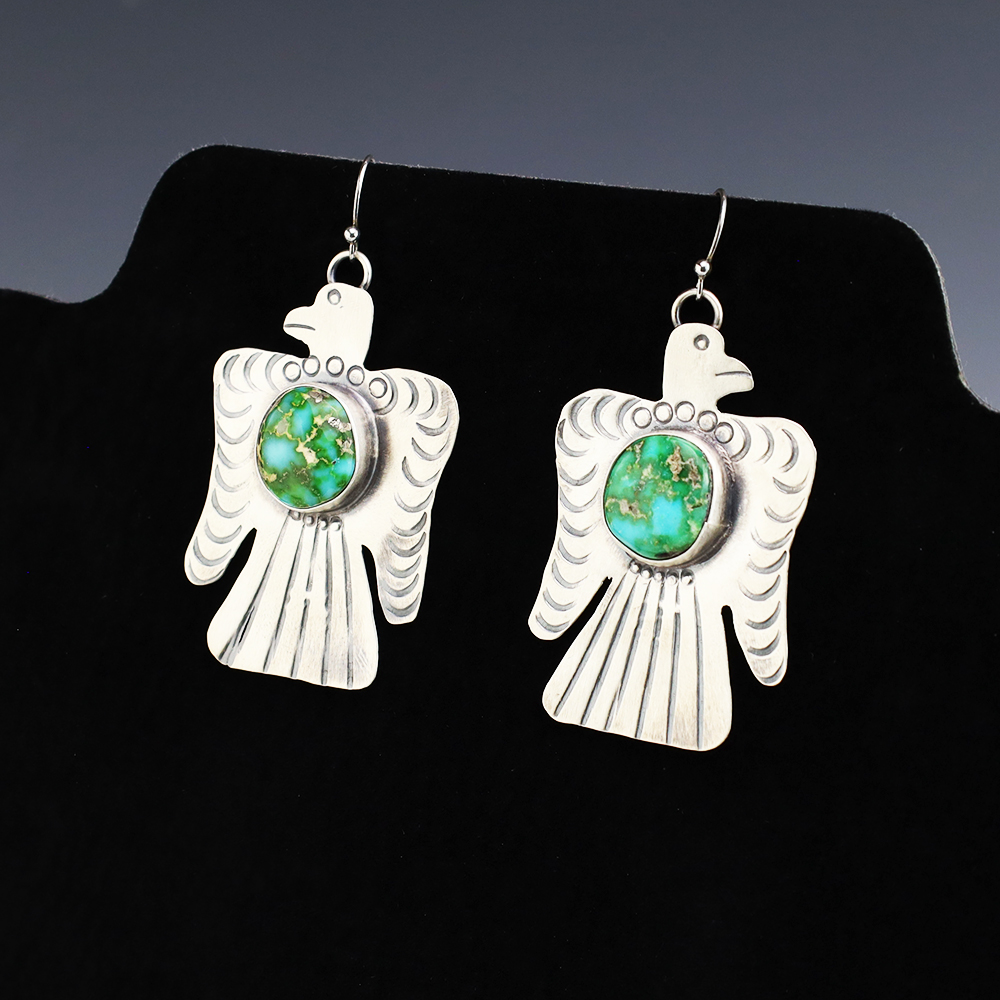 Beautiful Thunderbird earrings hand made out of sterling silver and Sonoran Gold Turquoise. These wonderful earrings will become a versatile accessory in your jewelry collection. Weighs 16 grams. Signed