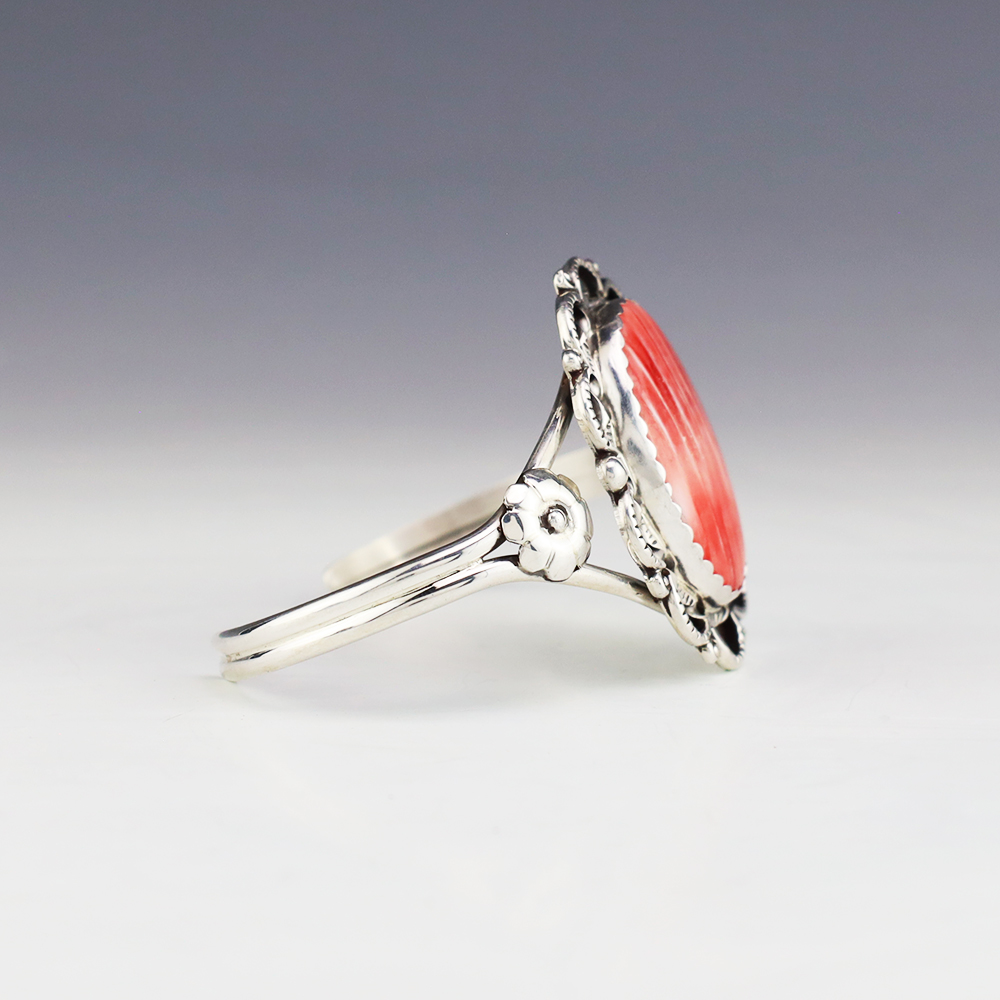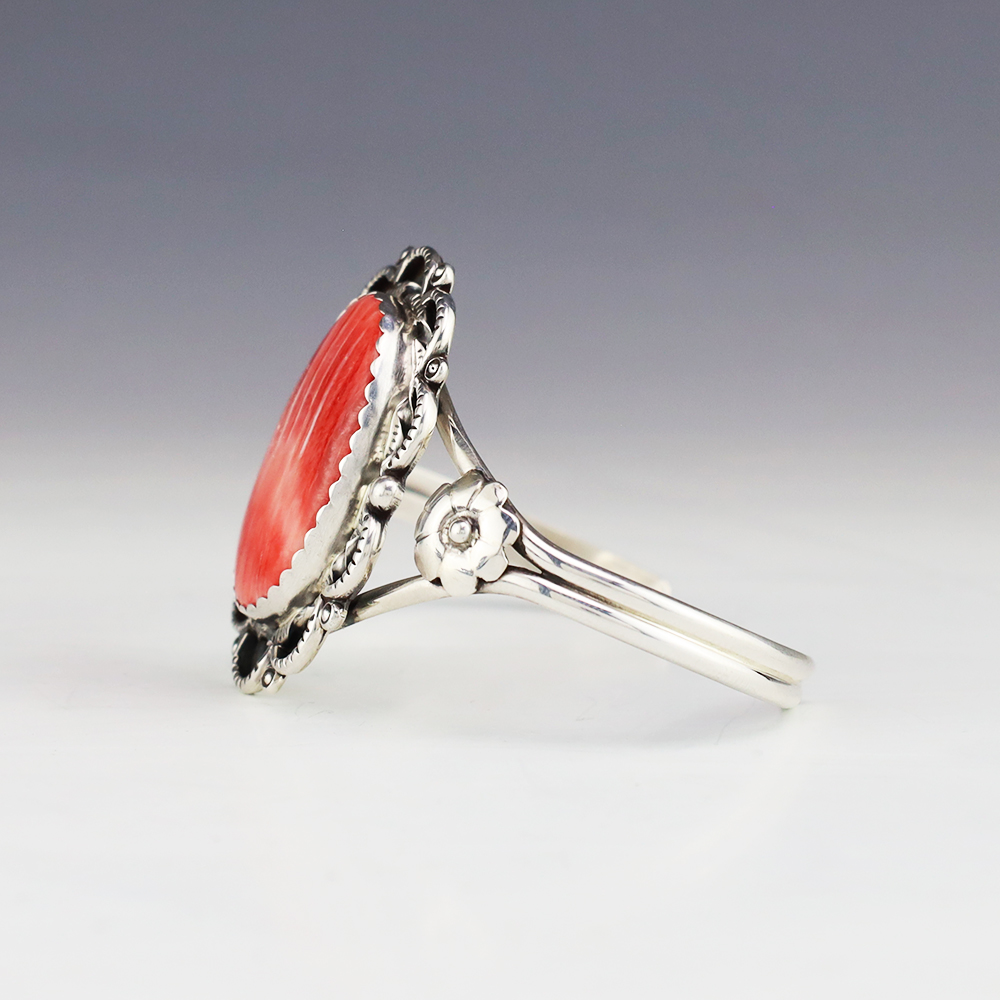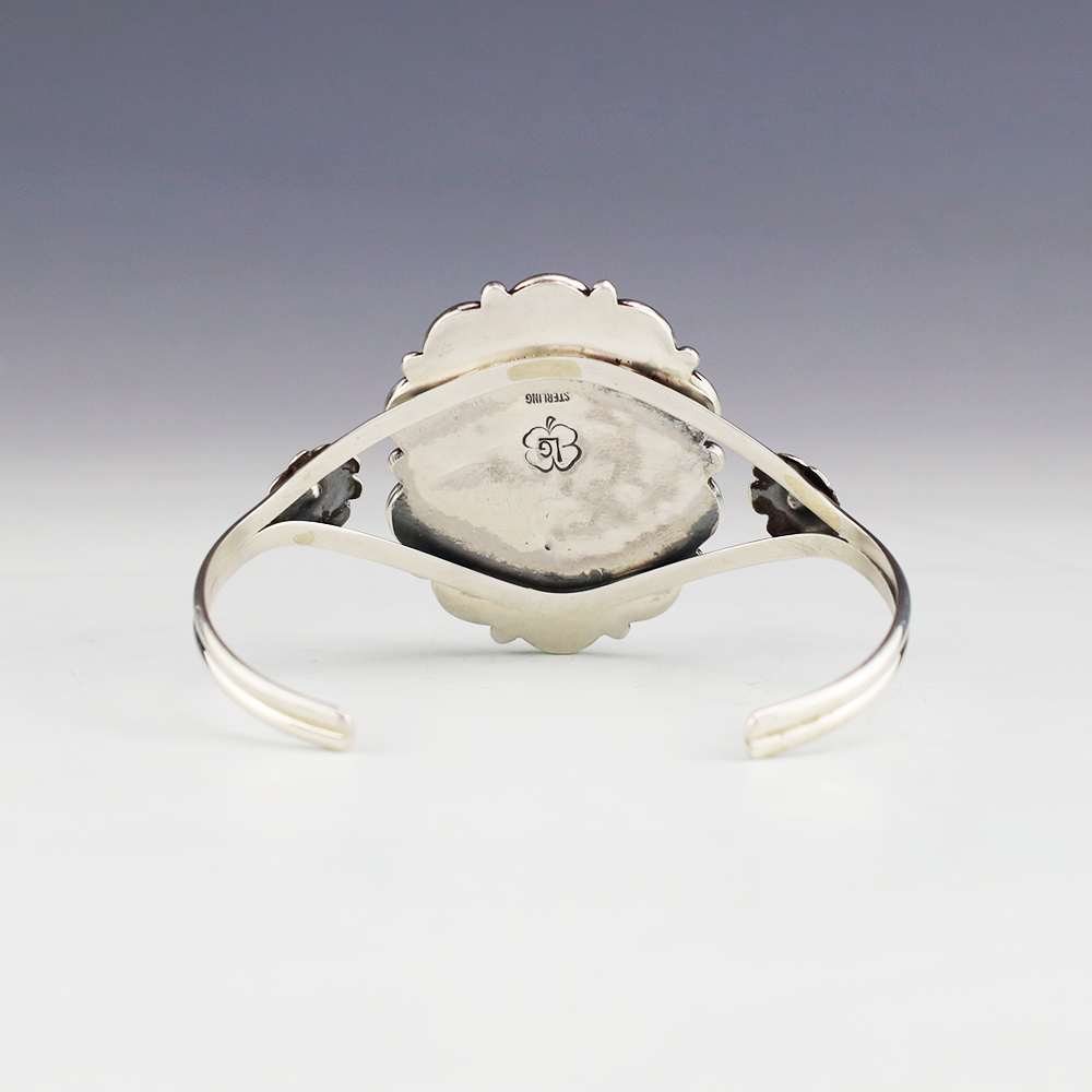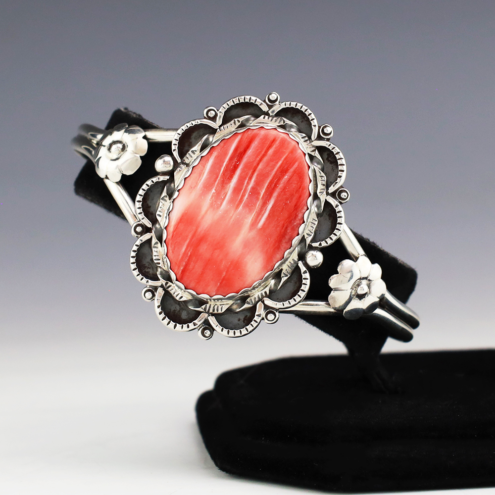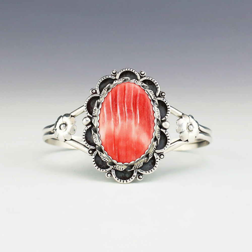 This timeless piece would be a great addition to your jewelry collection. Navajo silversmith Lyanne Goodluck created this gorgeous bracelet out of sterling silver and Spiny Oyster. The entire inner circumference is about 6 1/2”, including 1 1/16” opening (Fits a 6 1/2″ wrist). Weighs 22 grams. Signed.