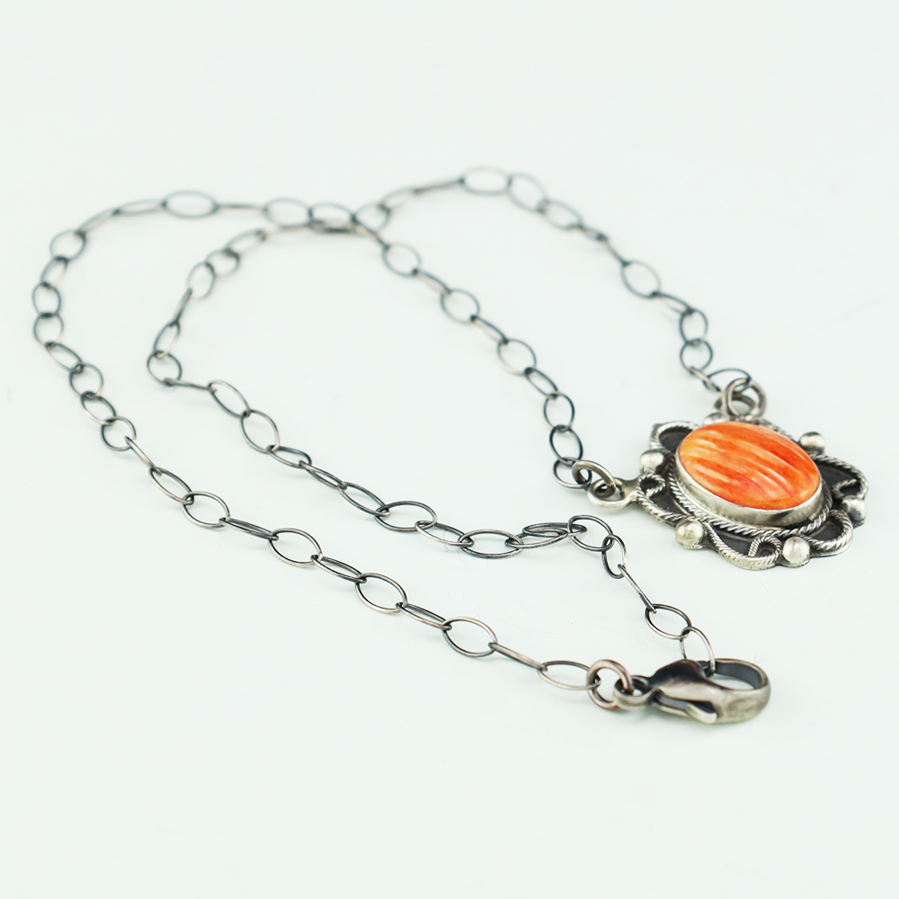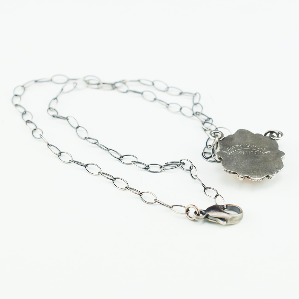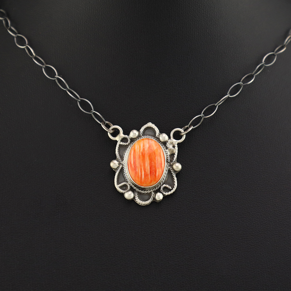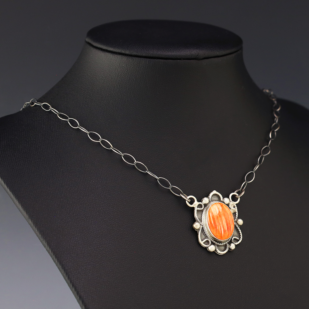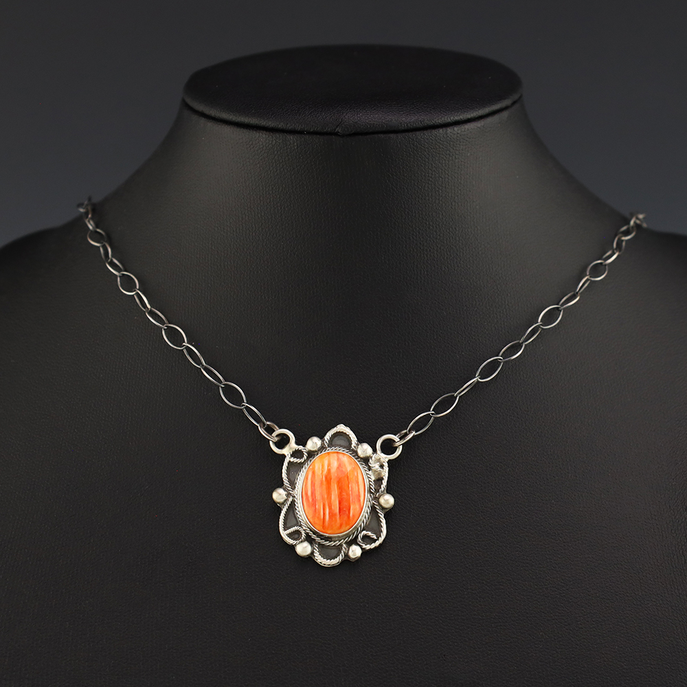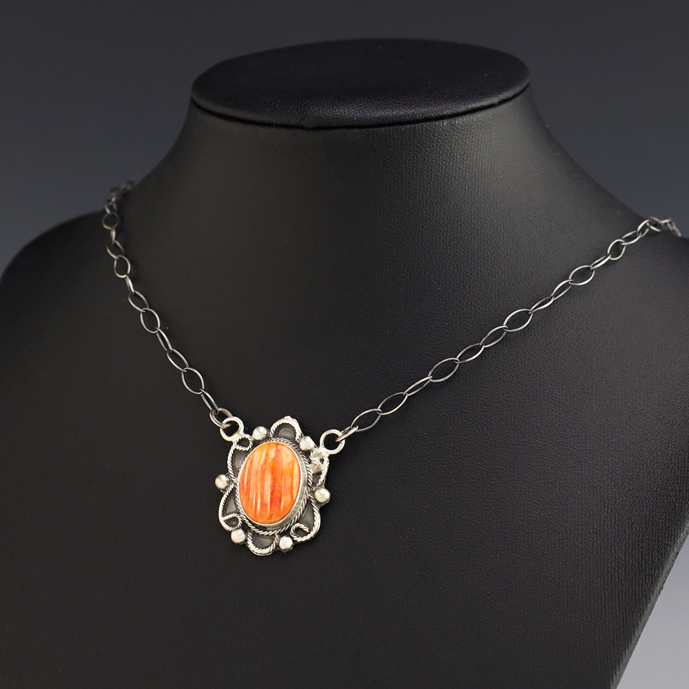 Navajo artist Jimmy Garcia made this beautiful necklace. Sterling silver with Spiny Oyster stones. This necklace will elevate your jewelry collection and is so versatile, it will look great with any outfit. Weighs 10 grams. Signed