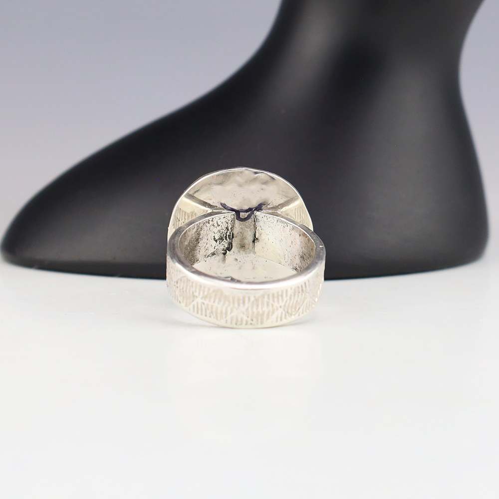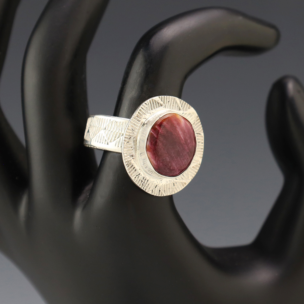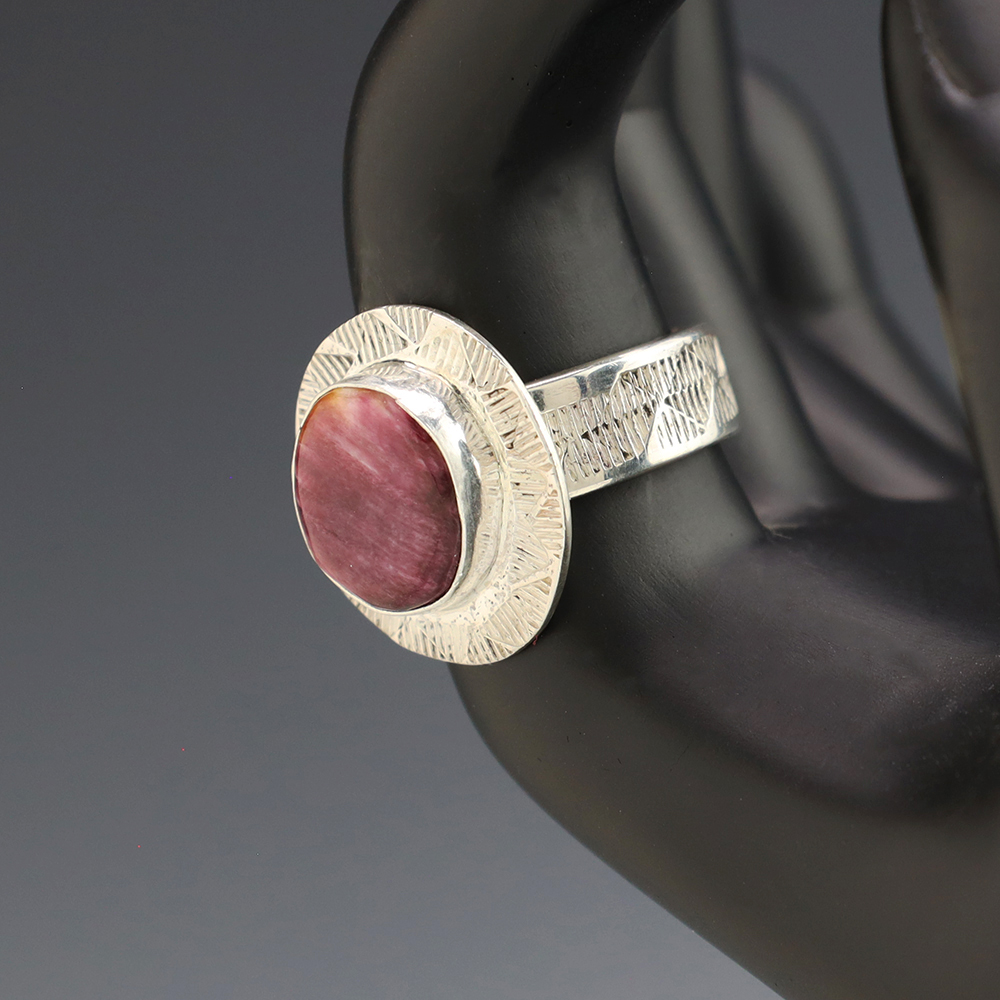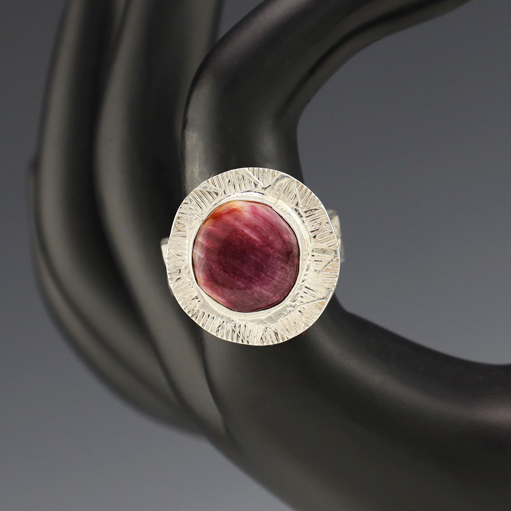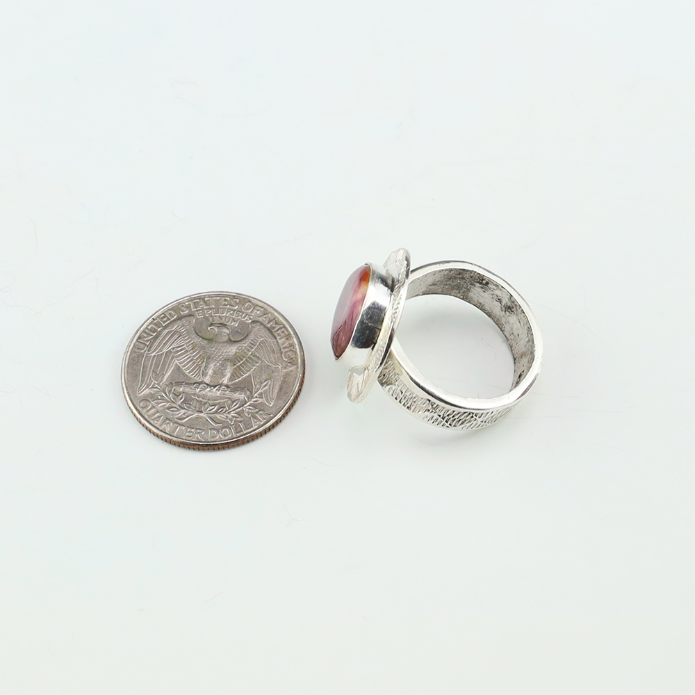 This ring is a great representation of hand made Navajo jewelry and will make a statement on your hand. A beautiful piece of Spiny Oyster is set into a sterling silver setting. Hand made by Navajo artist Jones Bahe. Weighs 10 grams. Size 8 1/2. Signed