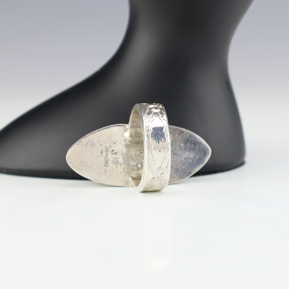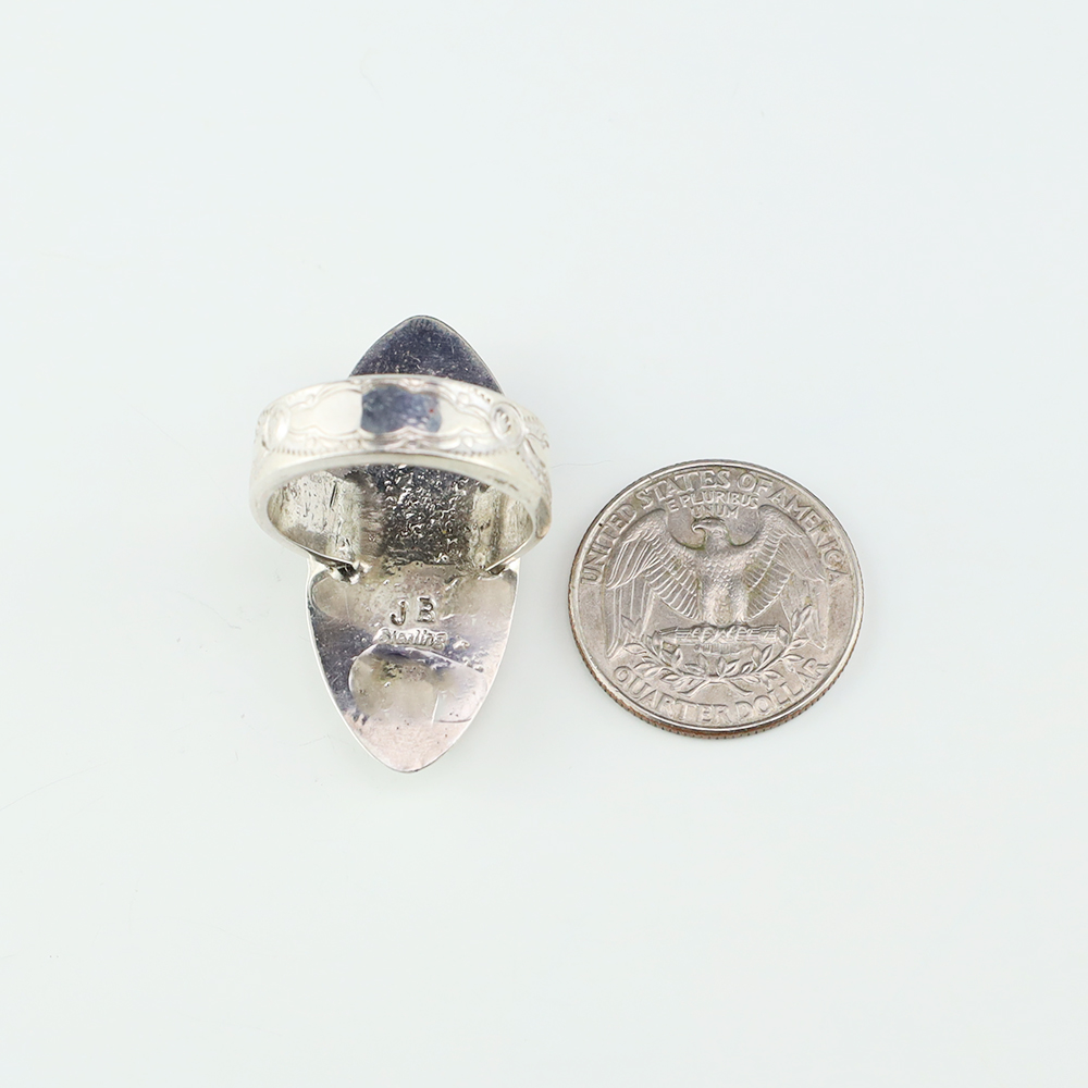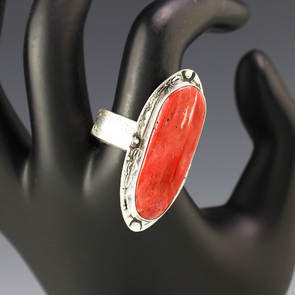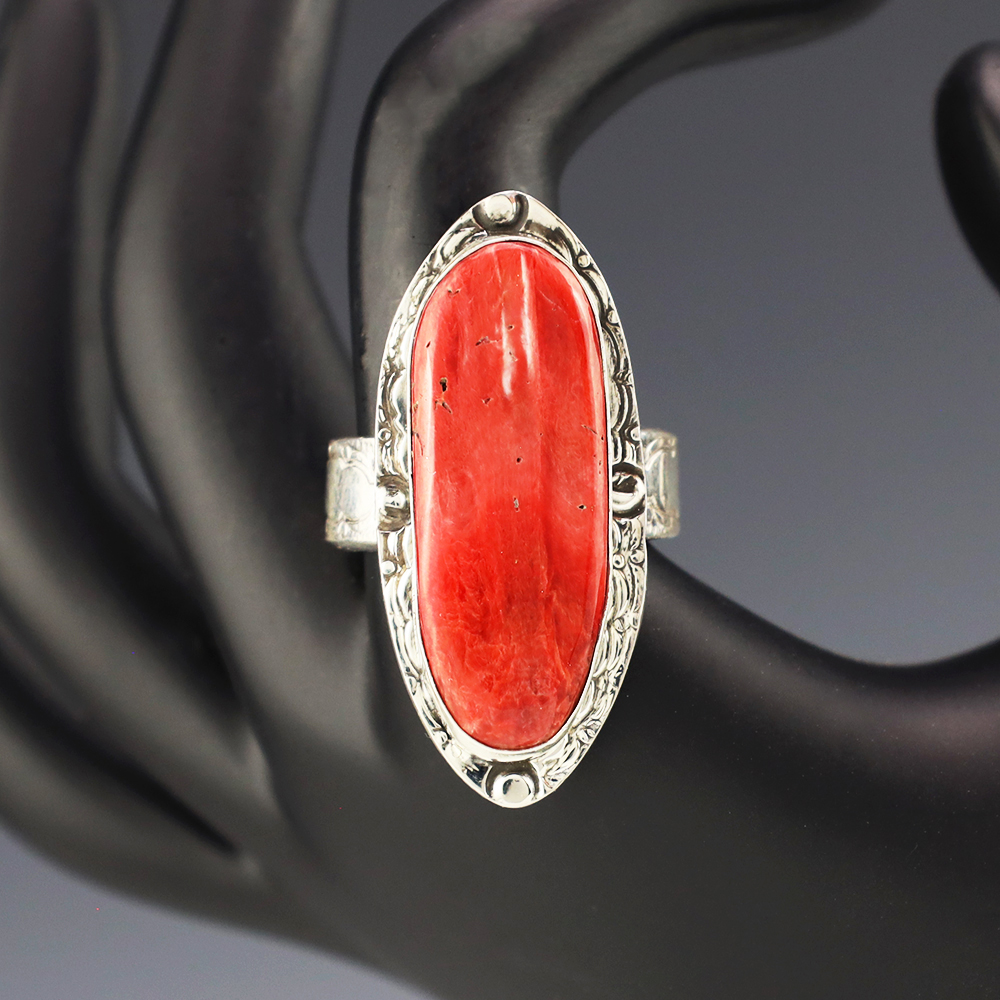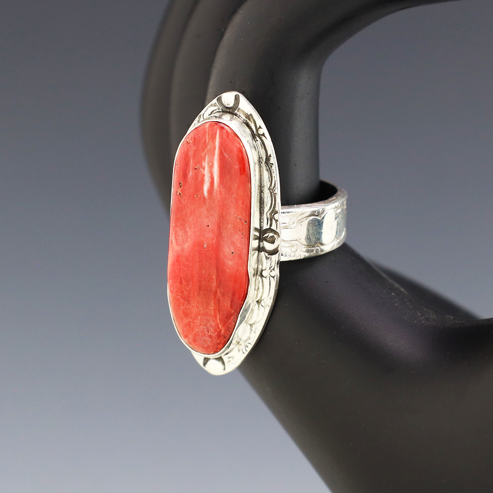 This ring is a great representation of hand made Navajo jewelry and will make a statement on your hand. A beautiful piece of Spiny Oyster is set into a sterling silver setting. Hand made by Navajo artist Jones Bahe. Weighs 14 grams. Size 9 1/2. Signed