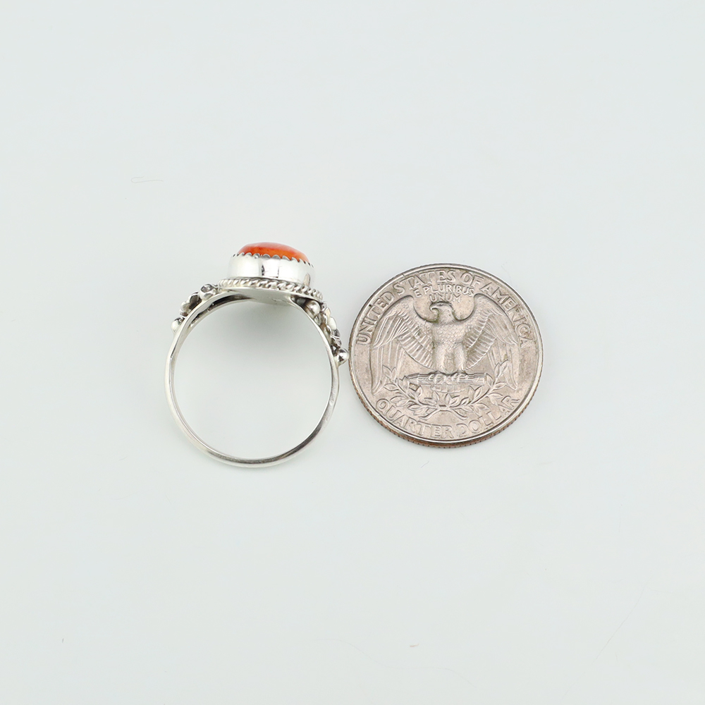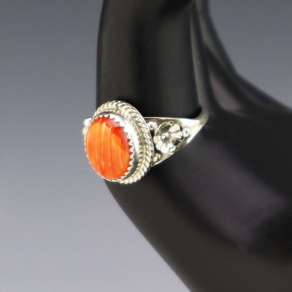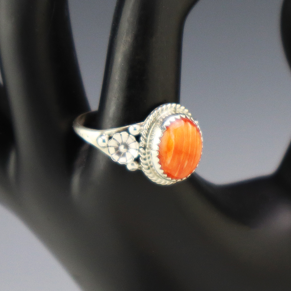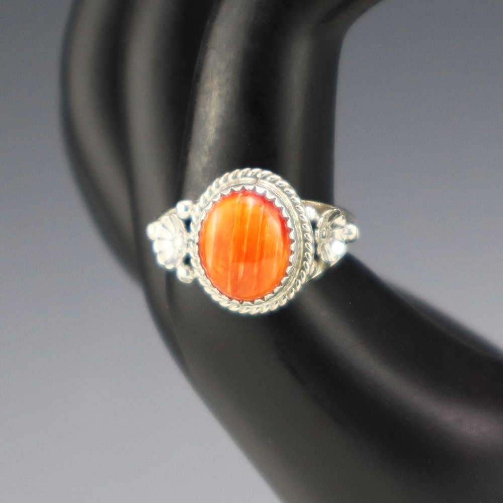 This ring is a great representation of hand made Navajo jewelry and will make a statement on your hand. Spiny Oyster is set into a sterling silver setting. Made by Navajo artist Priscilla Smith. Weighs 4 grams. Size 10.