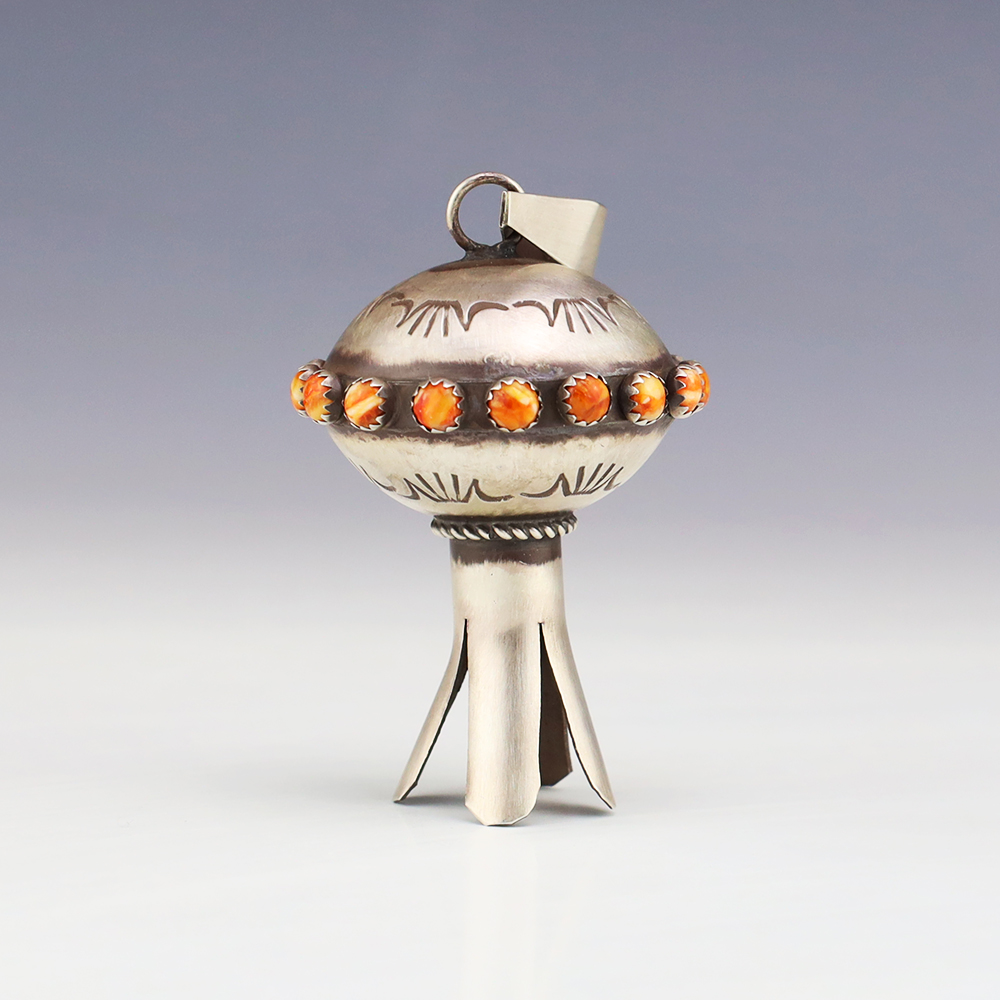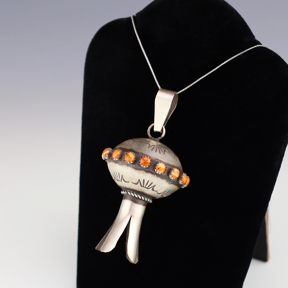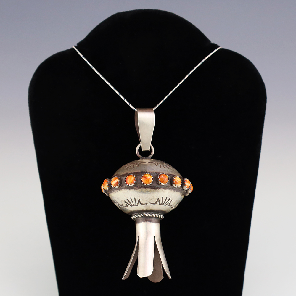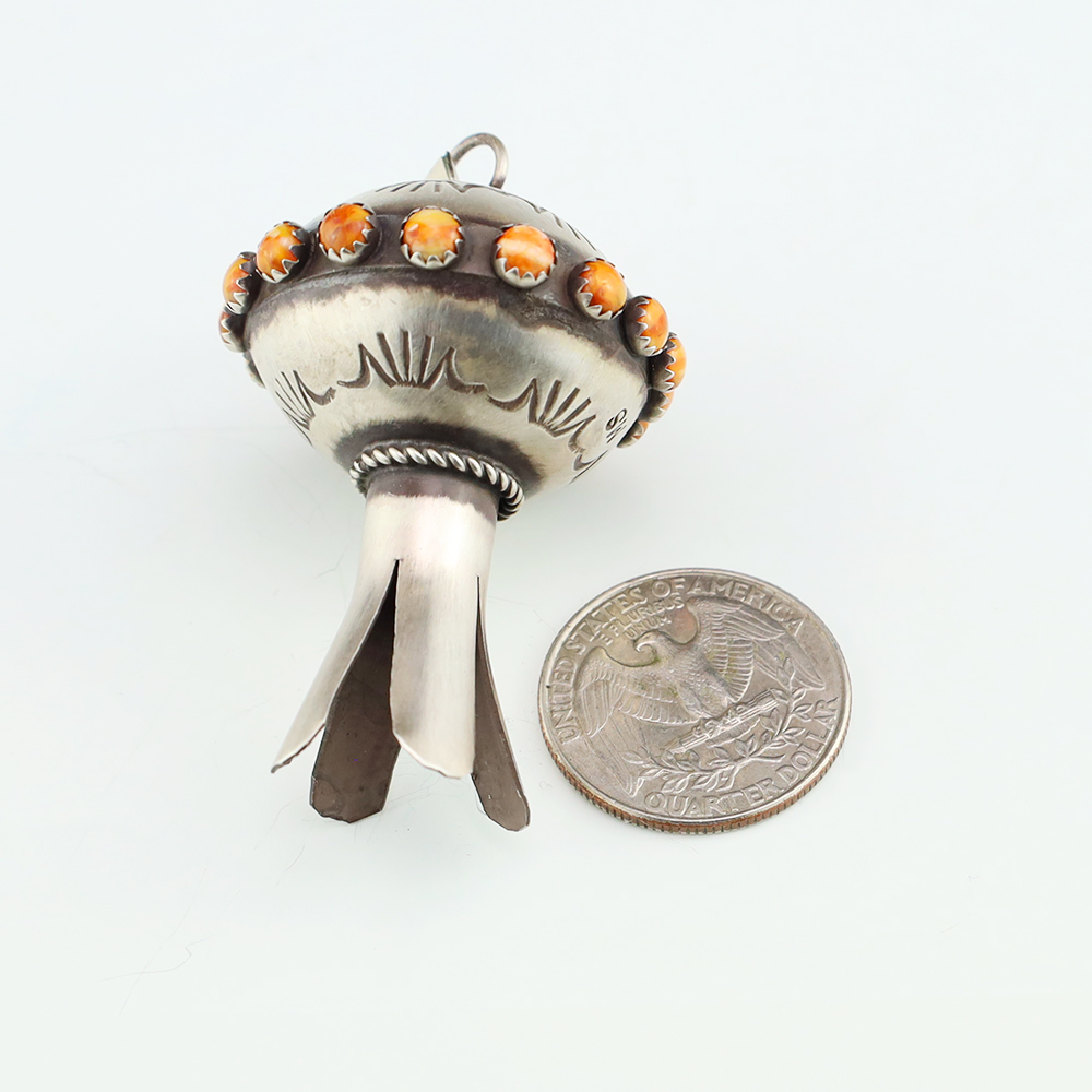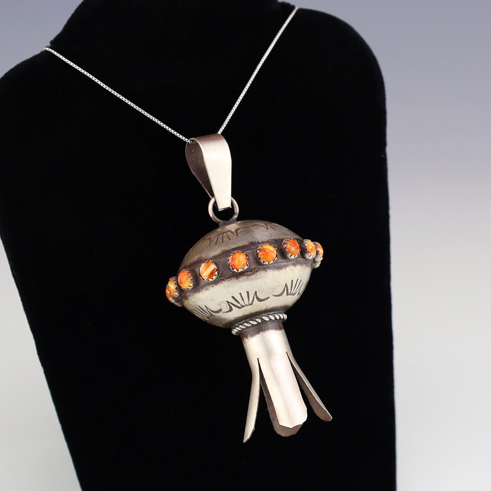 Navajo artist Monica Smith made this beautiful squash blossom pendant out of sterling silver and Spiny Oyster. It has a satin finish. A timeless beauty that you will enjoy for years to come. Weighs 16 grams. Signed.