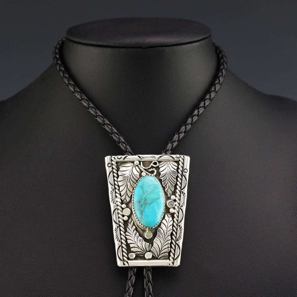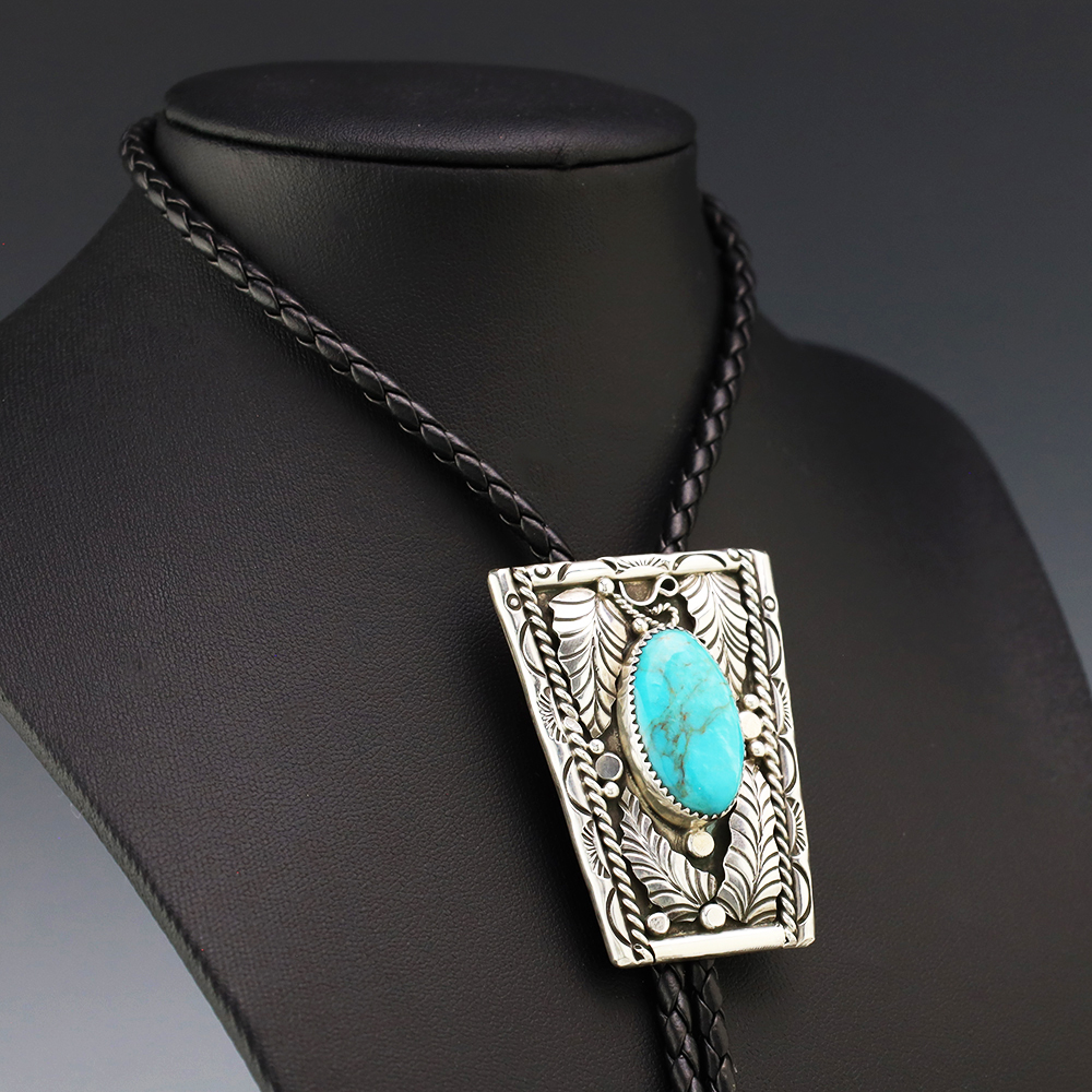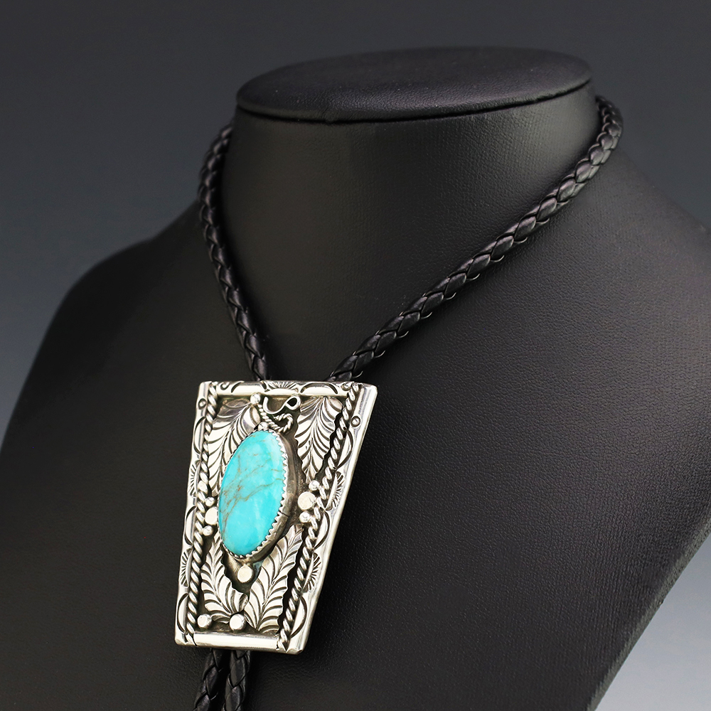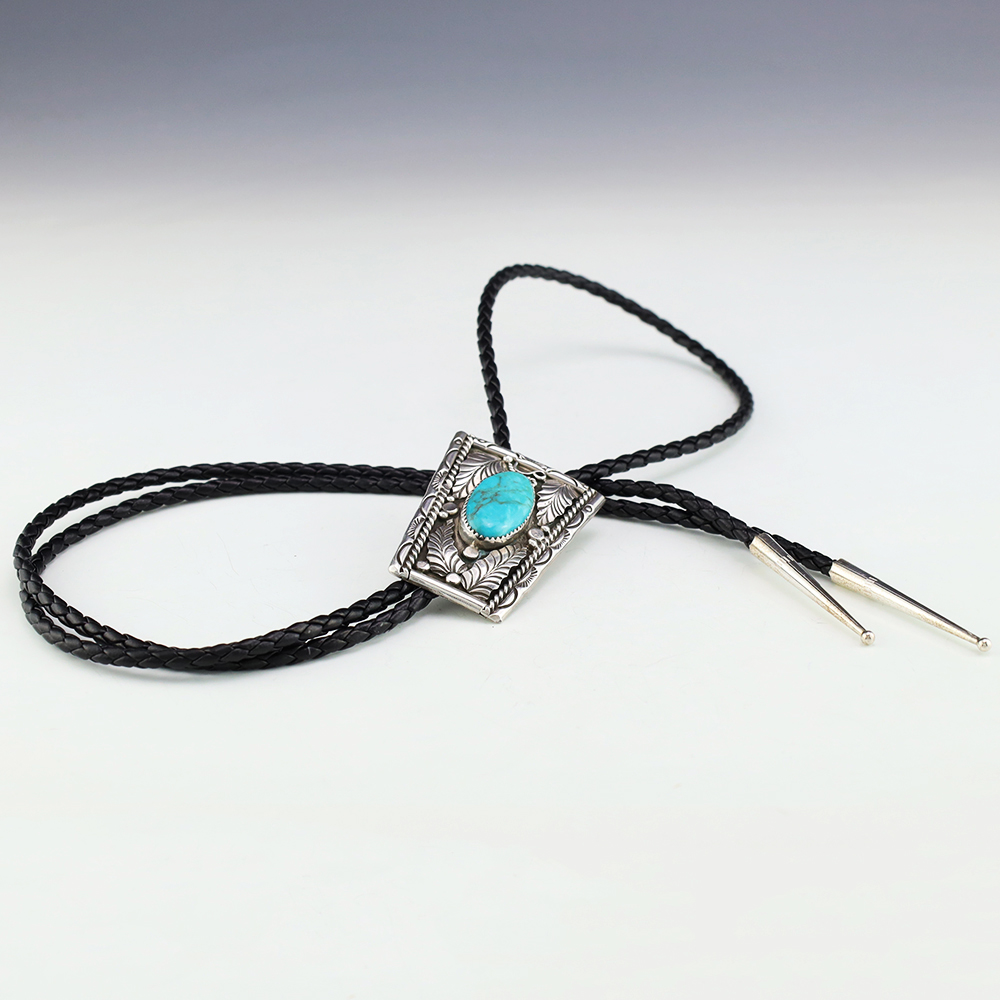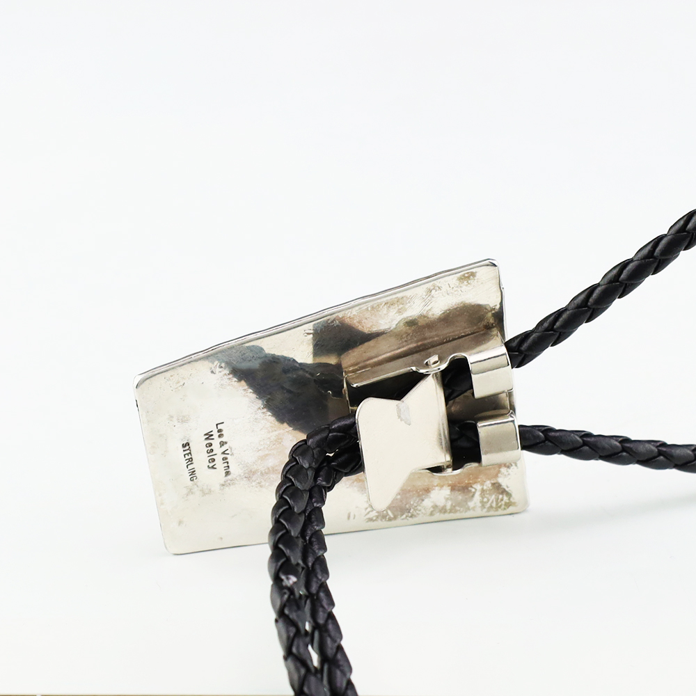 Navajo artists Lee and Verna Wesley hand made this wonderful bolo tie. Sterling silver with a Turquoise stone. This attractive bolo will look great with any outfit. Weighs 42 grams. Signed.