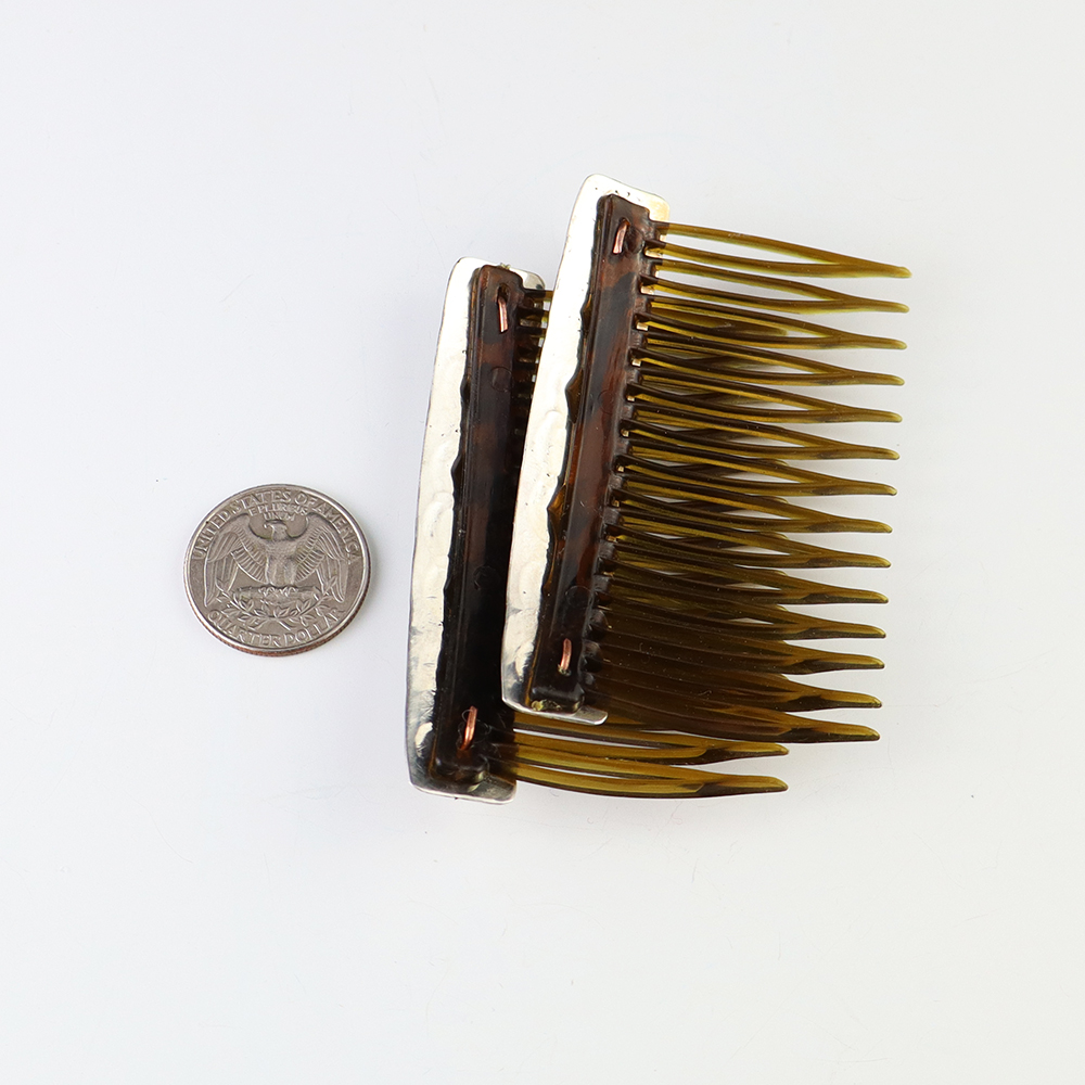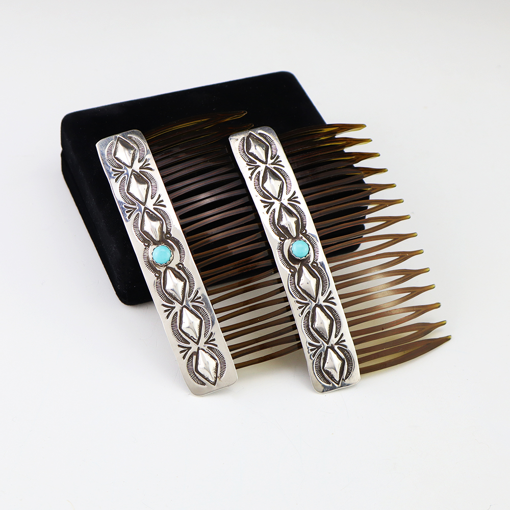 Great stamp work! Lovely combs made out of sterling silver and Turquoise by Navajo artist Jennie Blackgoat. Great representation of Navajo silver work. Weighs 14 grams.