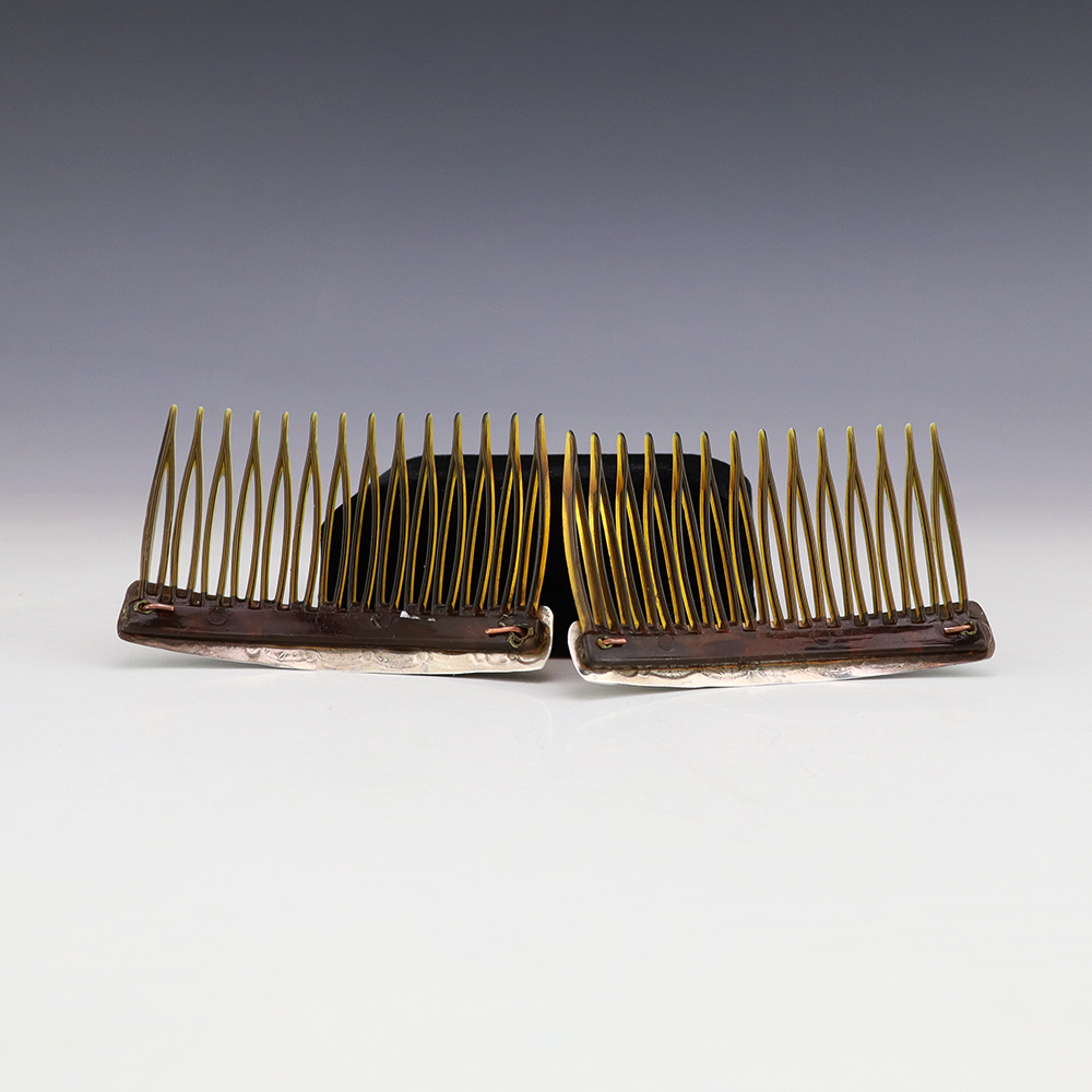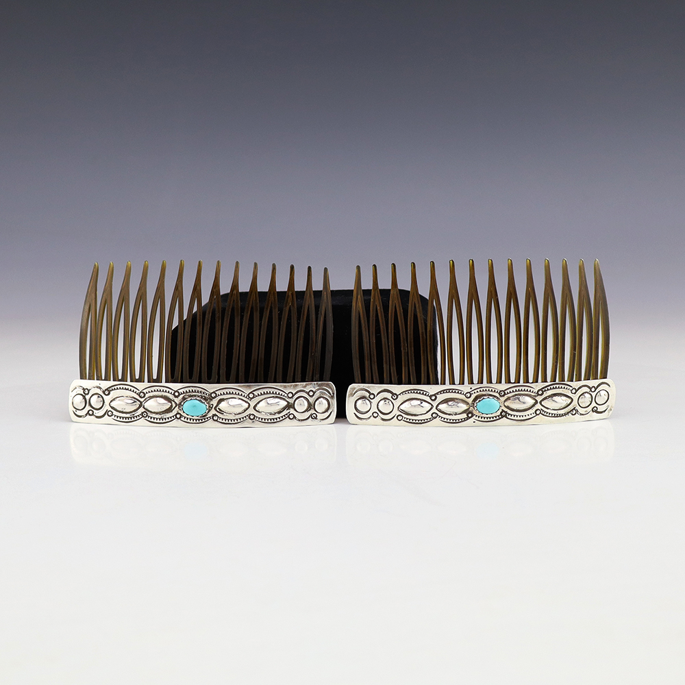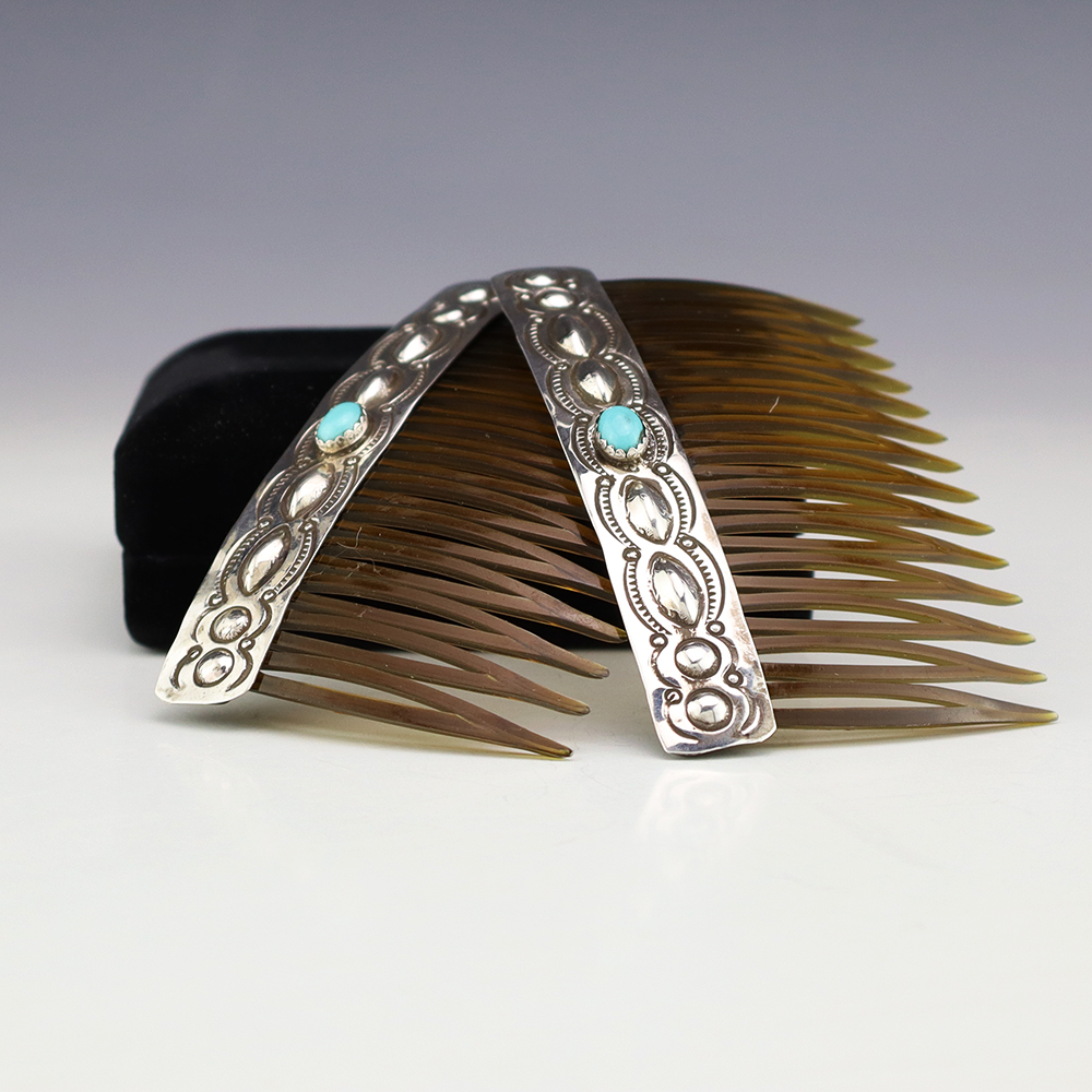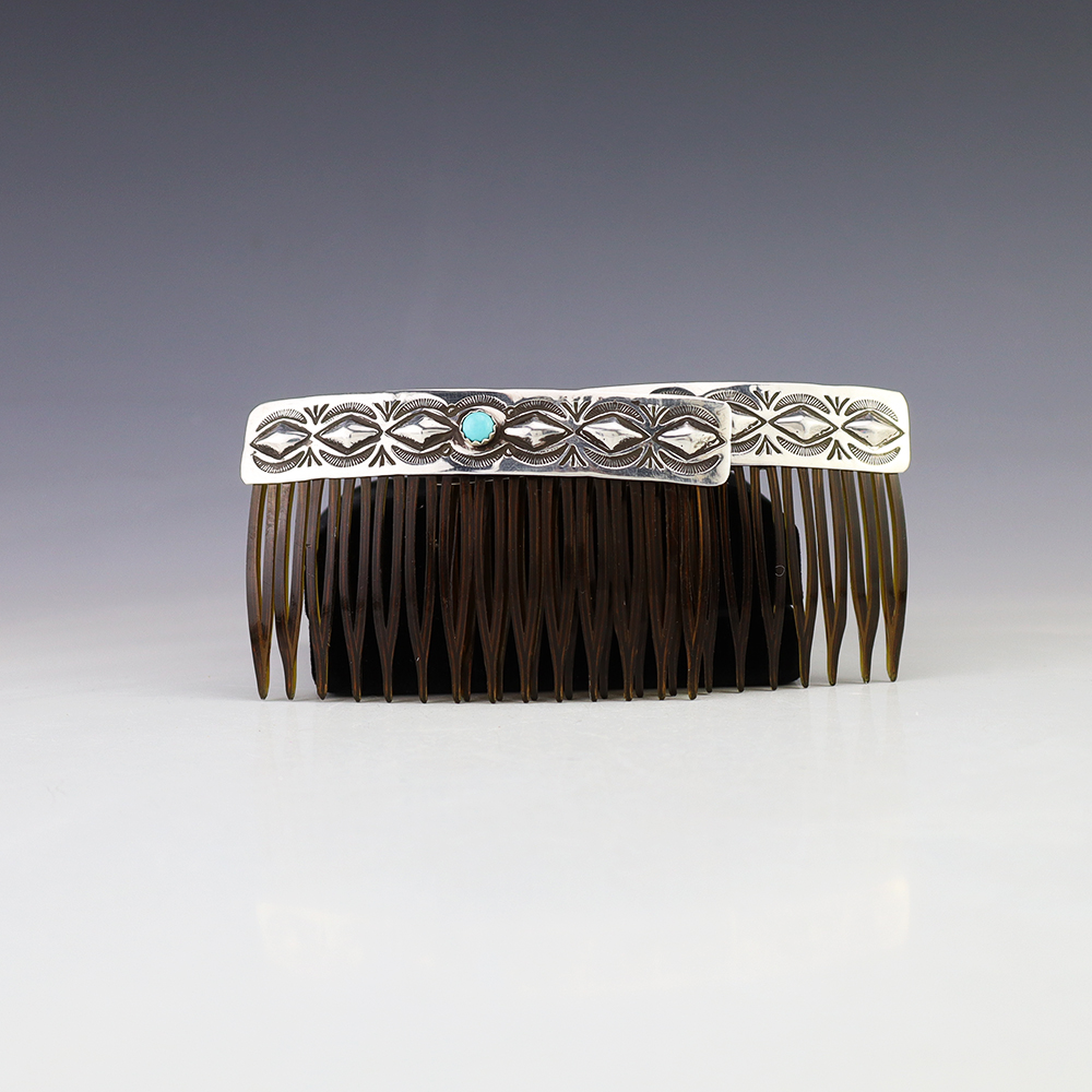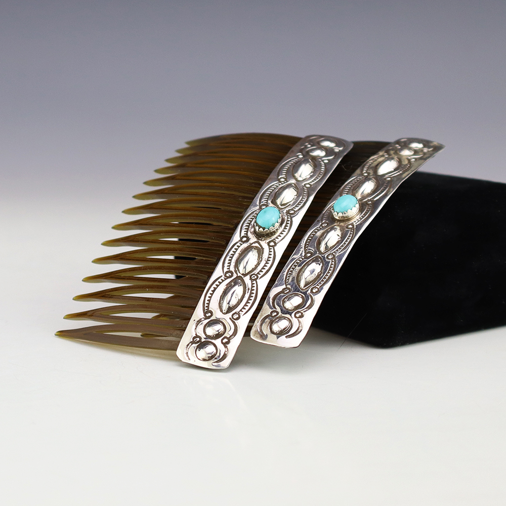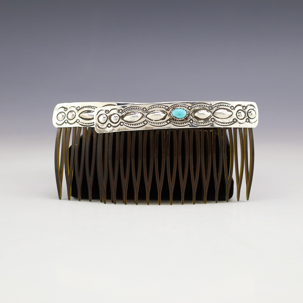 Great stamp work! Lovely combs made out of sterling silver and Turquoise by Navajo artist Jennie Blackgoat. Great representation of Navajo silver work. Weighs 14 grams.