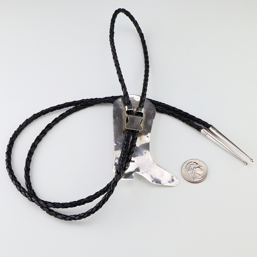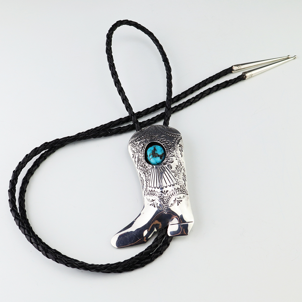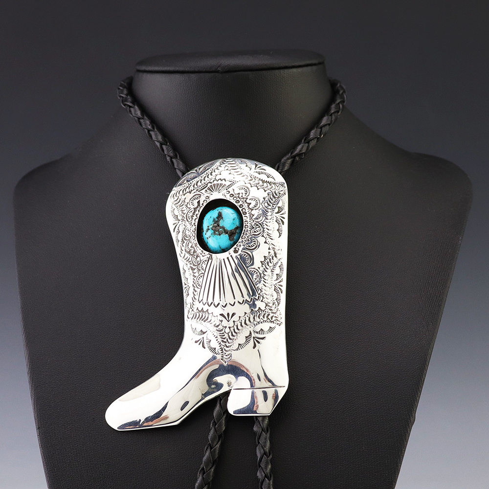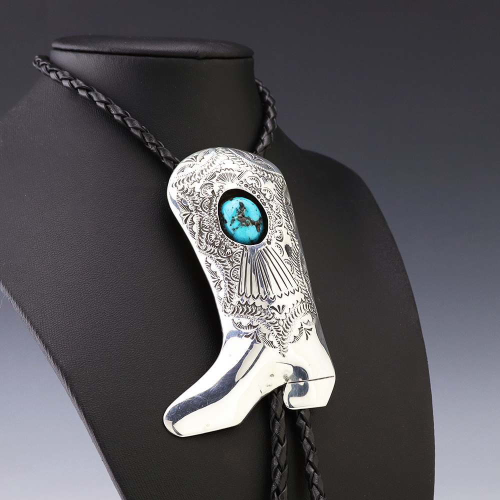 Navajo artist Shirley Skeets made this wonderful sterling silver and Turquoise cowboy boot bolo. Great design! Weighs 46 grams