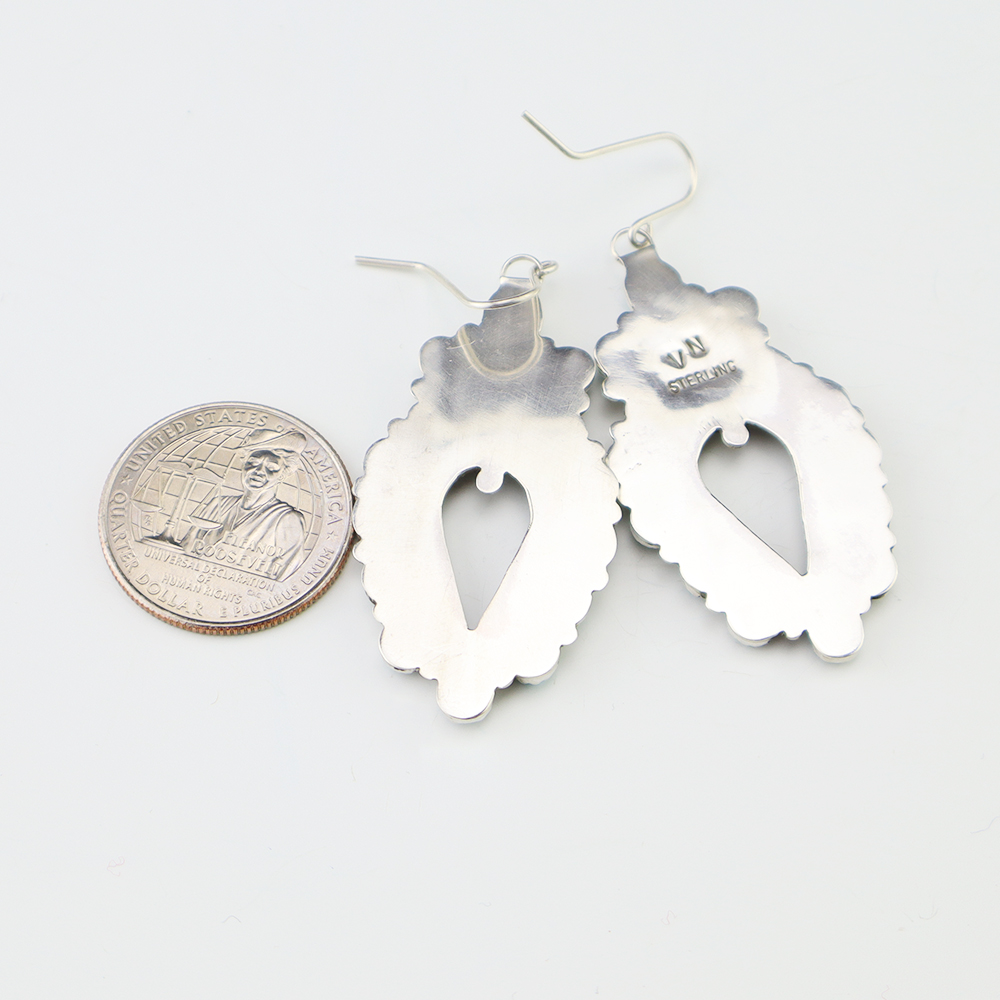 Gorgeous earrings hand made out of sterling silver and turquoise. Hand made by Navajo silversmiths Eva and Linberg Billah. These fabulous earrings will become a versatile accessory in your jewelry collection. Weighs 14 grams. Signed. 1 1/8″ x 1 3/4″ With ear wires are 2 1/4” in length. The Navajos...