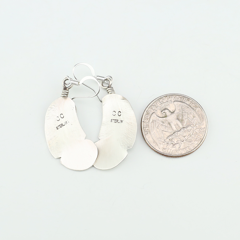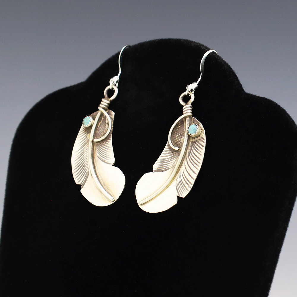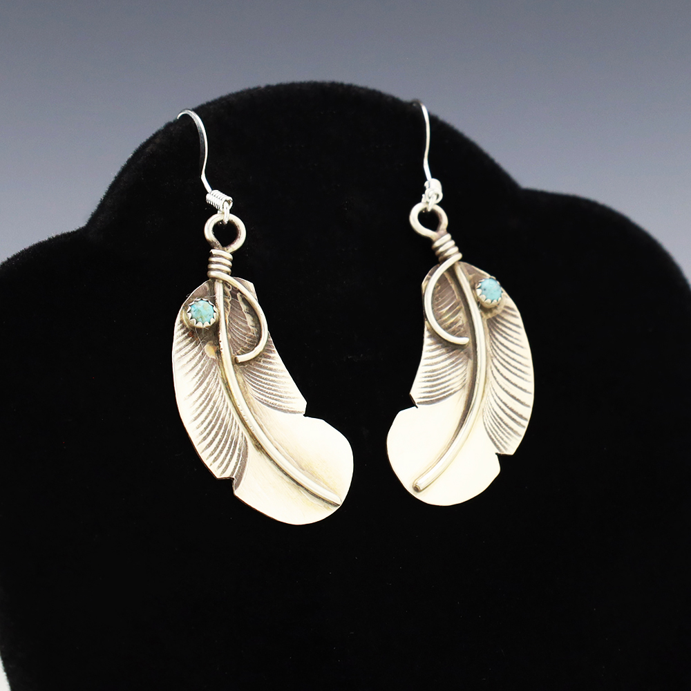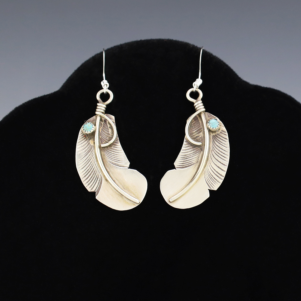 Beautiful feather earrings hand made out of sterling silver and Turquosie. Hand made by Navajo silversmith Chris Charley. These fabulous earrings will become a versatile accessory in your jewelry collection. Weighs 4 grams. Signed