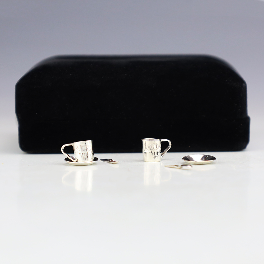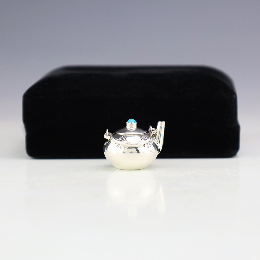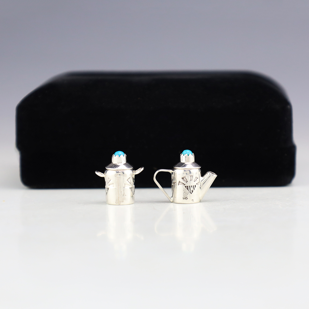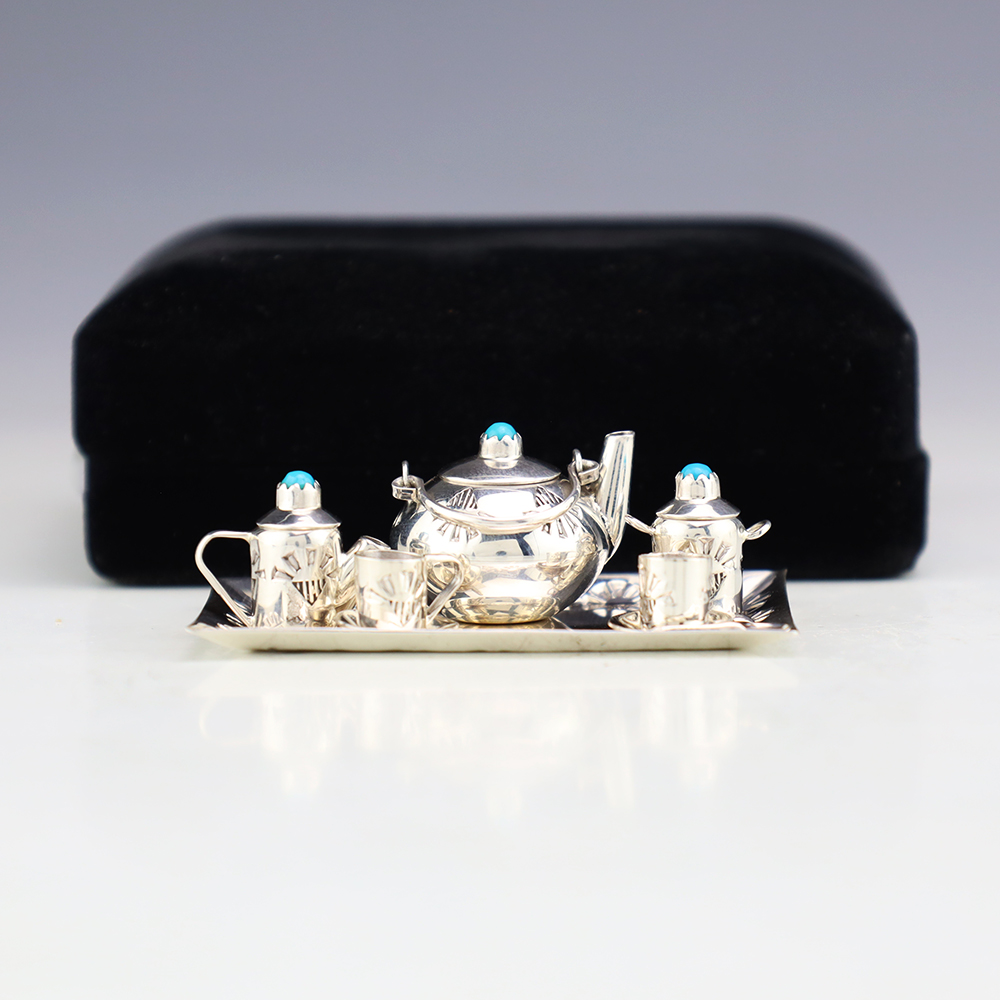 This marvelous sterling silver and Turquoise miniature tea set was hand crafted by Navajo silversmith Wesley Whitman. The set includes; a tray, teapot, creamer, sugar, two plates, two cups, and two spoons. Great stamp work! Weighs 14 grams. Signed