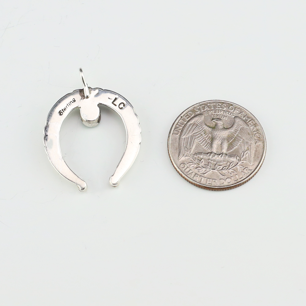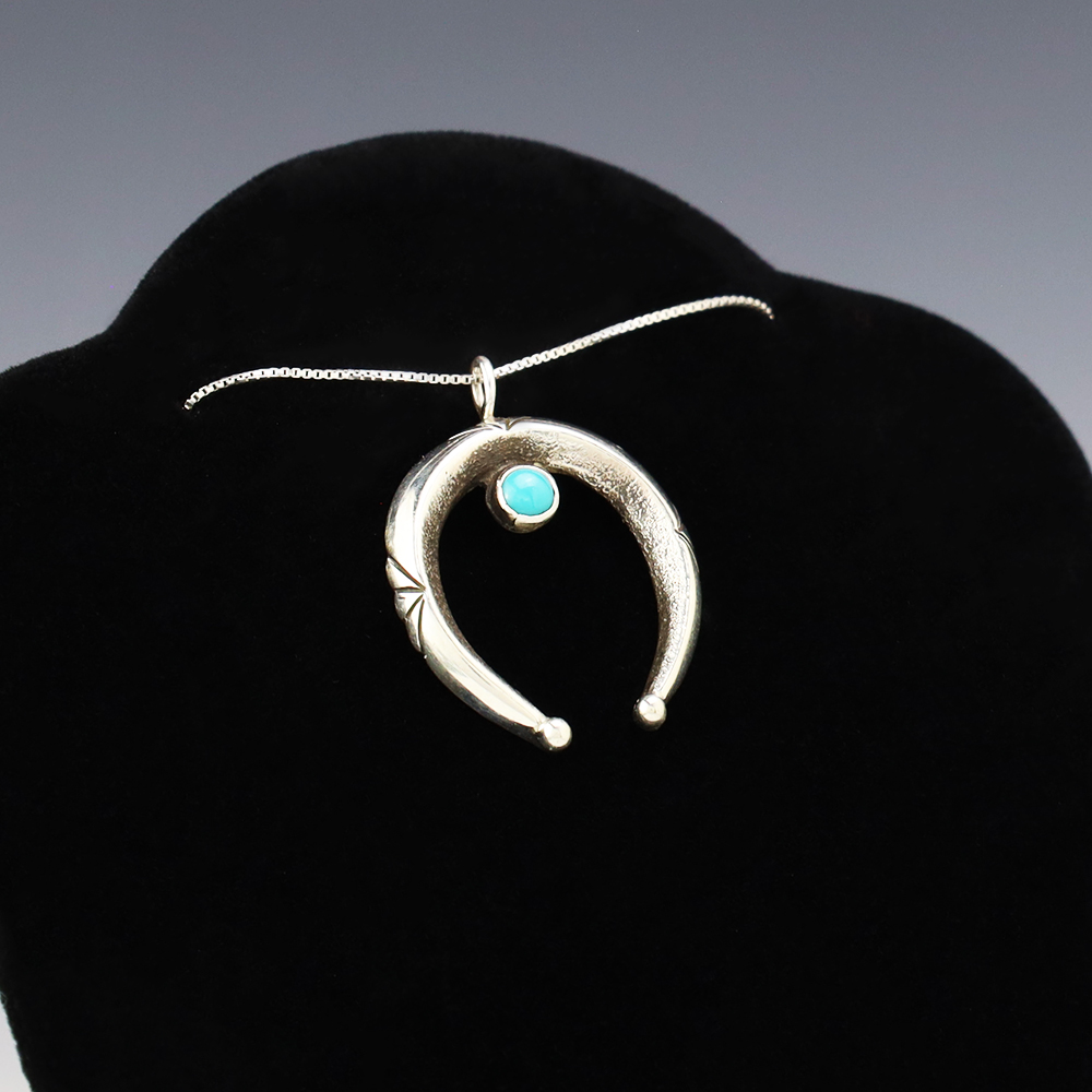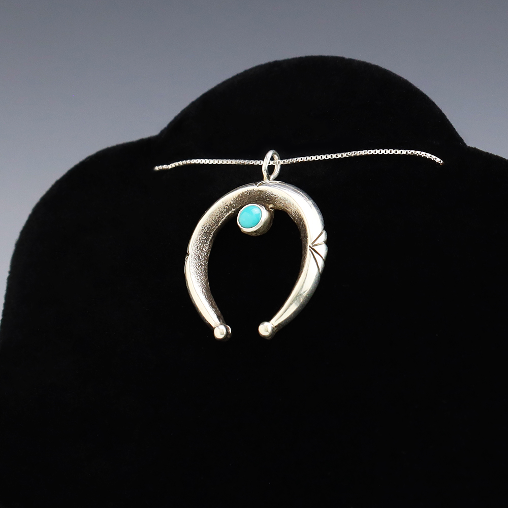 Wonderful sterling silver and Turquoise naja pendant by Navajo artist Lee Charley. A timeless beauty that you will enjoy for years to come. Weighs 6 grams. Signed (Chain not included)