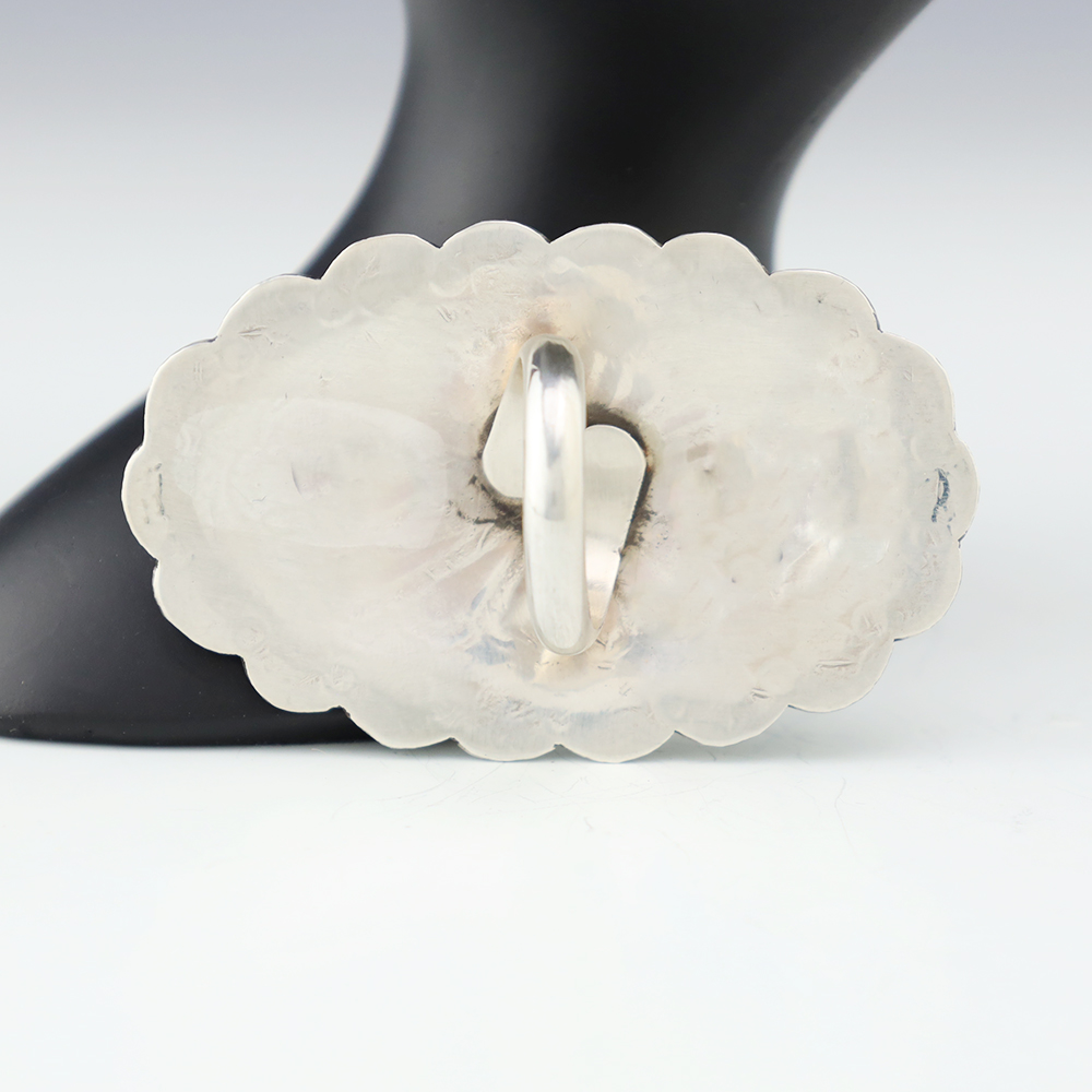 Zuni jewelry makers, Nancy and Sheldon Westika created this exquisite buckle. Made out of sterling silver and inlaid with natural Kingman Turquoise and Mother of Pearl Shell. Zuni artists are known for their lapidary work. The Westikas have been making jewelry since the 1970’s and they are known for their...