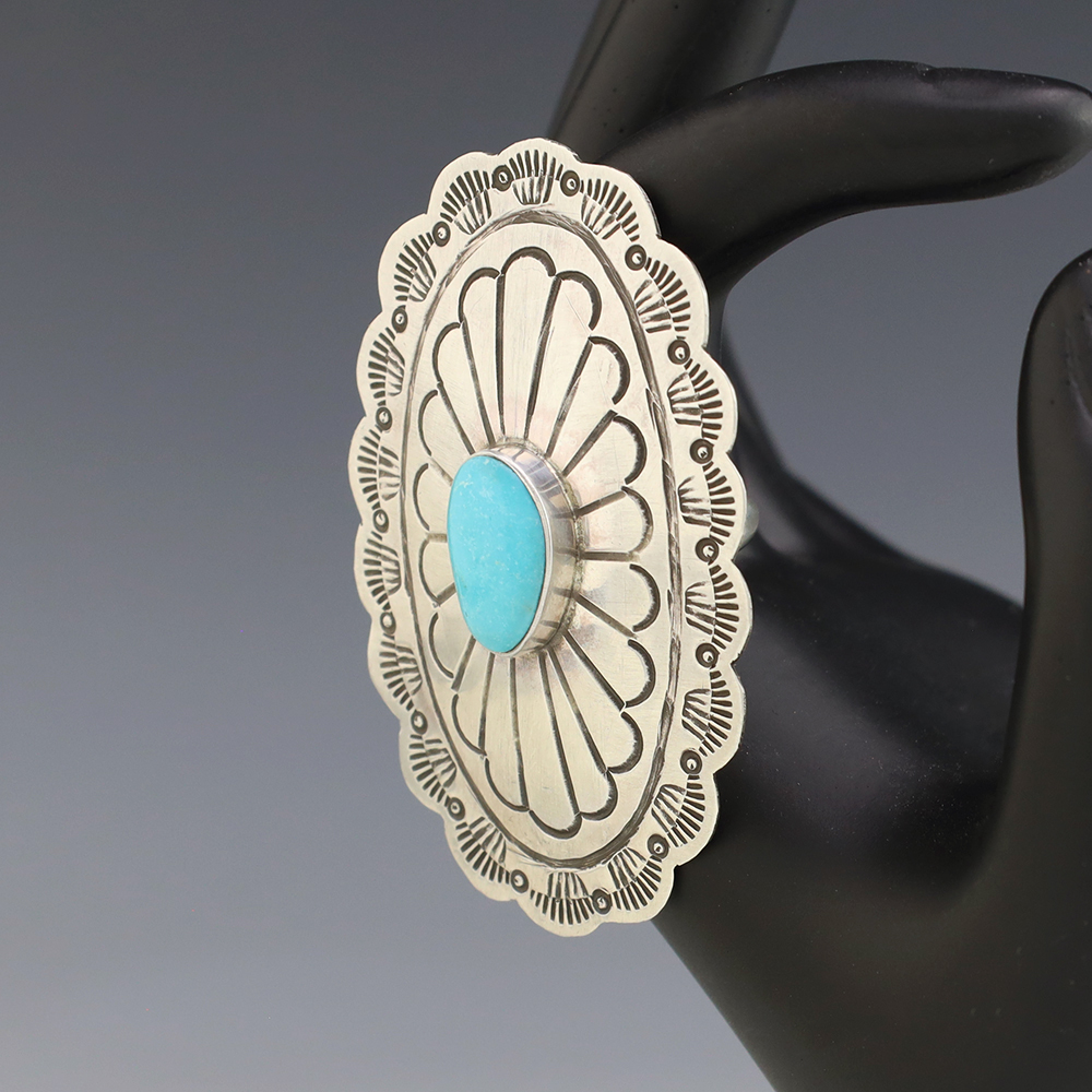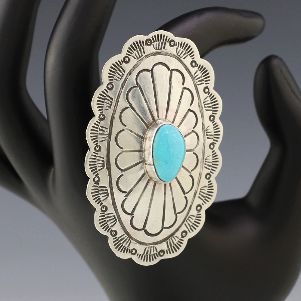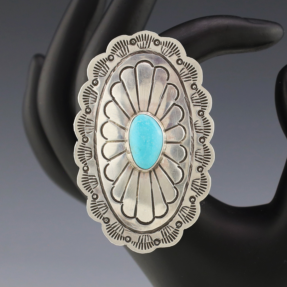 This beautiful ring was hand made by Navajo artist Geraldine James. Sterling silver with a Turquoise stone. It is a great representation of hand made Navajo jewelry. Size 8 and slightly adjustable. Weighs 18 grams. Signed