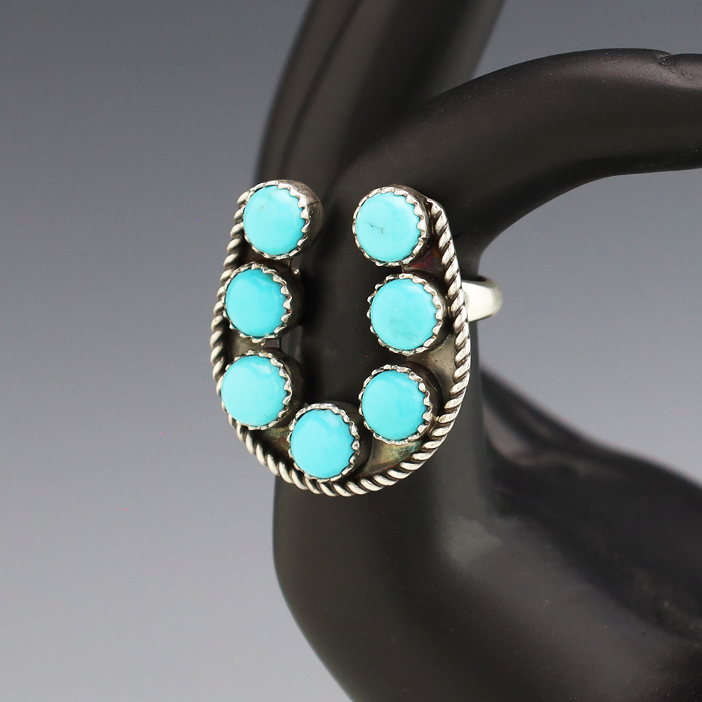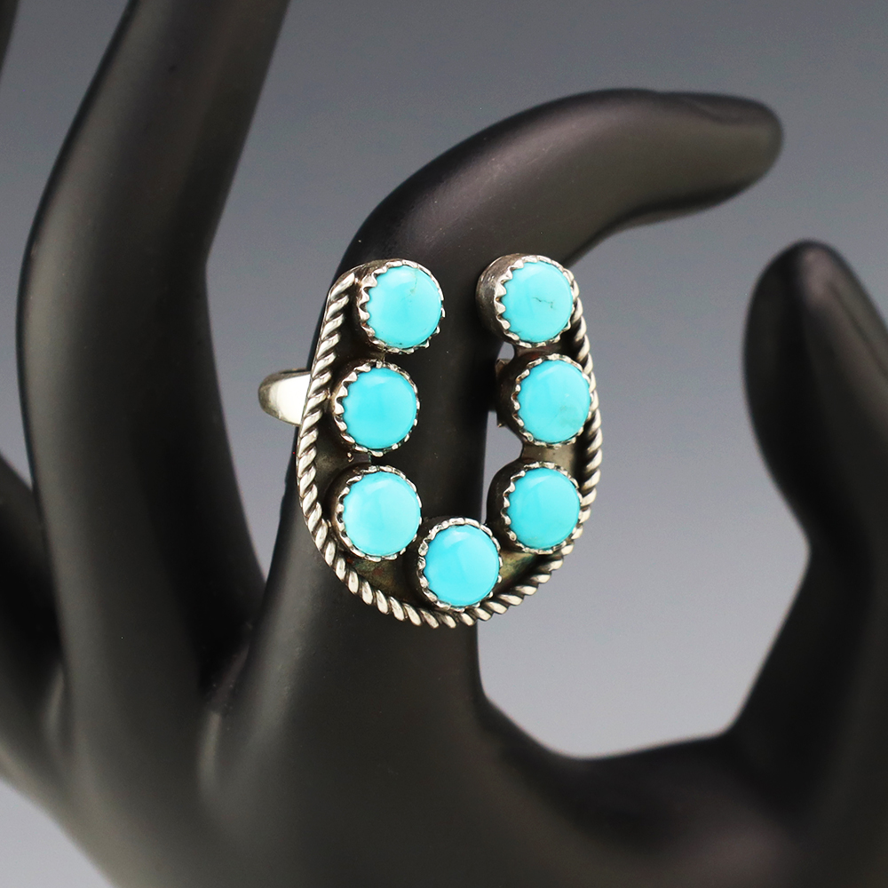 Amazing inlay work! Zuni jewelry makers, Nancy and Sheldon Westika created this magnificent ring. Made out of sterling silver and inlaid with Kingman Turquoise and Jet. Zuni artists are known for their lapidary work. The Westikas have been making jewelry since the 1970’s and they are known for their fine...