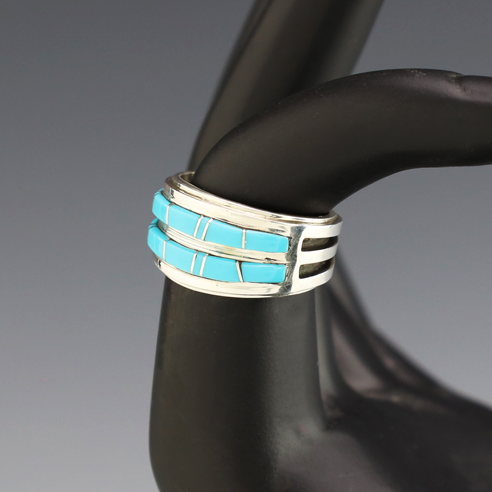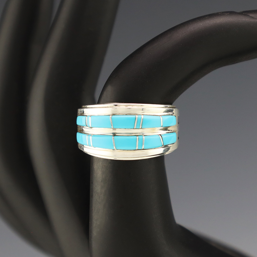Amazing inlay work! Zuni jewelry makers, Nancy and Sheldon Westika created this magnificent ring. Made out of sterling silver and inlaid with Kingman Turquoise and Jet. Zuni artists are known for their lapidary work. The Westikas have been making jewelry since the 1970’s and they are known for their fine...