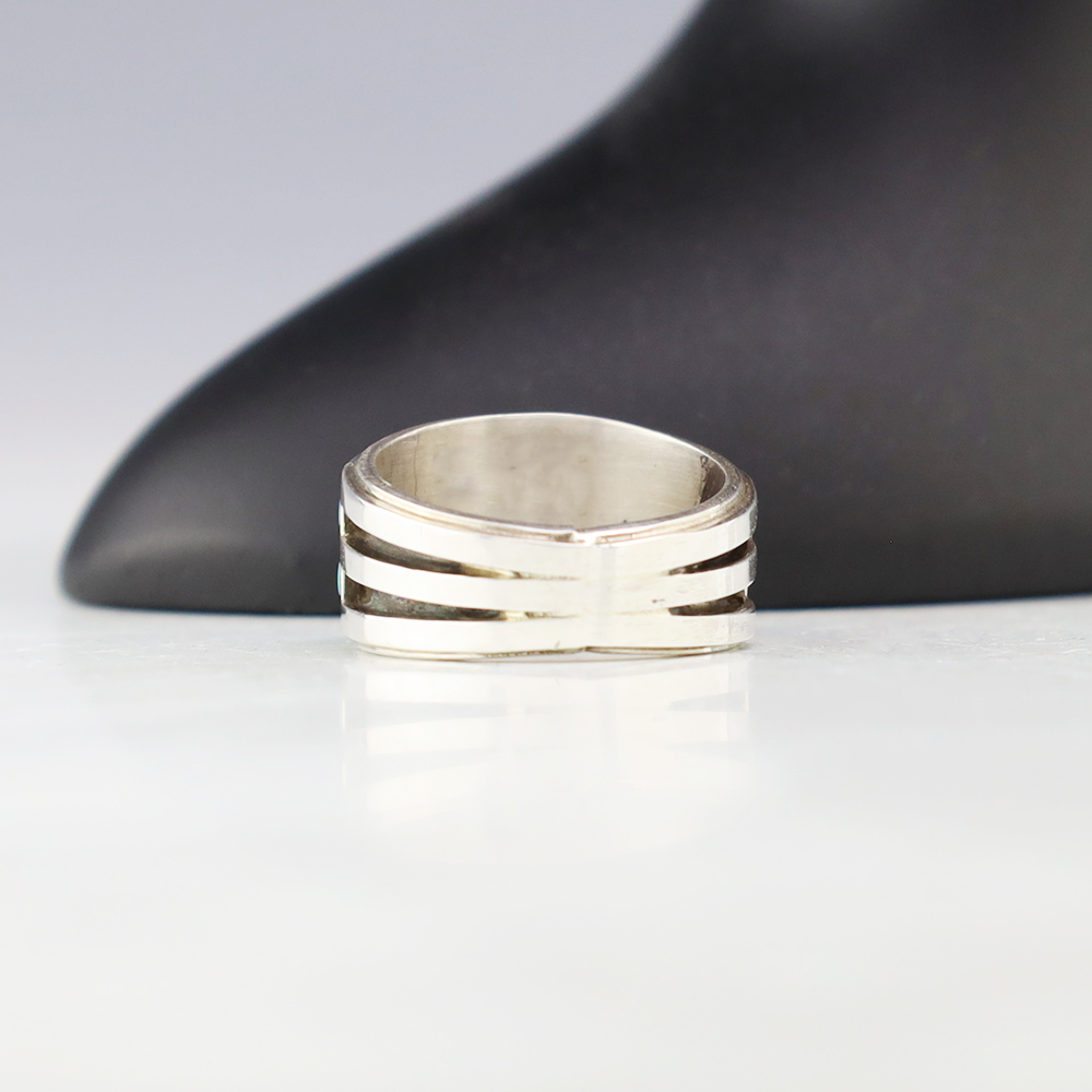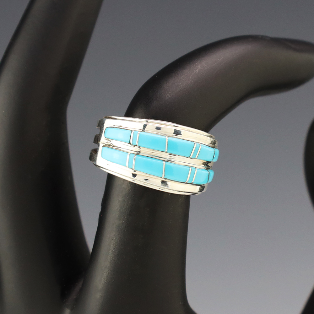 This ring is a great representation of hand made Navajo jewelry and will make a statement on your hand. Beautiful pieces of Turquoise are inlaid into a sterling silver setting. Handmade by Navajo artist Wilbert Muskett Jr. Weighs 6 grams. Size 6. Signed