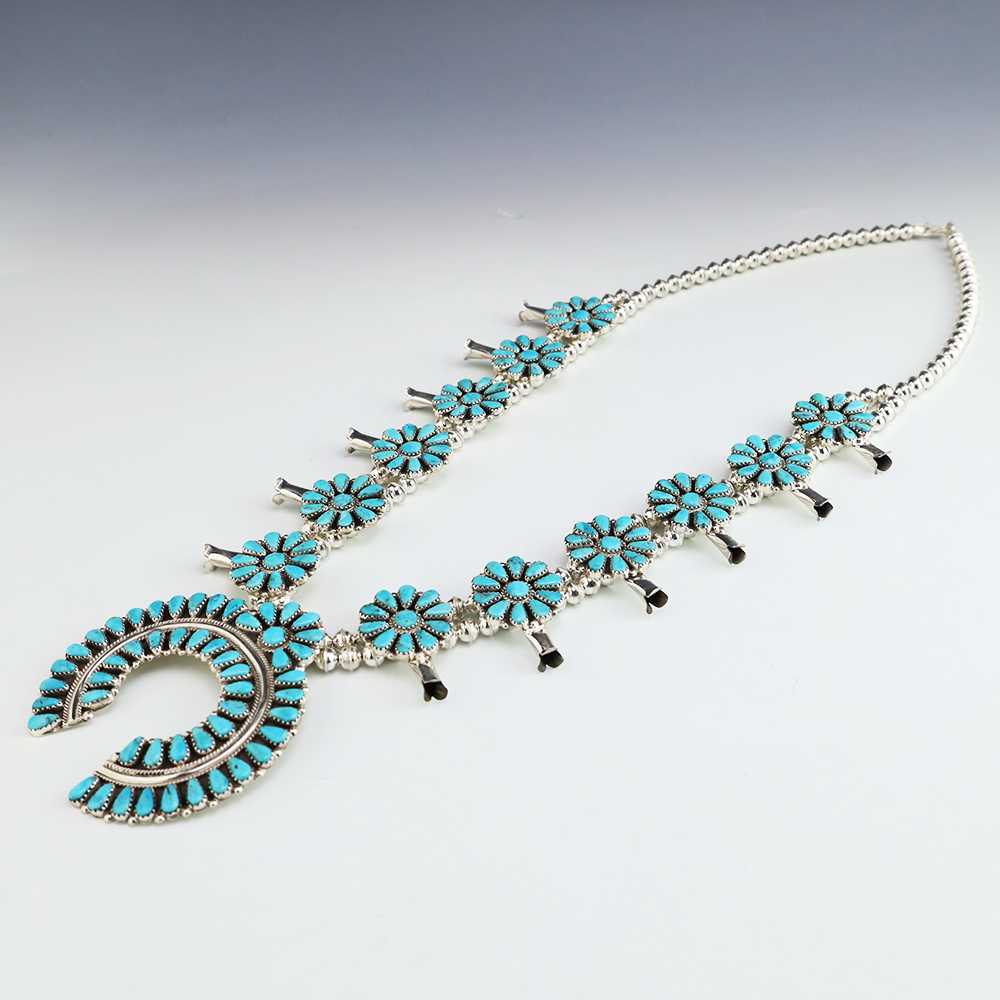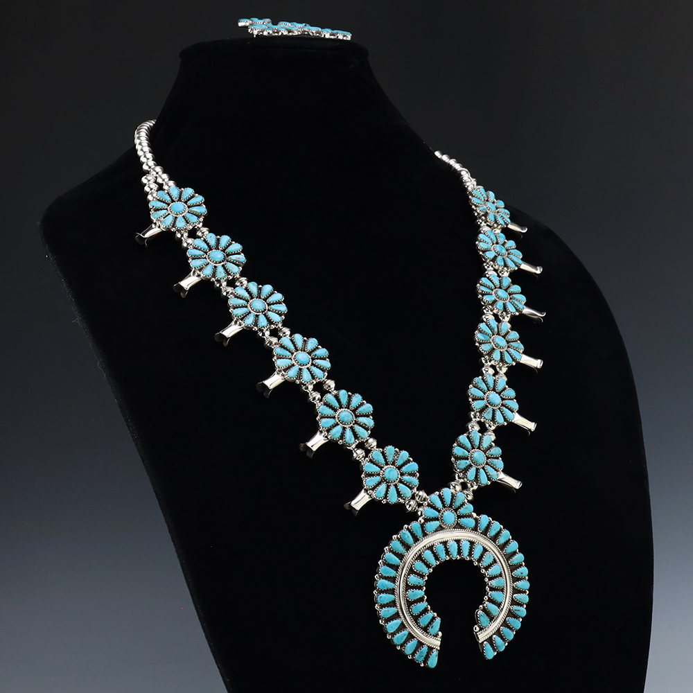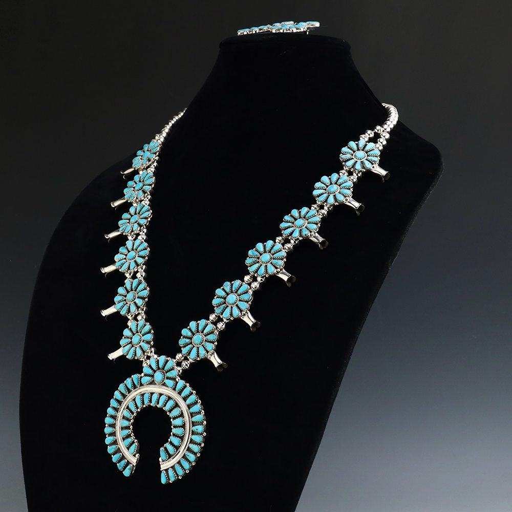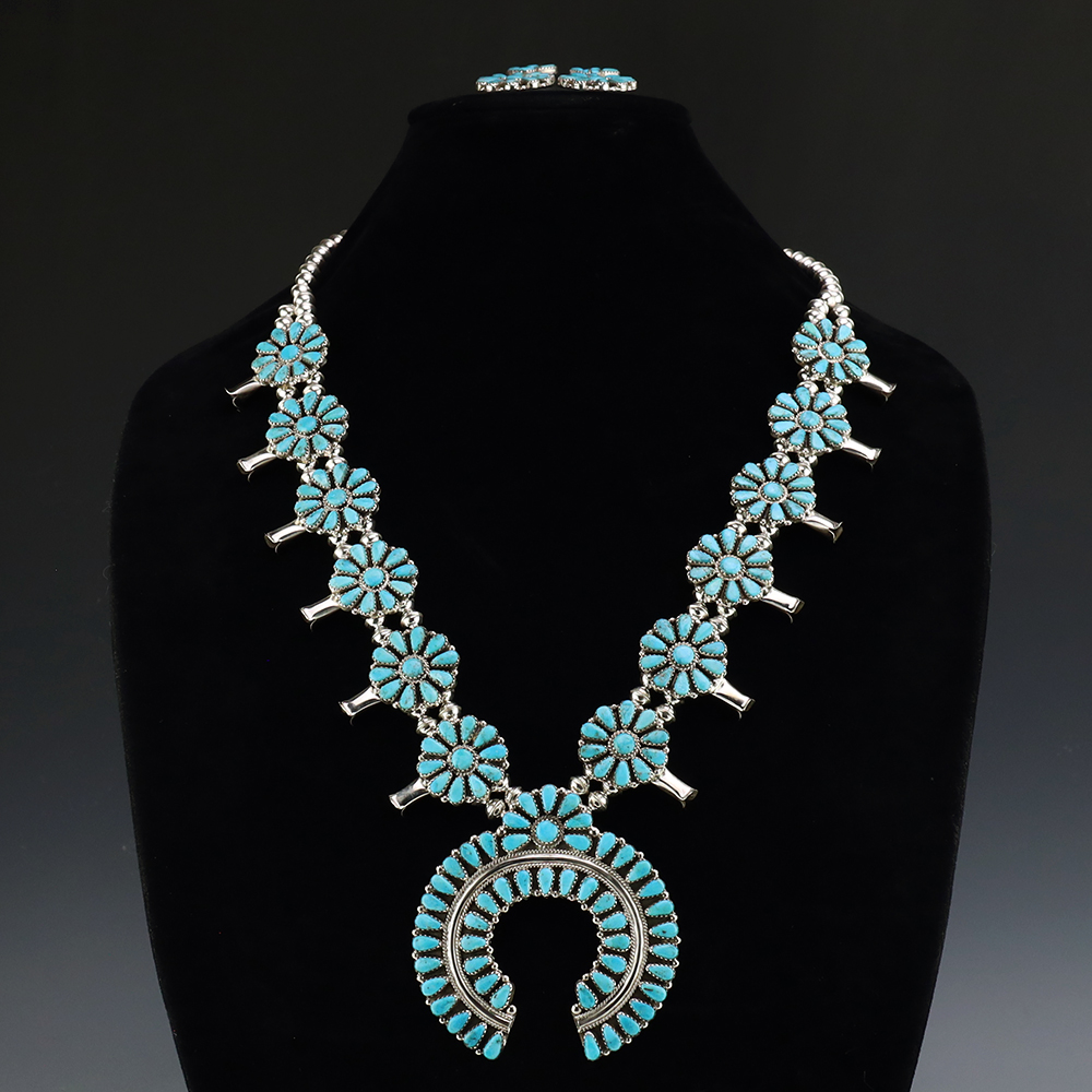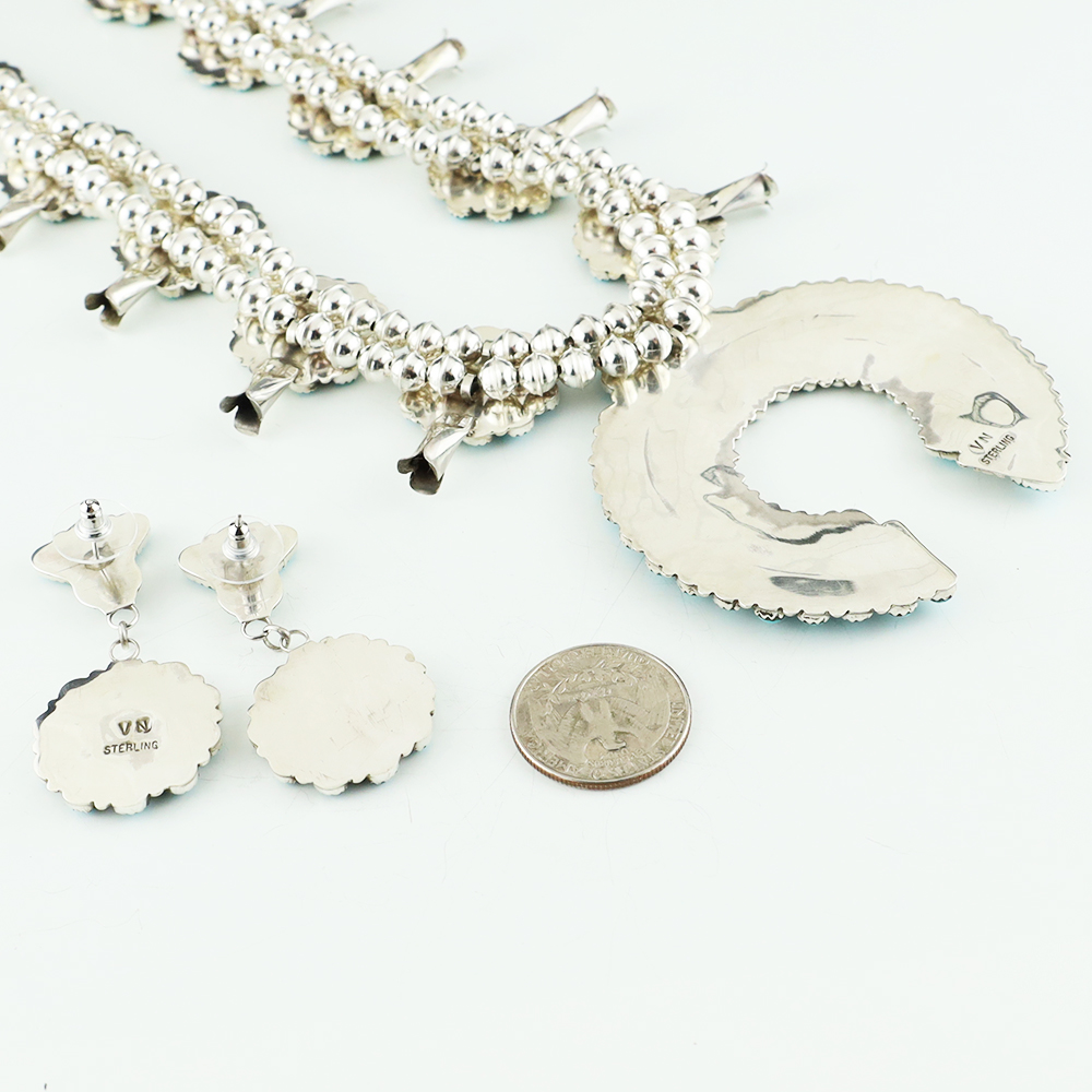 Navajo artist Violet Nez created this gorgeous squash blossom necklace. Sterling silver with Turquoise. The necklace is strung with sterling silver 6 mm beads. The necklace is finished off with a sterling silver hook and eye. A timeless beauty that you will enjoy for years to come. Comes with matching earrings. The necklace weighs 130 grams and the earrings weigh 14 grams. Signed.