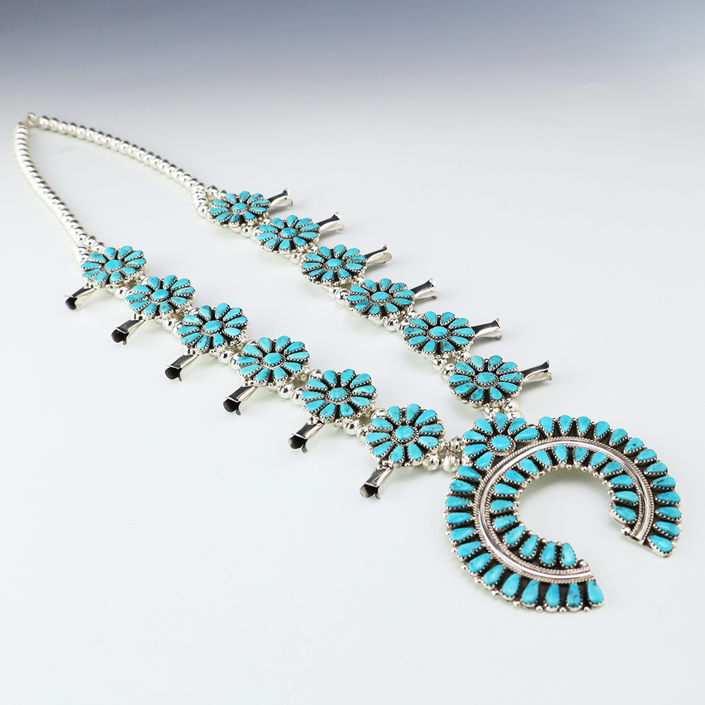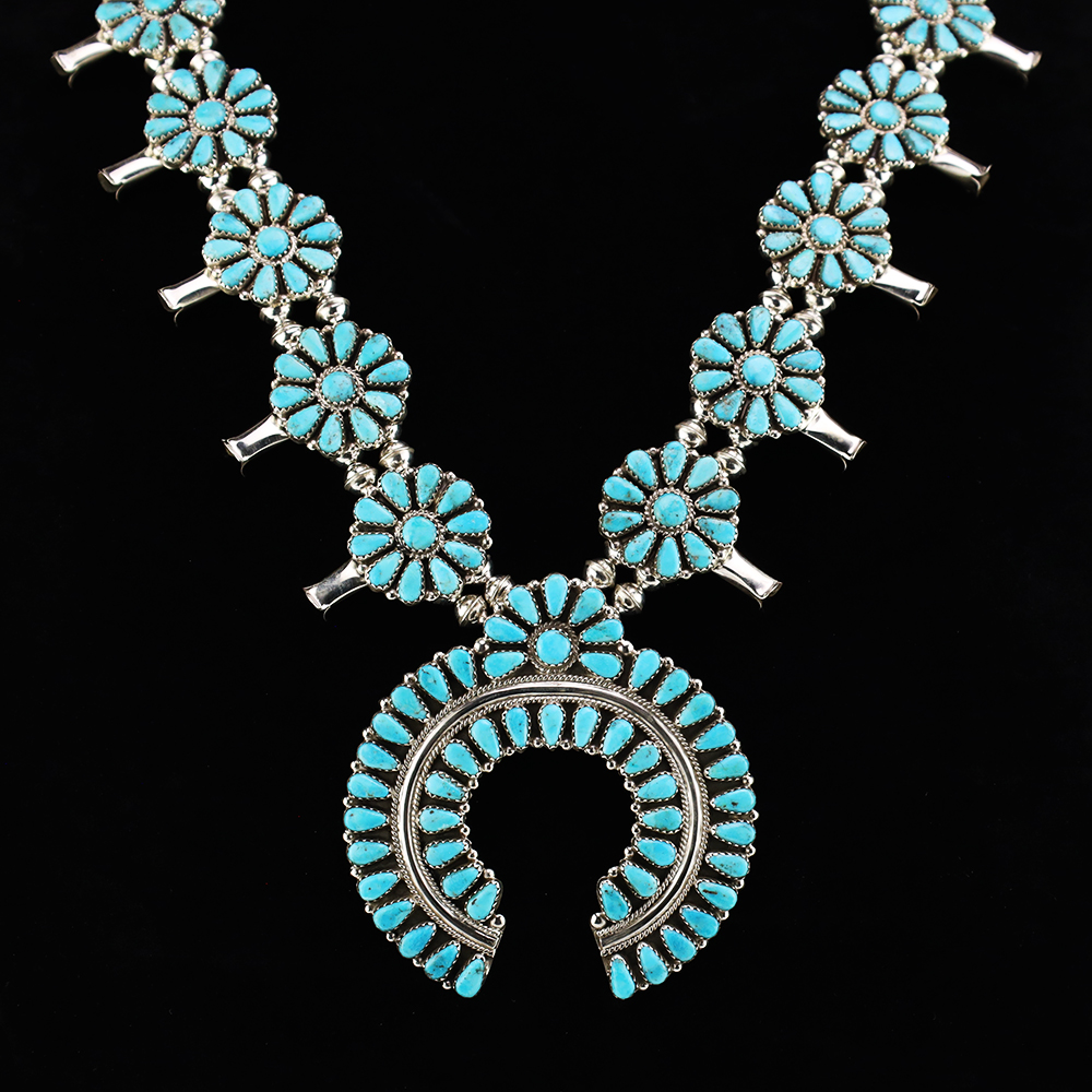 The Navajos began working with silver in the 19th century, and began making things like buckles, bridles, buttons, rings, canteens, hollow beads, earrings, crescent-shaped pendants (called “najas”), bracelets, crosses, powder chargers, tobacco canteens, and conchos (for belts). Their silversmithing skills has evolved and changed throughout the years, and in about 1880 Navajo silversmiths started to set turquoise in their silver work. Traditionally, Navajo artists worked with jewelry techniques like repousee and stamp work, but today they explored in other Native American jewelry making techniques like Zuni inlay work and Hopi overlay work.